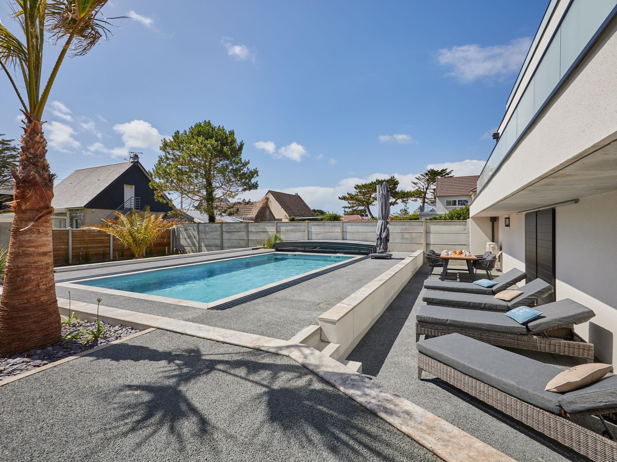 Modern single-family house " Denneweiller". In the resort, 300 m from the centre, in a quiet position, 160 m from the sea, 160 m from the beach. Private: property 600 m2 (fenced), beautiful garden to relax, indoor pool angular, heated (8 x 4 m, depth 150 cm, seasonal availability: 01.May. - 30.Oct.) with internal staircase and shutter cover. Parking (for 2 cars), single garage. Grocery 6 km, restaurant 300 m, bakery 6 km, bus stop "Mairie" 5 km, sandy beach "Denneville" 160 m. Sports harbour 14 km, golf course (18 hole) 38 km, sailing school 6 km, riding stable 6 km. Nearby attractions: Portbail 6 km, Carteret 14 km, Cherbourg 43 km, Granville 65 km, Coutances 39 km, Le Mont saint Michel 120 km.