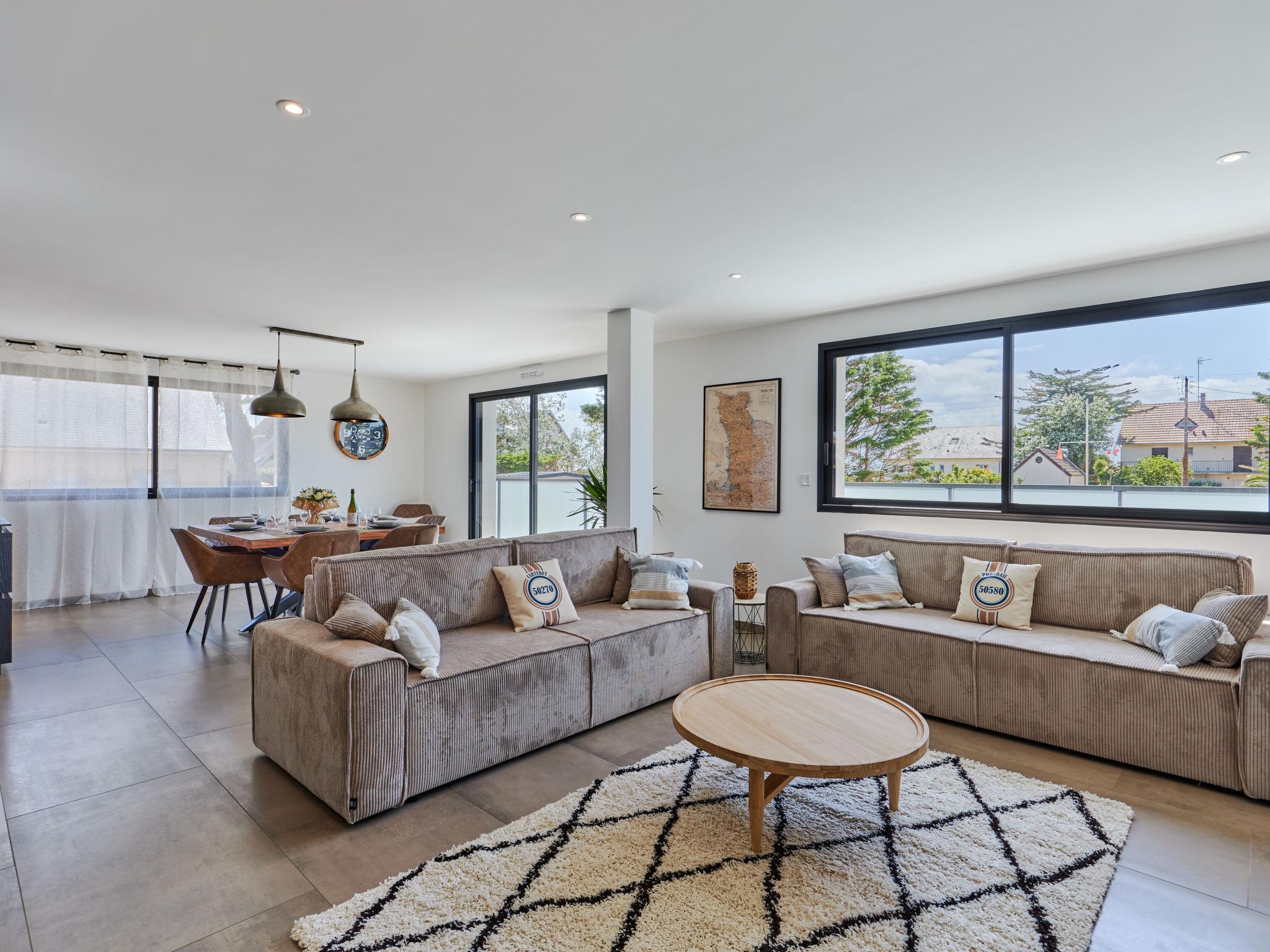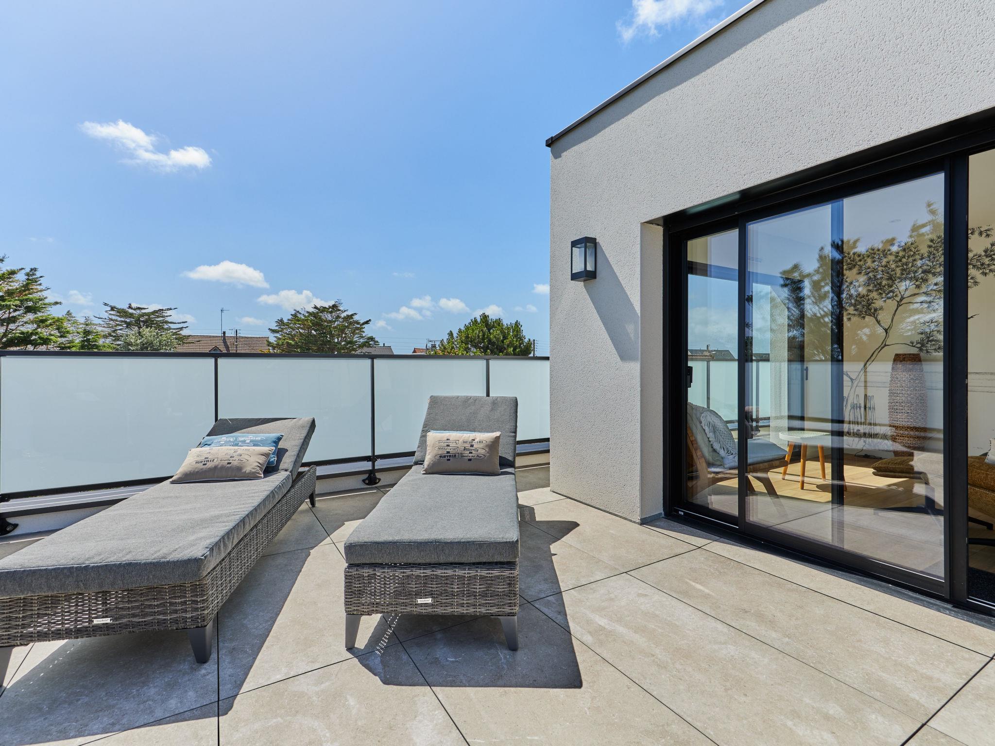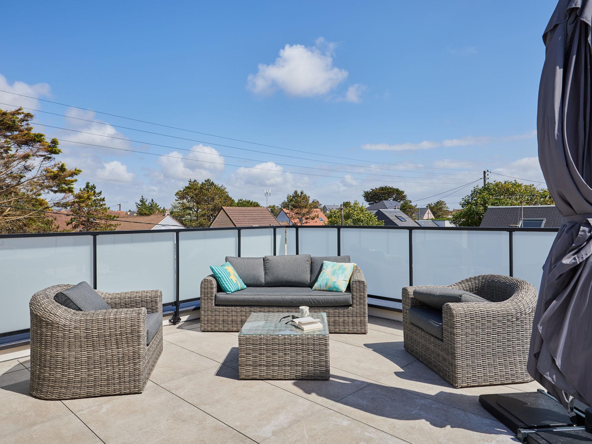" Denneweiller", 5-room house 135 m2 on 2 levels. Comfortable and modern furnishings: living/dining room with TV (flat screen). 1 room with Dressing room with 1 double bed (160 cm, length 200 cm), shower. Open kitchen (oven, dishwasher, 4 induction hot plates, toaster, kettle, microwave, freezer, electric coffee machine, Capsules for coffee machine (nespresso), steamer). Floor heating. On the lower ground floor: with separate WC. Upper floor: 2 rooms, each room with 1 double bed (1 x 160 cm, length 200 cm). Lounge. Bathroom, sep. WC. Floor heating. Large terrace 40 m2, south facing position and west facing position. Terrace furniture, barbecue, deck chairs (6). Side view of the sea. Facilities: washing machine. Internet (WiFi, free). Please note: maximum 1 pet/ dog allowed. Smoke alarm.