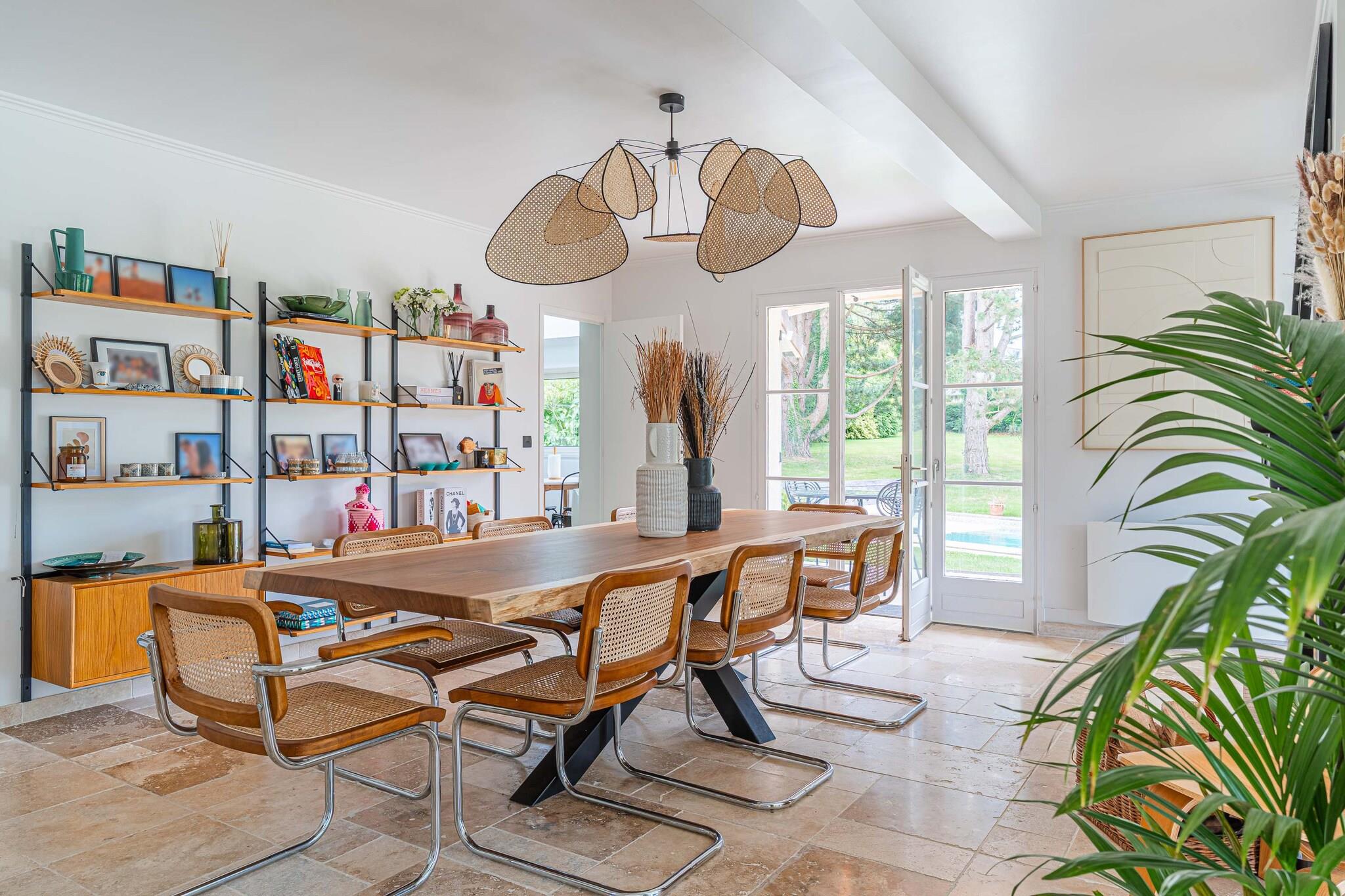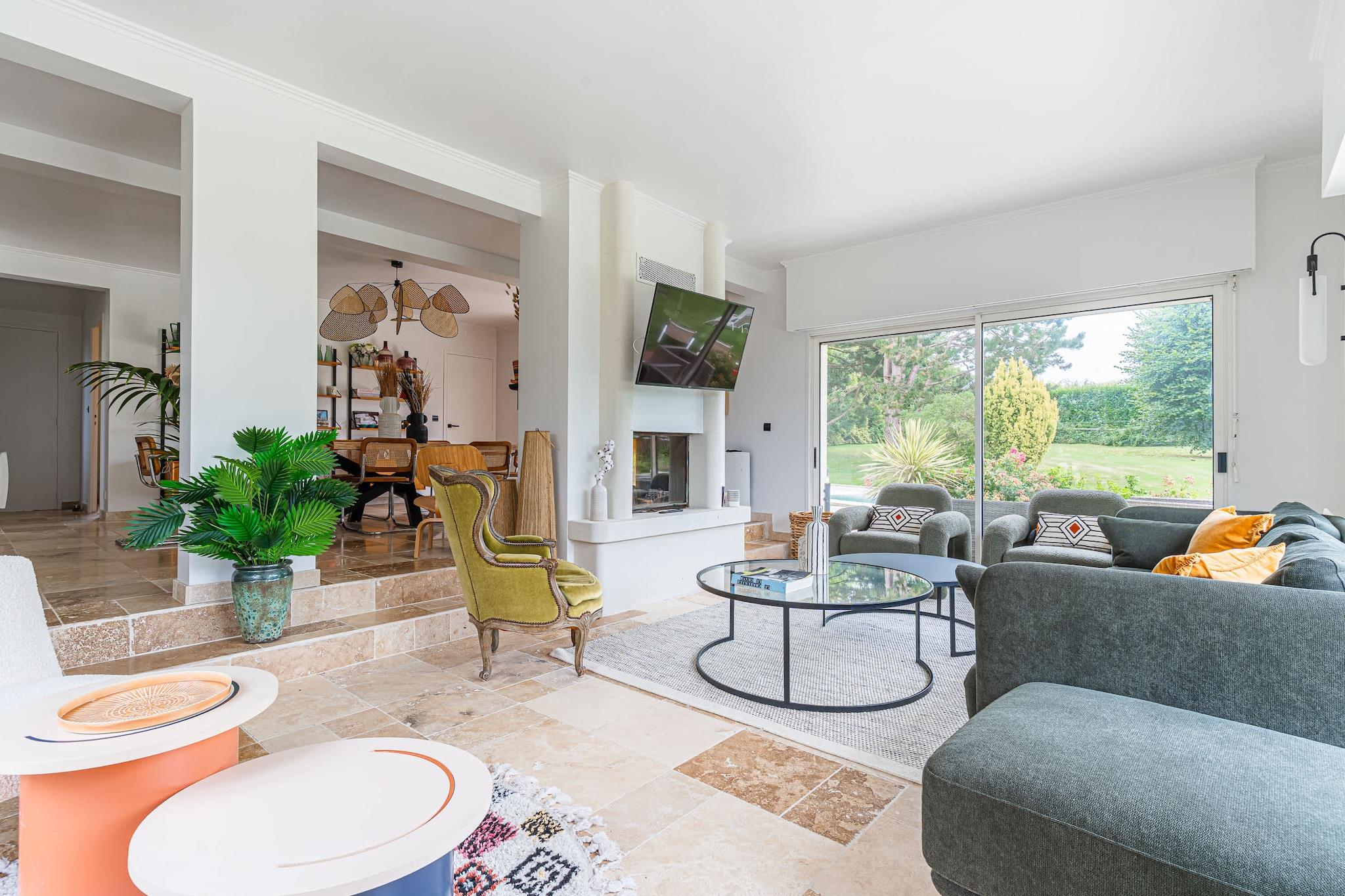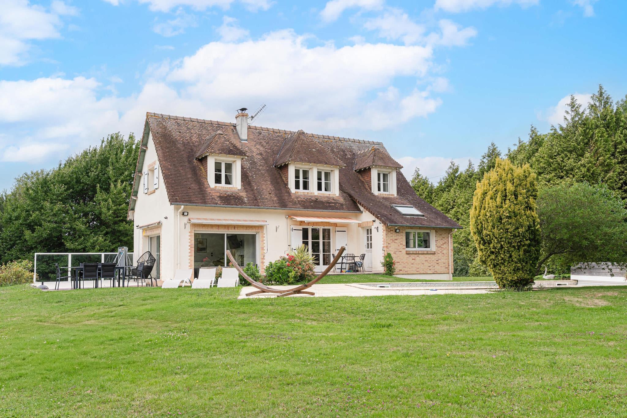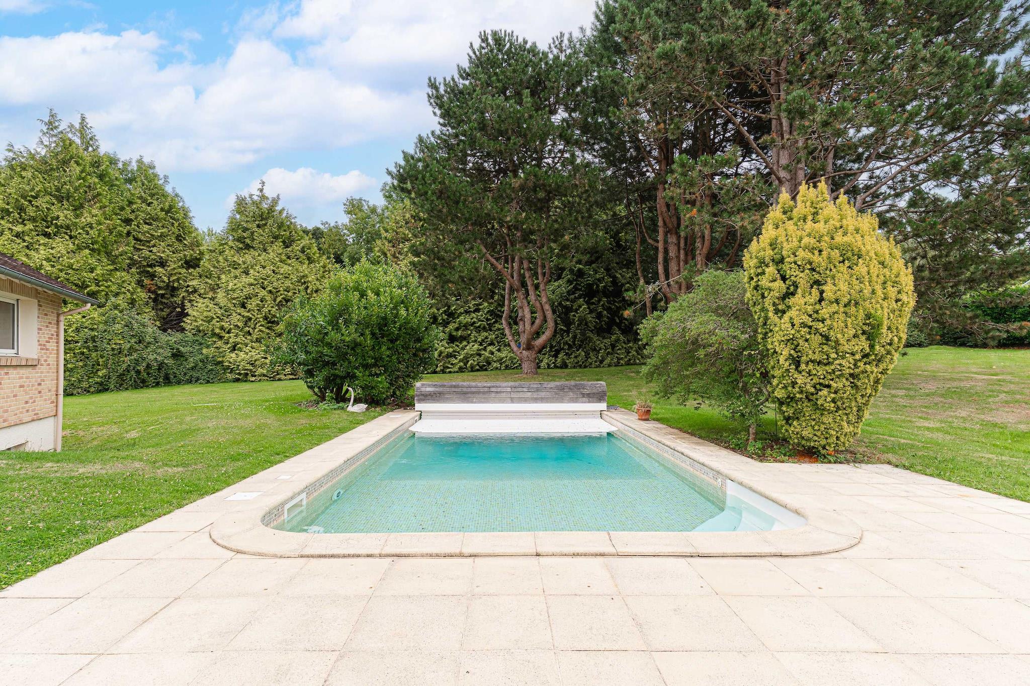 Enestående familievilla med swimmingpool, padelbane og have – nær Deauville Velkommen til dit drømmehjem i Normandiet – beliggende i grønne omgivelser i Englesqueville, kun få minutter fra Deauville og havet! Denne villa på 240 m², designet til komfortabelt at rumme op til 12 personer, er ideel til ophold med familie eller venner. Den kombinerer plads, komfort og underholdning, beliggende i en 5.000 m² skovklædt have med privat swimmingpool, padelbane, trampolin, gynge og rutsjebane. Et sandt paradis for både unge og gamle!