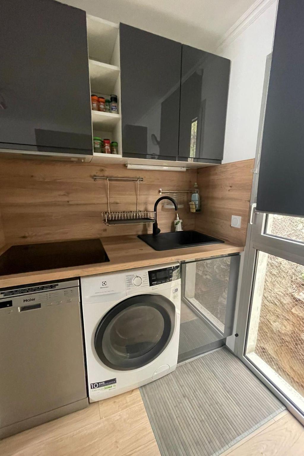 Un salon avec canapé convertible 2 places TV DVD et mini chaîne, une chambre avec un lit 2 places, une cuisine aménagée avec tous les accessoires indispensables, table induction, four, four micro onde, cafetière, lave-vaisselle, une salle de bains avec baignoire, un petit coffre.