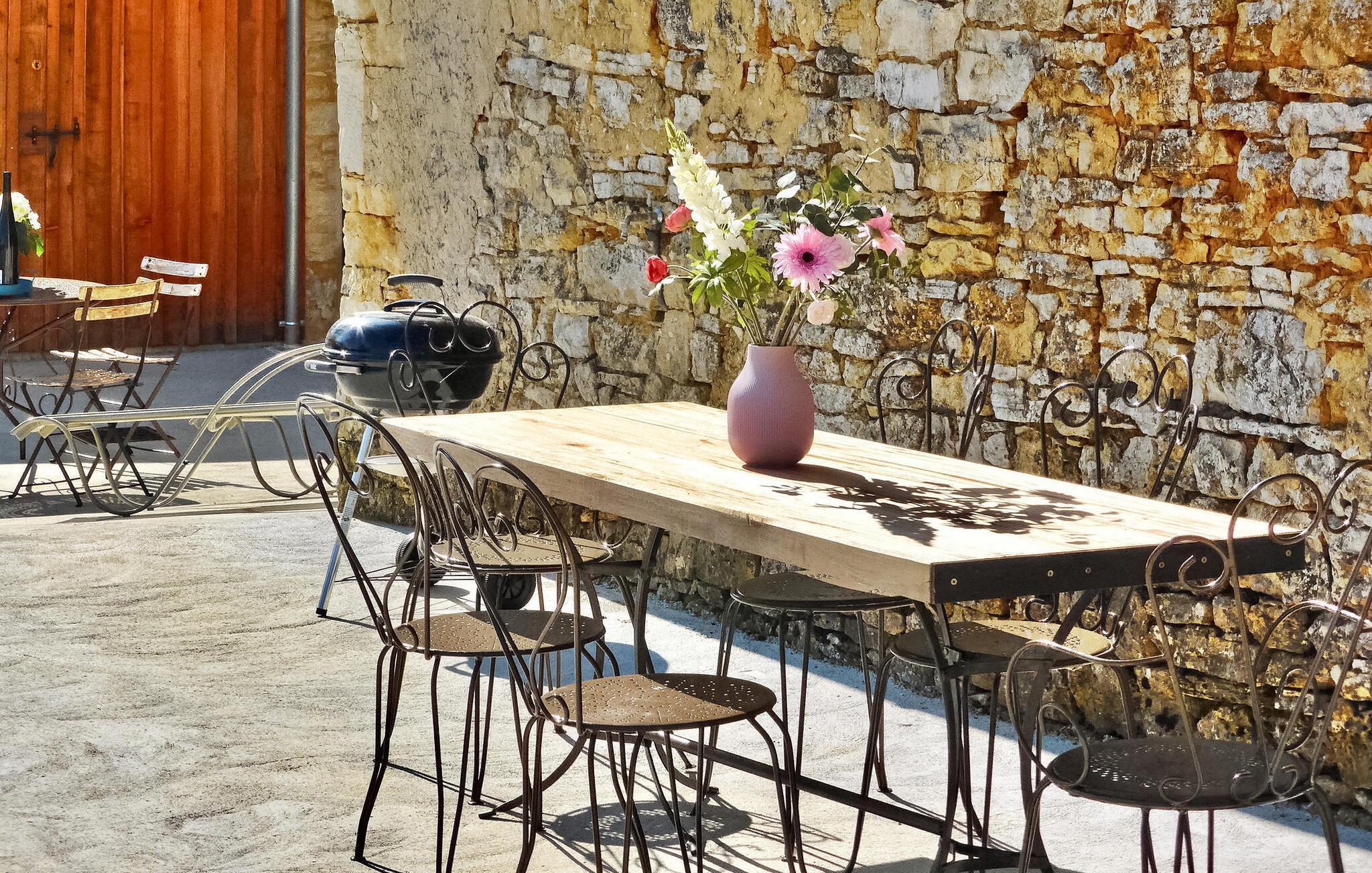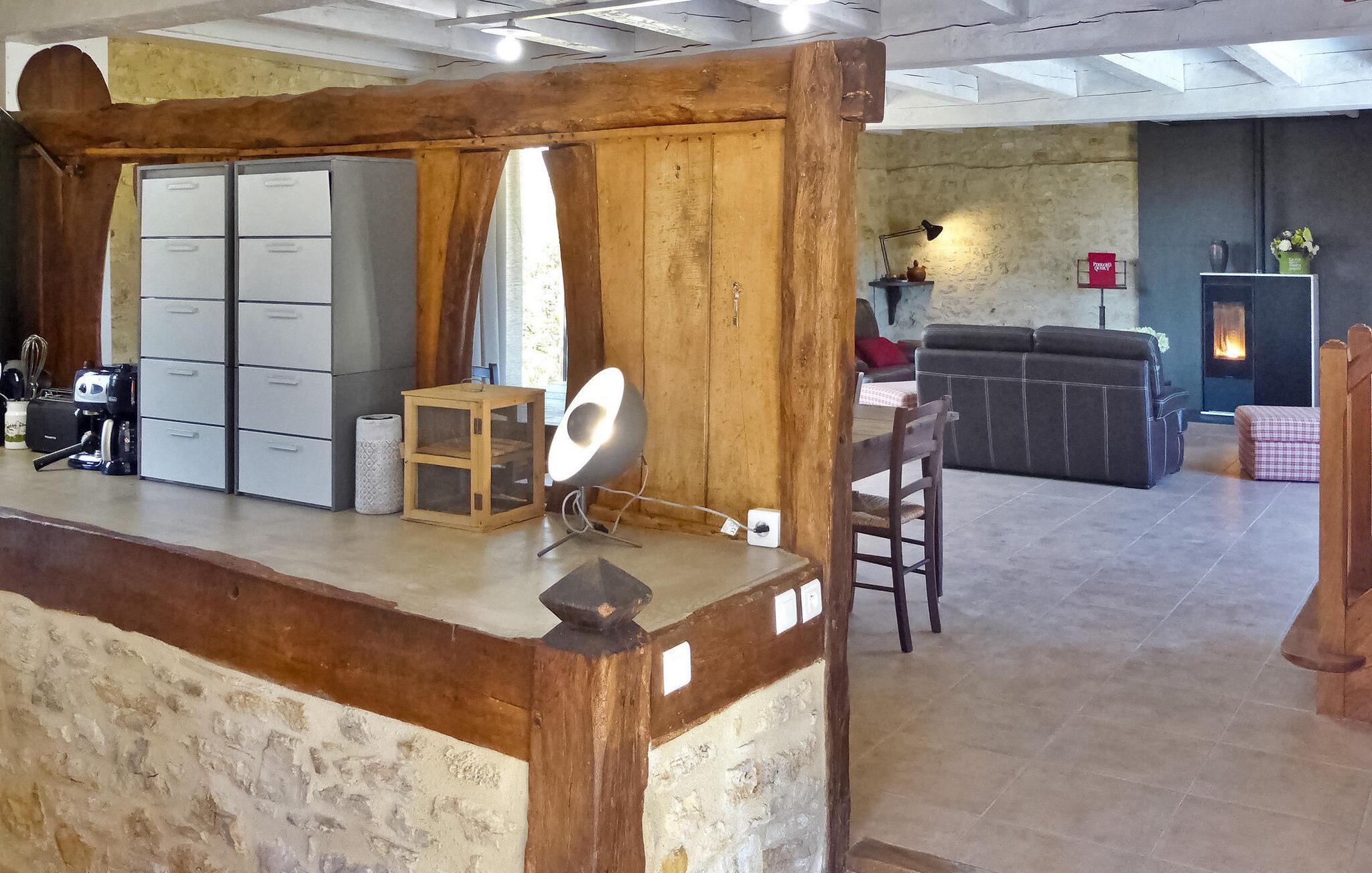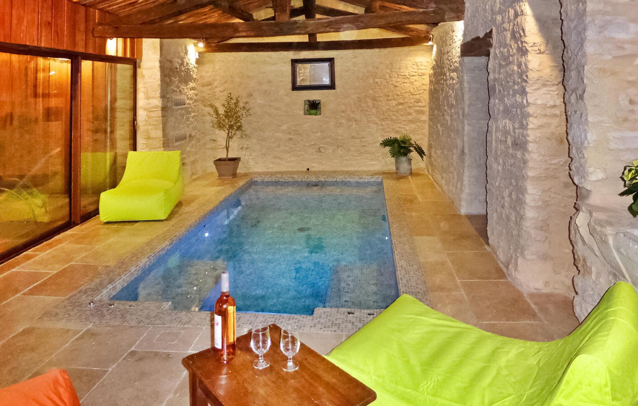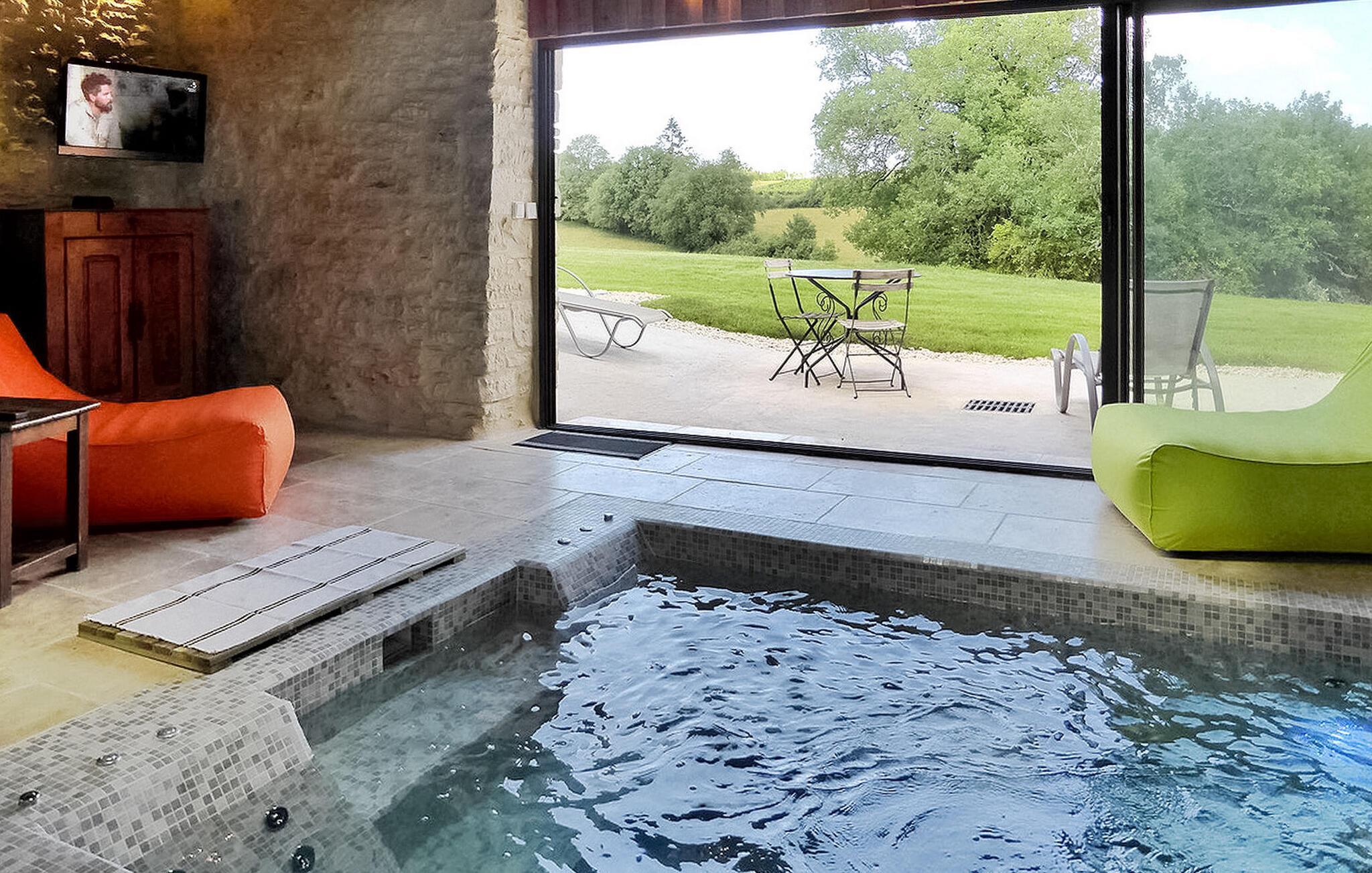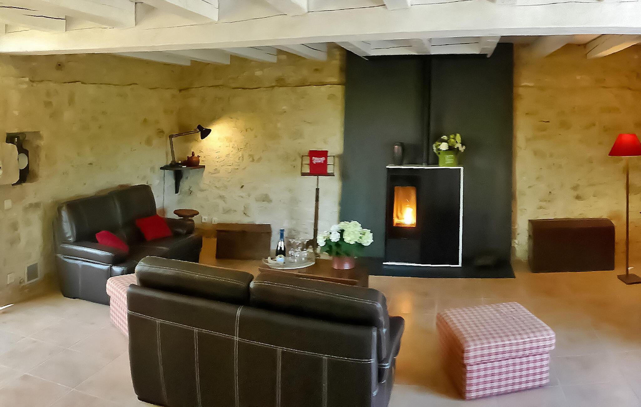 Flugt til en charmerende ferieudlejning i Dordogne Perigord, med et smukt stenhus med en indendørs swimmingpool og spa. Beliggende i rolige landlige omgivelser i en lille landsby, tilbyder dette dejlige tilflugtssted afslapning og komfort. Stueetagen byder velkommen med et rummeligt opholdsområde, komplet med træpilleovn til hyggelige aftener. Opholdsrummet integrerer problemfrit et landmands spisebord og et veludstyret køkken prydet med antikke metalværkstedsskabe. Ovenpå tilbyder værelserne med aircondition komfort og bekvemmelighed, som alle har tv. Derudover tilbyder et studieværelse et perfekt arbejds- eller studierum. Forkæl dig selv med det afslappende poolområde, der kan prale af en indendørs mosaikpool og spa med modstrømssvømning, et brusebad og et loungeområde møbleret med tv og musikapparater. Der er badekåber og hjemmesko til din ultimative komfort. Poolområdet forbindes ubesværet med terrassen og en gårdhave gennem store vinduer, hvilket udvisker grænserne mellem indendørs og udendørs ophold. Udenfor kan du nyde rigelig plads til fritid og afslapning midt i de naturskønne omgivelser. Oplev ro og komfort i dette bemærkelsesværdige feriested, hvor fusionen af indendørs og udendørs lækkerier lover et mindeværdigt ophold i hjertet af Dordogne Perigord.