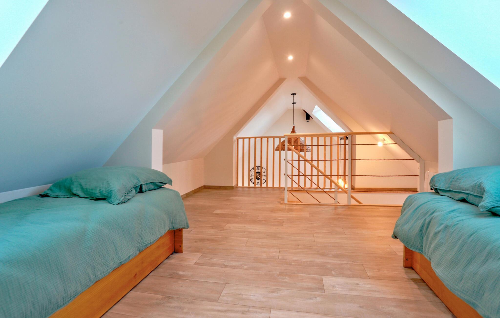 Dette lysfyldte, moderne feriehus er en sand oase af komfort og ro. Store vinduespartier og ovenlys bringer dagslyset ind i de rummelige opholdsrum, mens den katedral-lignende spisestue skaber en unik ramme om fælles måltider. Den åbne planløsning forbinder boligen med den omkringliggende natur – ideelt til afslappende timer.