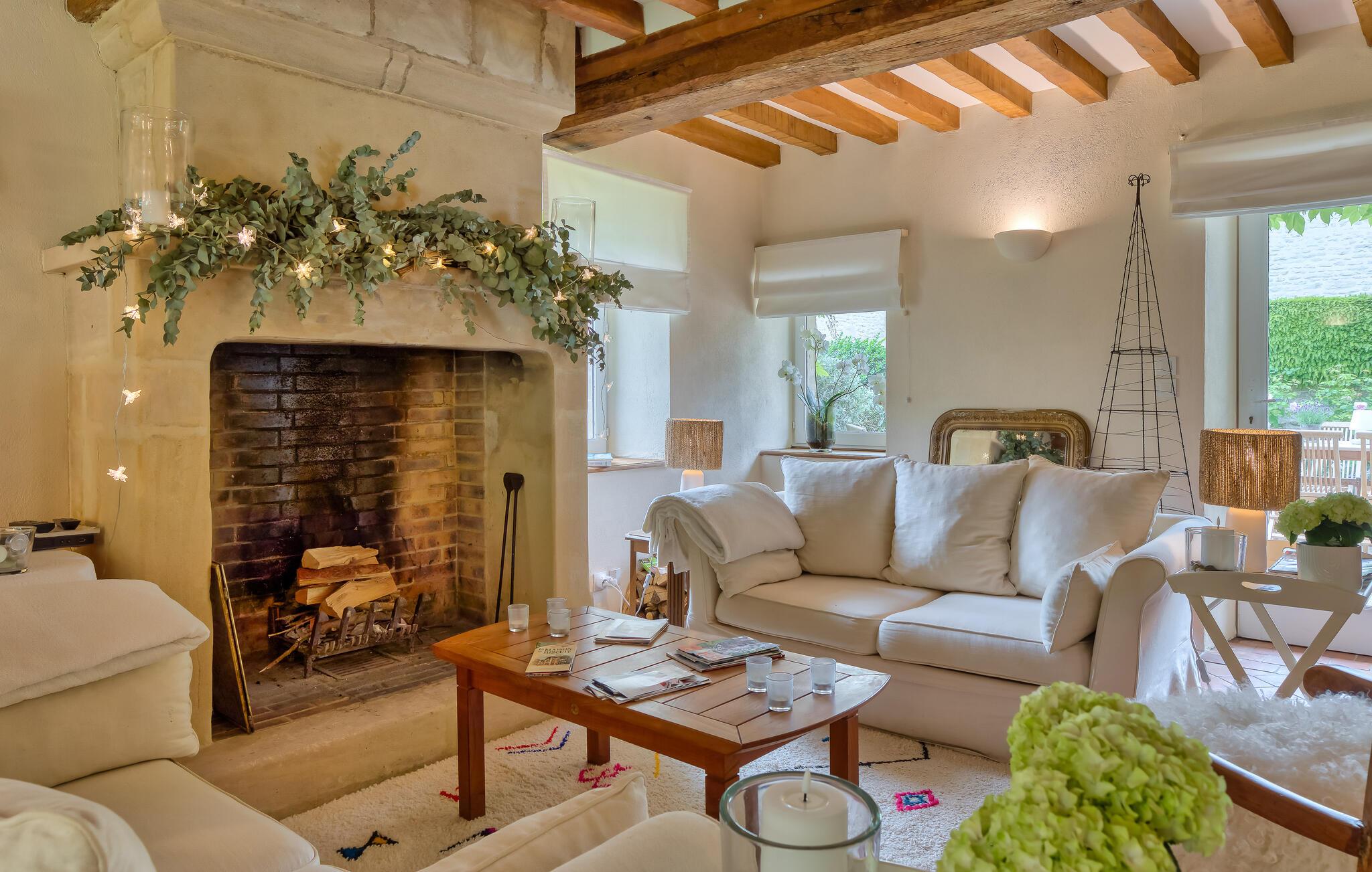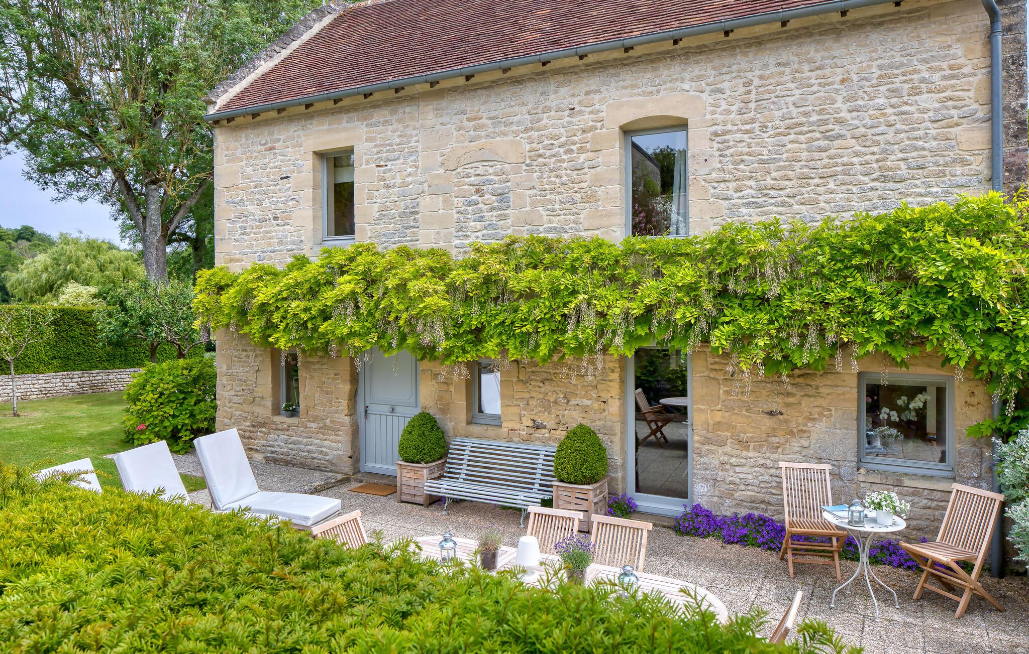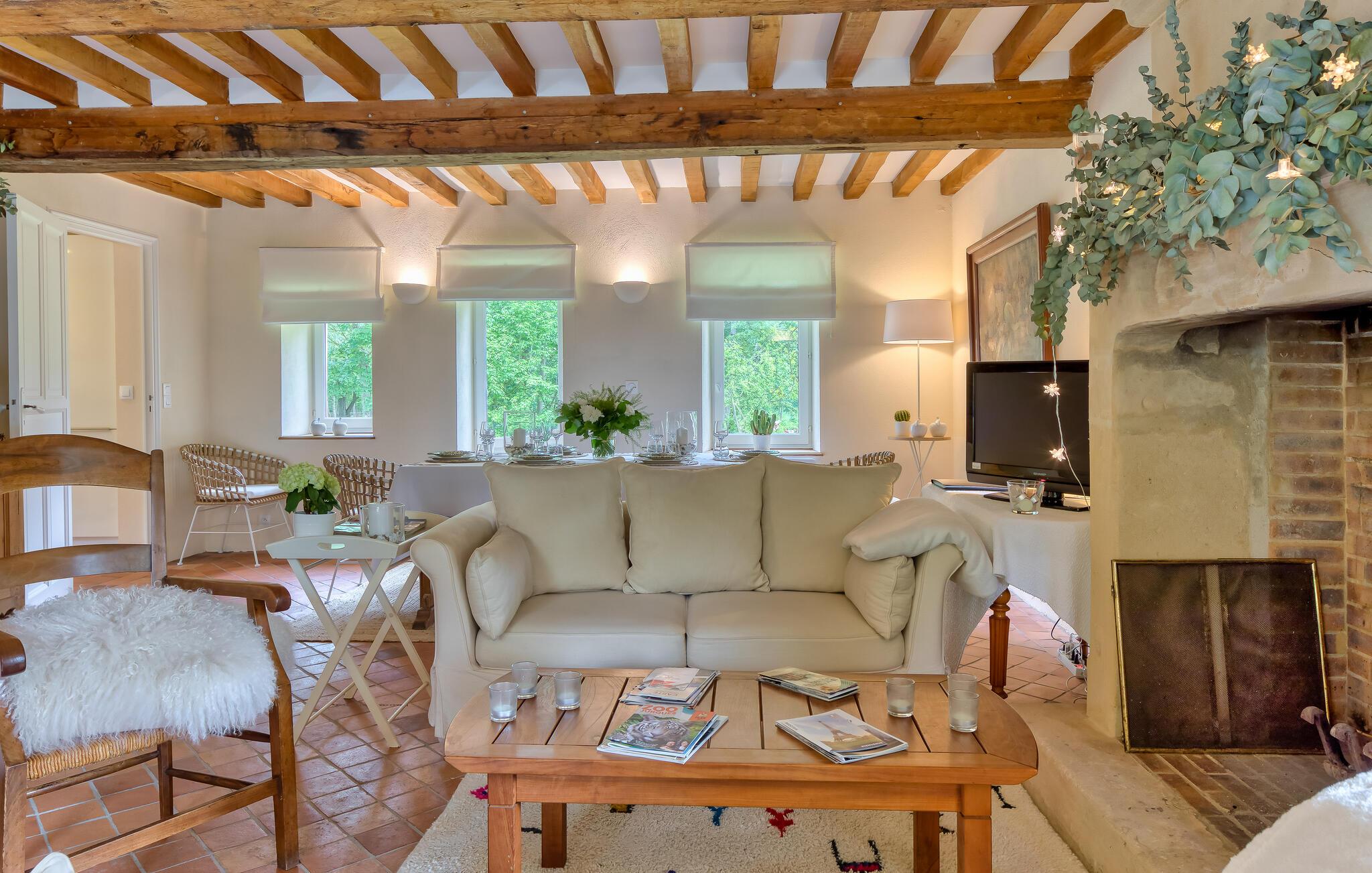 Ro og afslapning i det grønne! Det kan I opnå, hvis I vælger at holde jeres ferie i dette normanniske landhus fra det 19. århundrede. Slap af i den yderst velplejede have og spis jeres måltider på den solforkælede grillterrasse. Græsplænen er delvist omgivet af vandløb, og I kan gå herlige ture på den skovdækkede ejendom. I stuen er der en åben pejs, som er med til at gøre også de kølige eftermiddage til en hyggelig oplevelse. Mod forespørgsel kan I få stillet en strandkabin til rådighed i Bernières-sur-Mer, 8,5 km herfra. Opdag Juno Beach og de andre landingsstrande af de Allierede under 2. Verdenskrig. Her bor I mellem Caen og Bayeux, det helt rette sted til at opleve denne historierige region. I kan spille golf på Golf d’Omaha Beach (29 km) eller Golf Blue Green Caen i Biéville-Beuville (15 km), og I kan ride i Bernières-sur-Mer (11 km). For afveksling sørger også tennisbanerne i Thaon (3 km) og minigolfanlægget i Courseulles-sur-Mer (8 km). Kun 50 km mod øst ligger landskabet Pays d'Auge med hestegårde, æbleplantager og en æblevinsrute, og også Côte Fleurie, blomsterkysten, er et herligt mål for en dagstur. Langs denne kyst venter seværdige byer som Cabourg, Deauville, Trouville-sur-mer og Honfleur.