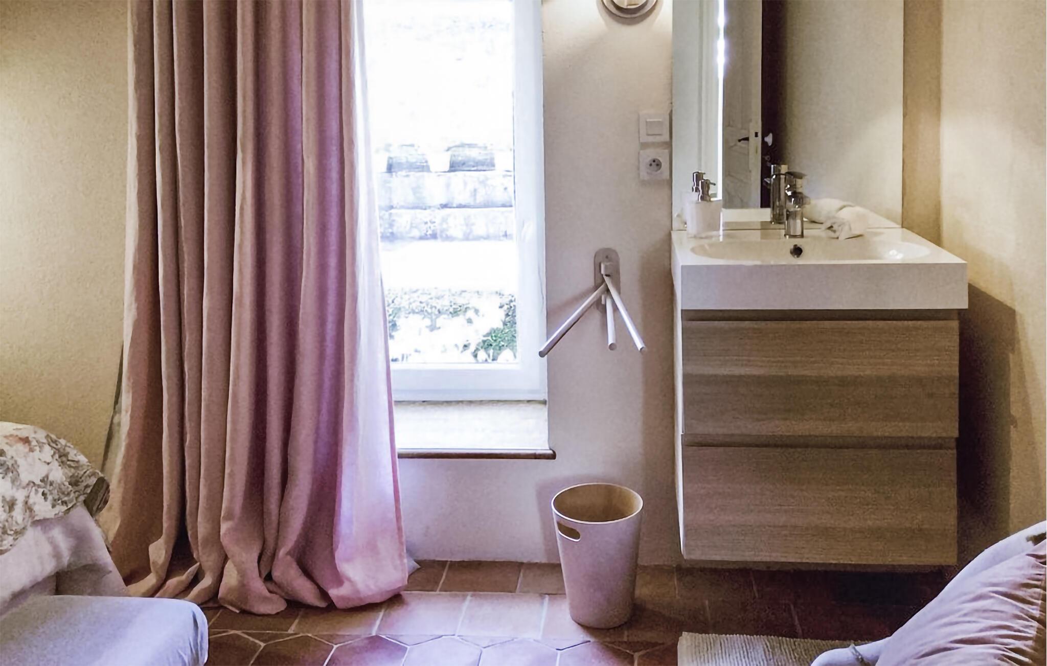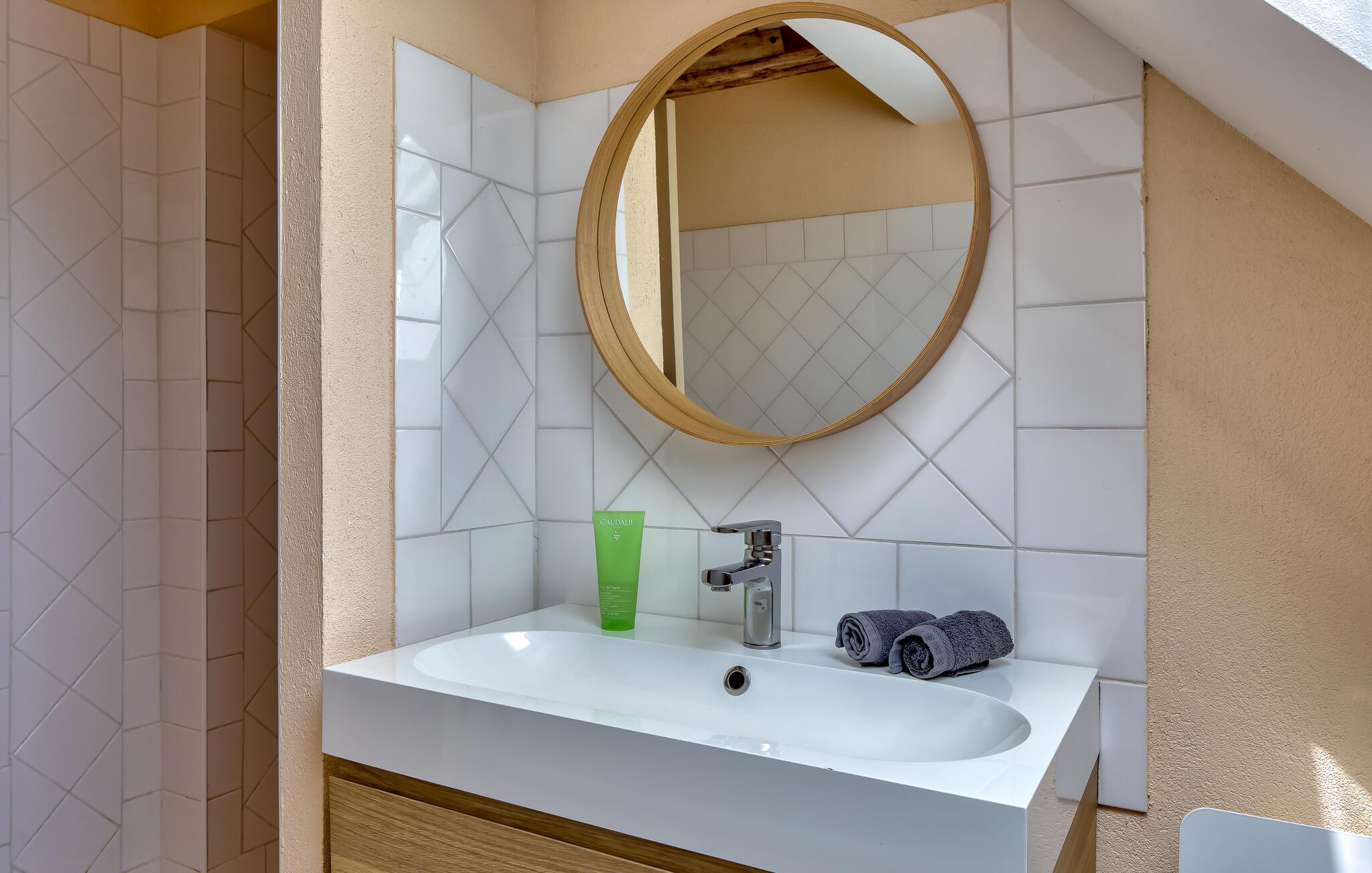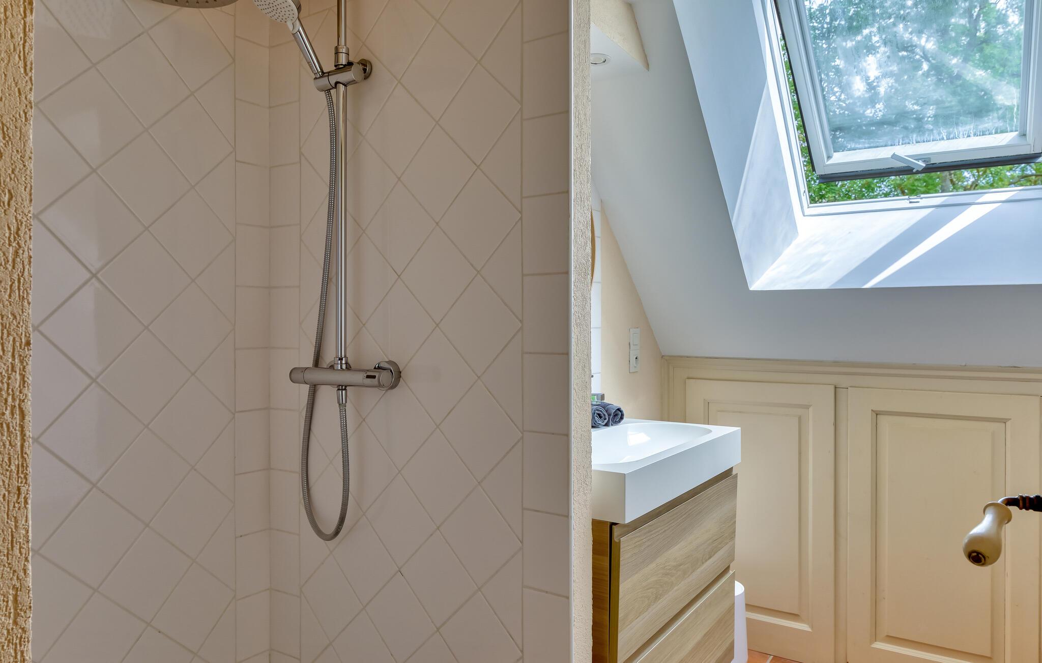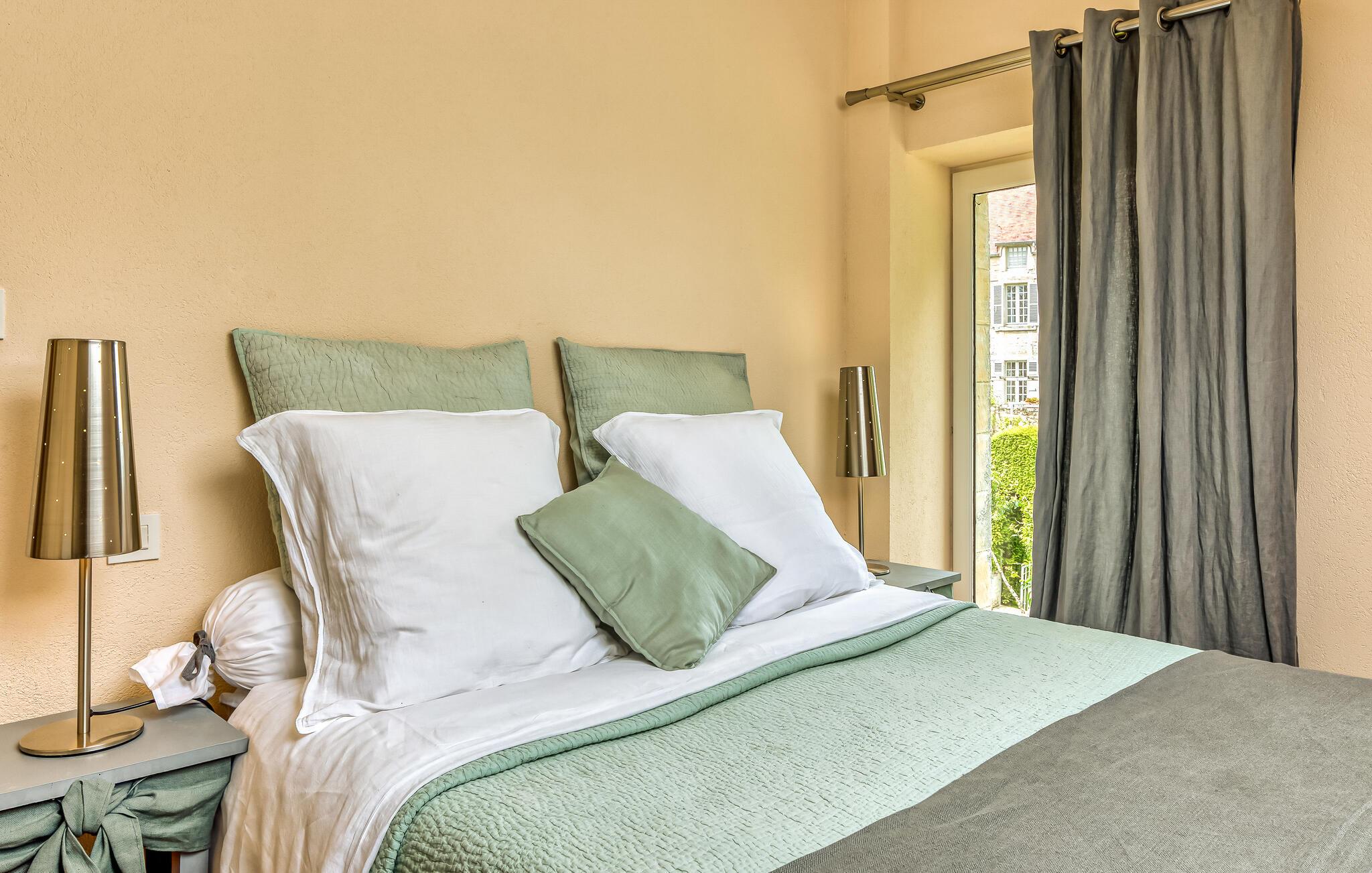 Ro og afslapning i det grønne! Det kan I opnå, hvis I vælger at holde jeres ferie i dette normanniske landhus fra det 19. århundrede. Slap af i den yderst velplejede have og spis jeres måltider på den solforkælede grillterrasse. Græsplænen er delvist omgivet af vandløb, og I kan gå herlige ture på den skovdækkede ejendom. I stuen er der en åben pejs, som er med til at gøre også de kølige eftermiddage til en hyggelig oplevelse. Mod forespørgsel kan I få stillet en strandkabin til rådighed i Bernières-sur-Mer, 8,5 km herfra. Opdag Juno Beach og de andre landingsstrande af de Allierede under 2. Verdenskrig. Her bor I mellem Caen og Bayeux, det helt rette sted til at opleve denne historierige region. I kan spille golf på Golf d’Omaha Beach (29 km) eller Golf Blue Green Caen i Biéville-Beuville (15 km), og I kan ride i Bernières-sur-Mer (11 km). For afveksling sørger også tennisbanerne i Thaon (3 km) og minigolfanlægget i Courseulles-sur-Mer (8 km). Kun 50 km mod øst ligger landskabet Pays d'Auge med hestegårde, æbleplantager og en æblevinsrute, og også Côte Fleurie, blomsterkysten, er et herligt mål for en dagstur. Langs denne kyst venter seværdige byer som Cabourg, Deauville, Trouville-sur-mer og Honfleur.