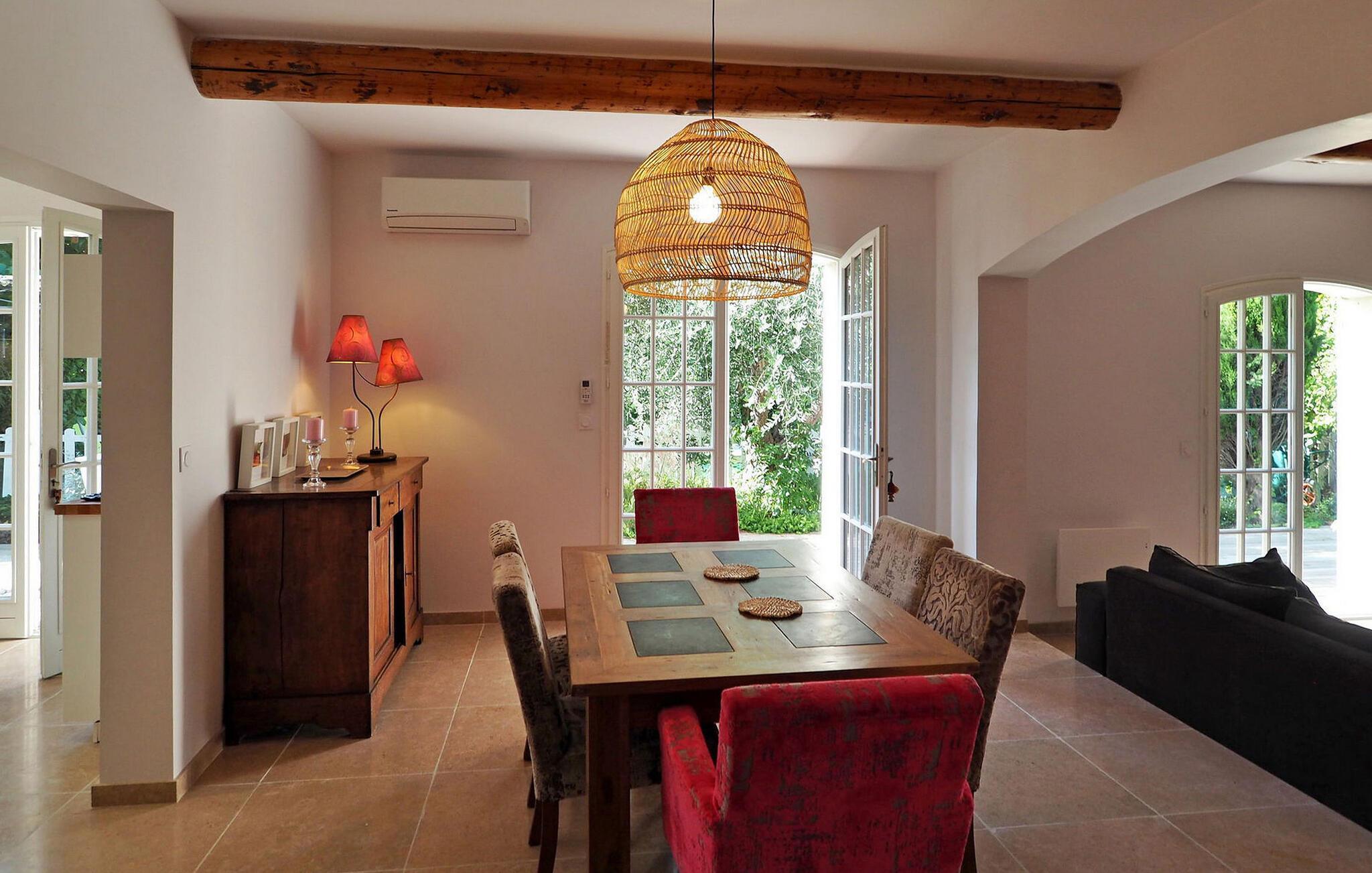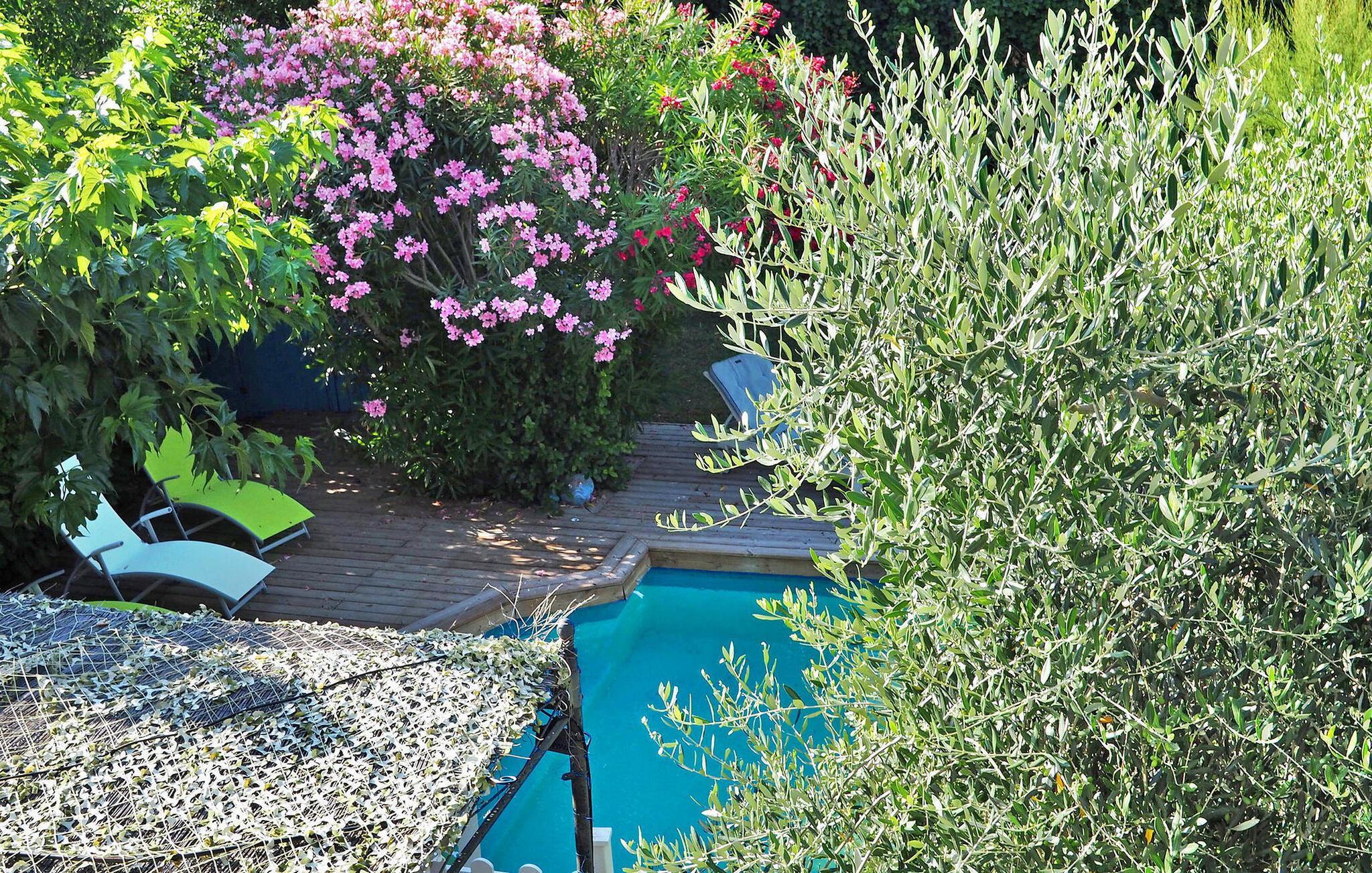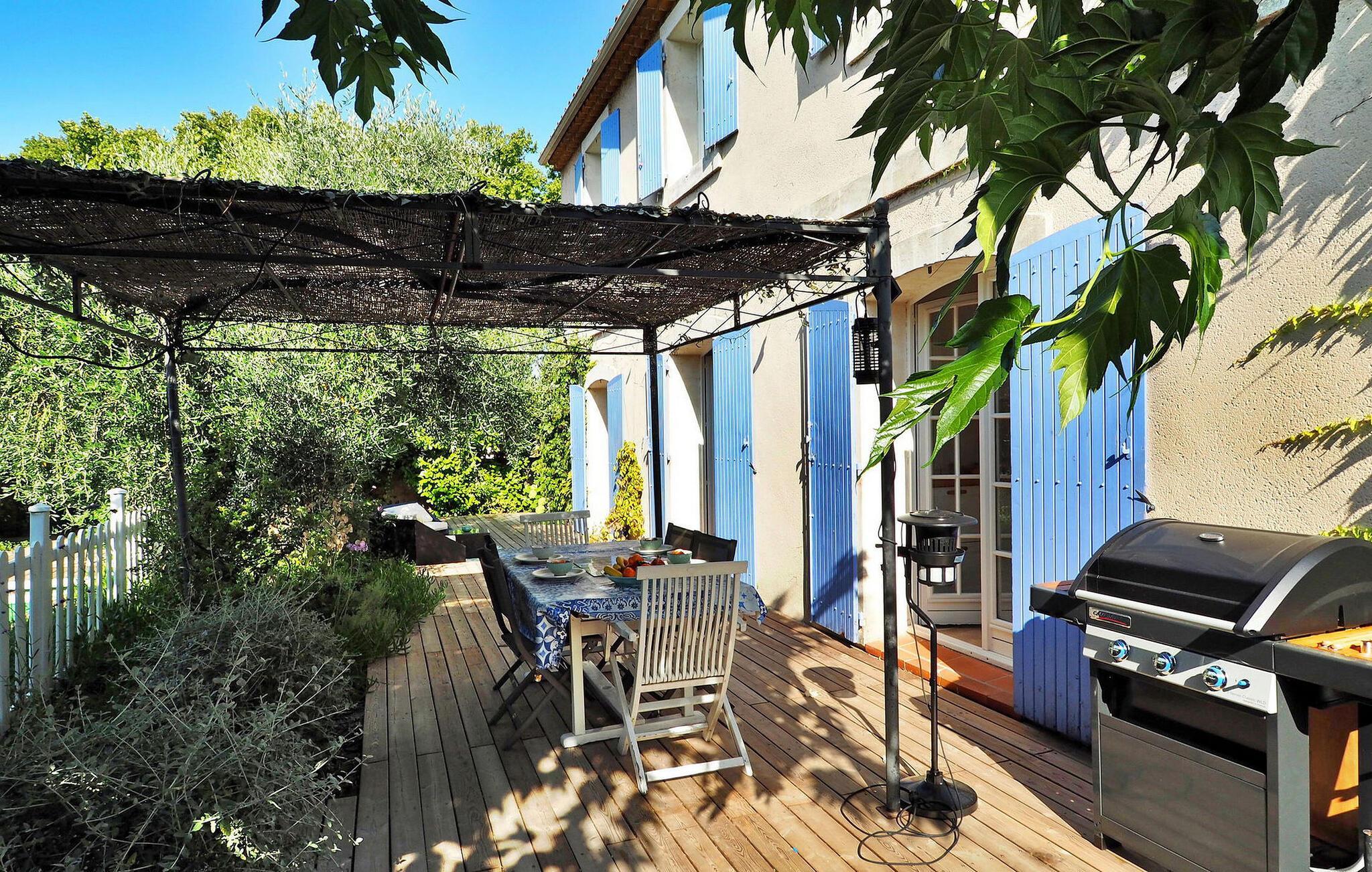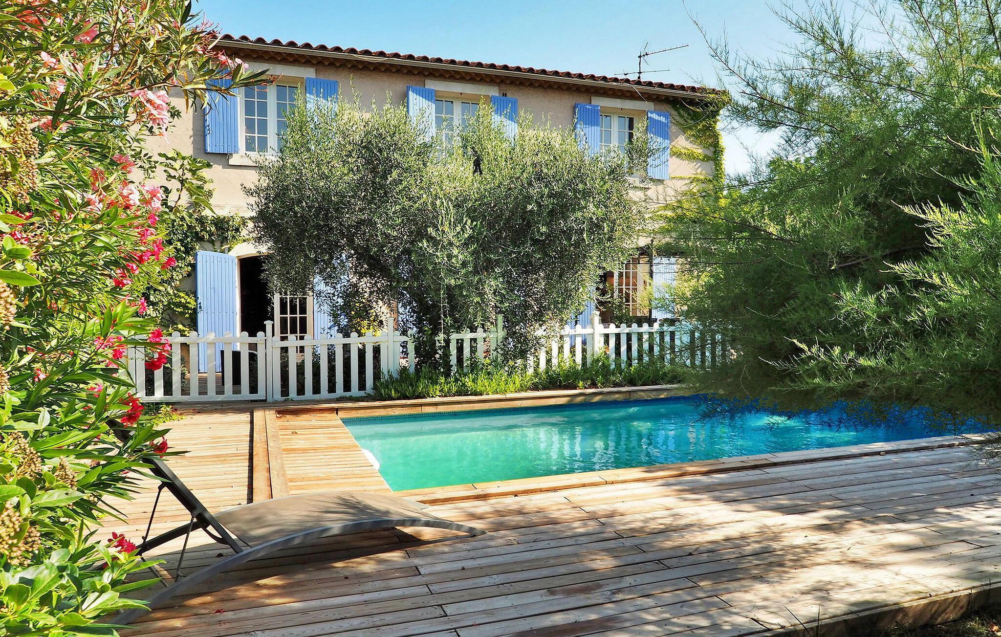 Oplev et charmerende feriested i Fontvieille, Provence. Beliggende i gåafstand fra landsbyens pulserende centrum, tilbyder denne hyggelige bolig værelser med aircondition for ultimativ komfort. Stueetagen har en rummelig opholdsstue med et veludstyret køkken, spiseplads, et hyggeligt opholdsområde med sofaer og et tv samt et praktisk vaskerum. Ovenpå kan du nyde komforten af smagfuldt indrettede soveværelser. Nyd den udendørs oase med en privat opvarmet swimmingpool, grill og pergola med siddepladser til dejlige al fresco spisning. Omfavn essensen af Provence i dette maleriske ferieparadis, perfekt til at skabe elskede minder. Fontvieilles centrum er tilgængeligt til fods fra villaen, hvor du finder mange butikker.
