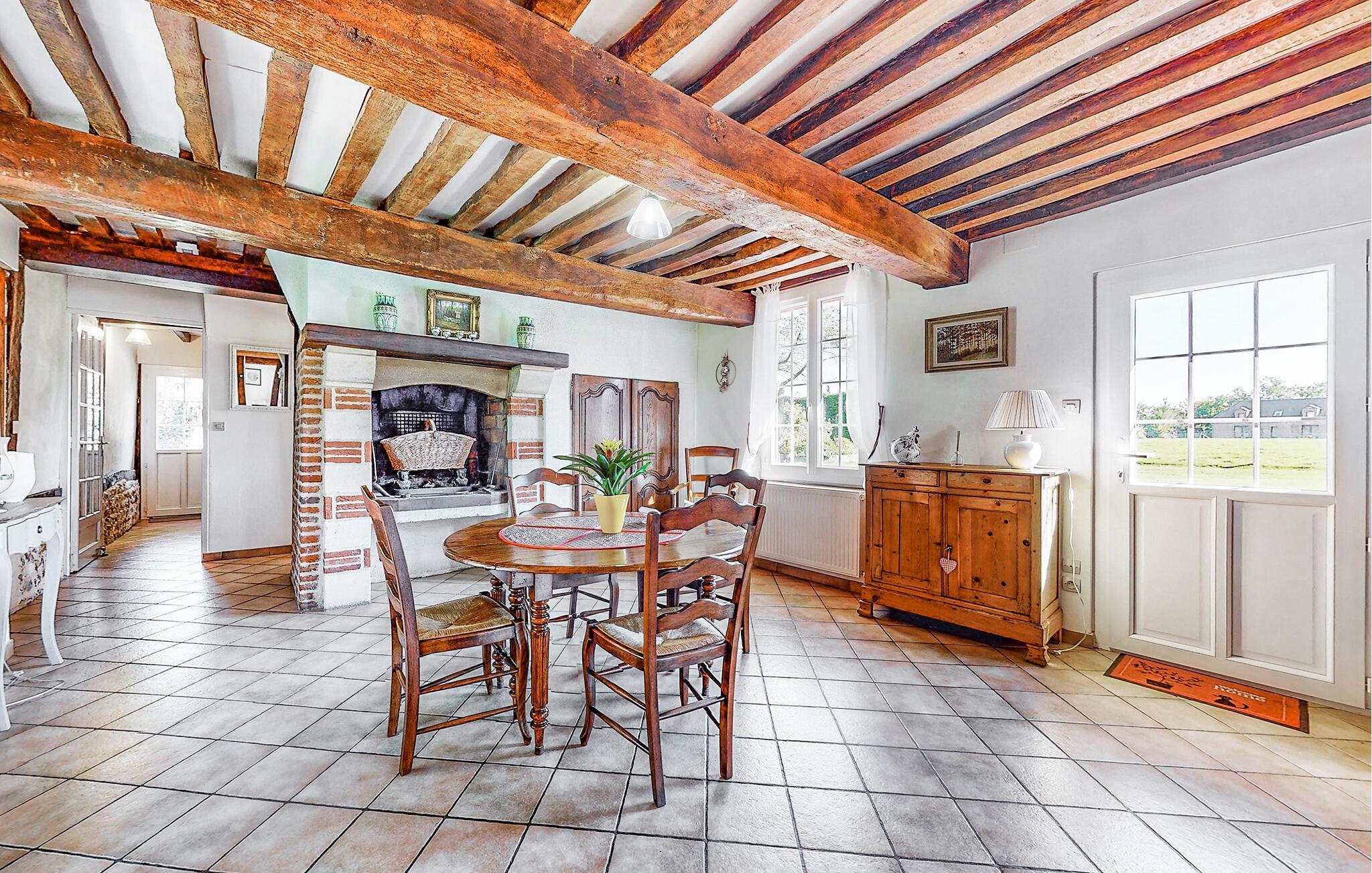 Dette hus, omgivet af en vidtstrakt have, er en oase af ro og autenticitet. Indenfor imponerer rummene med fritliggende træbjælker, varme træmøbler og en indbydende atmosfære, der harmonisk forener historie og komfort. Den rummelige opholdsstue inviterer til hyggelige stunder, mens den traditionelle arkitektur i hvert hjørne afspejler Normandiets charme. Her føler I jer straks hjemme, omgivet af natur og landlig ro.