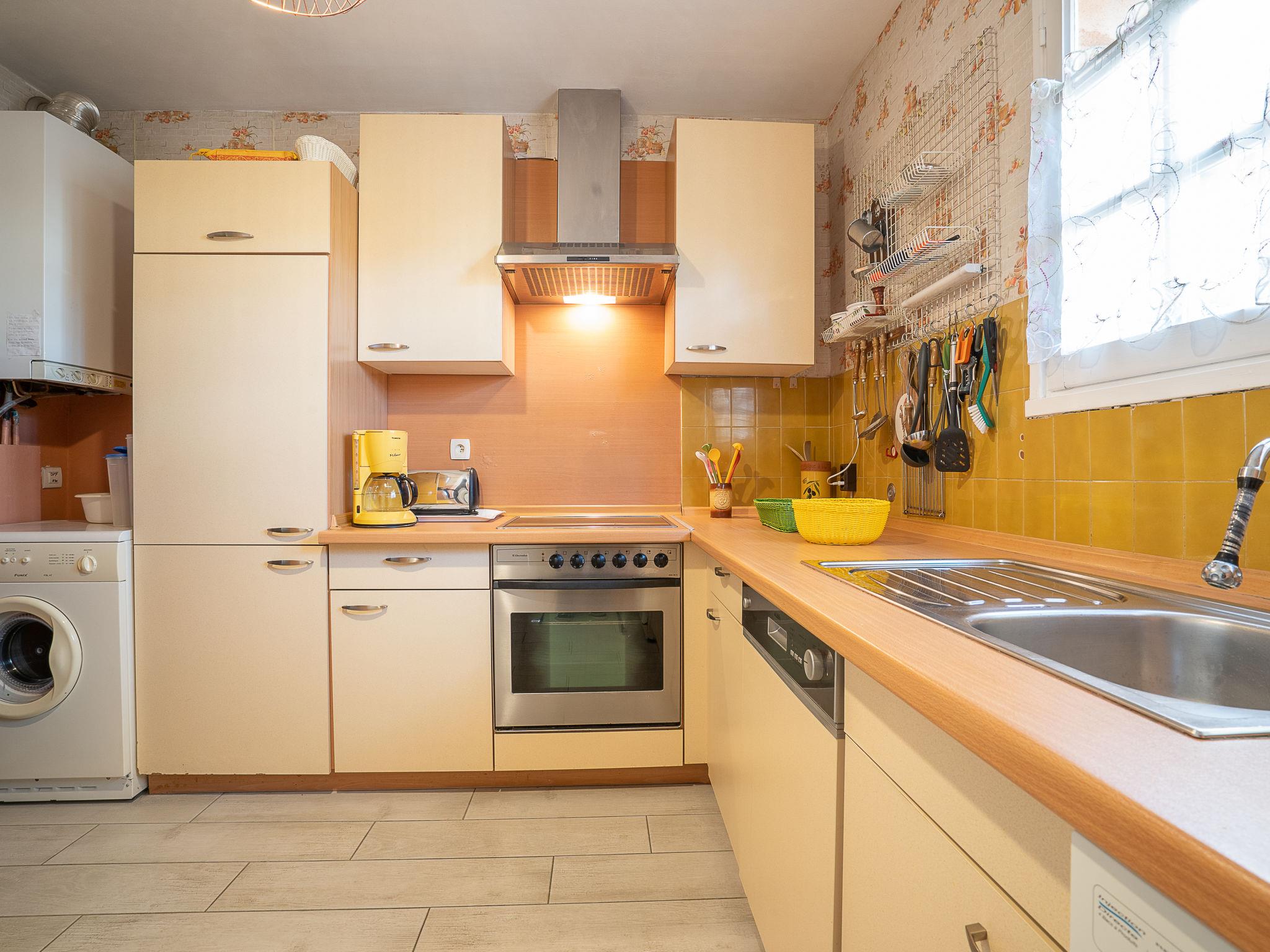 4-room house 100 m2 on 2 levels. Living/dining room with TV. Exit to the garden, north-west facing position. Kitchen (oven, dishwasher, 4 ceramic glass hob hotplates, toaster, microwave, freezer, electric coffee machine). Sep. WC. Upper floor: 1 room with 1 french bed (2 x 90 cm, length 190 cm), electric heating and air conditioning. 1 room with 1 french bed (140 cm, length 190 cm), electric heating and air conditioning. 1 room with 1 french bed (140 cm, length 190 cm), electric heating and air conditioning. Shower/WC. Gas heating. Garden 500 m2. Terrace furniture. Facilities: washing machine, dryer, iron. Internet (WiFi, extra). Parking. Please note: smoke alarm.