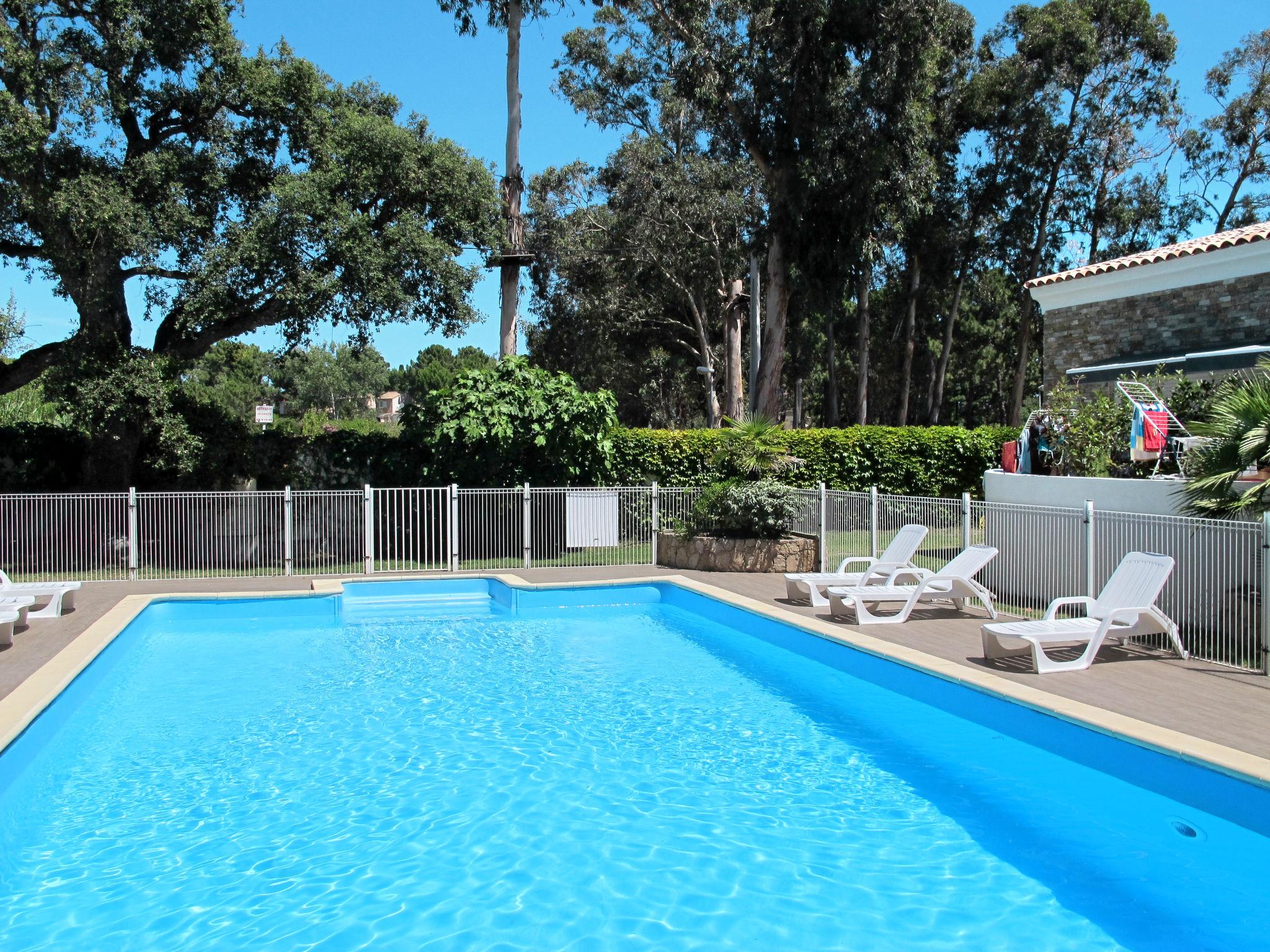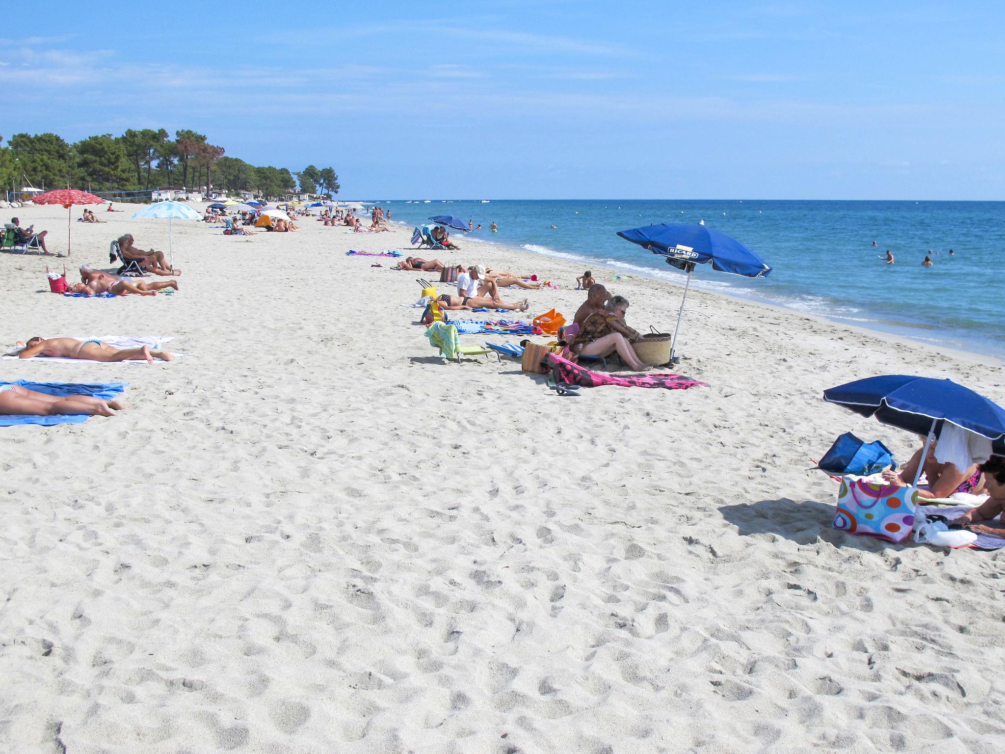Resort "A Suara di Mare". 8 apartments in the residence. 6 km from the centre of Ghisonaccia, 60 km from the centre of Porto Vecchio, 90 km from the centre of Bastia, in a sunny position, 50 m from the sea, 50 m from the beach, direct access to the beach, in the countryside. For shared use: well-kept garden 2'000 m2 (fenced) with trees, meadow, swimming pool fenced (12 x 6 m, seasonal availability: 15.May. - 31.Oct.). Terrace, barbecue, children's playground, parking on the premises. Supermarket 2 km, restaurant 100 m, bus stop 5.3 km, sandy beach 50 m. Please note: car recommended. Residence with electric gates. The photograph shows a typical example.