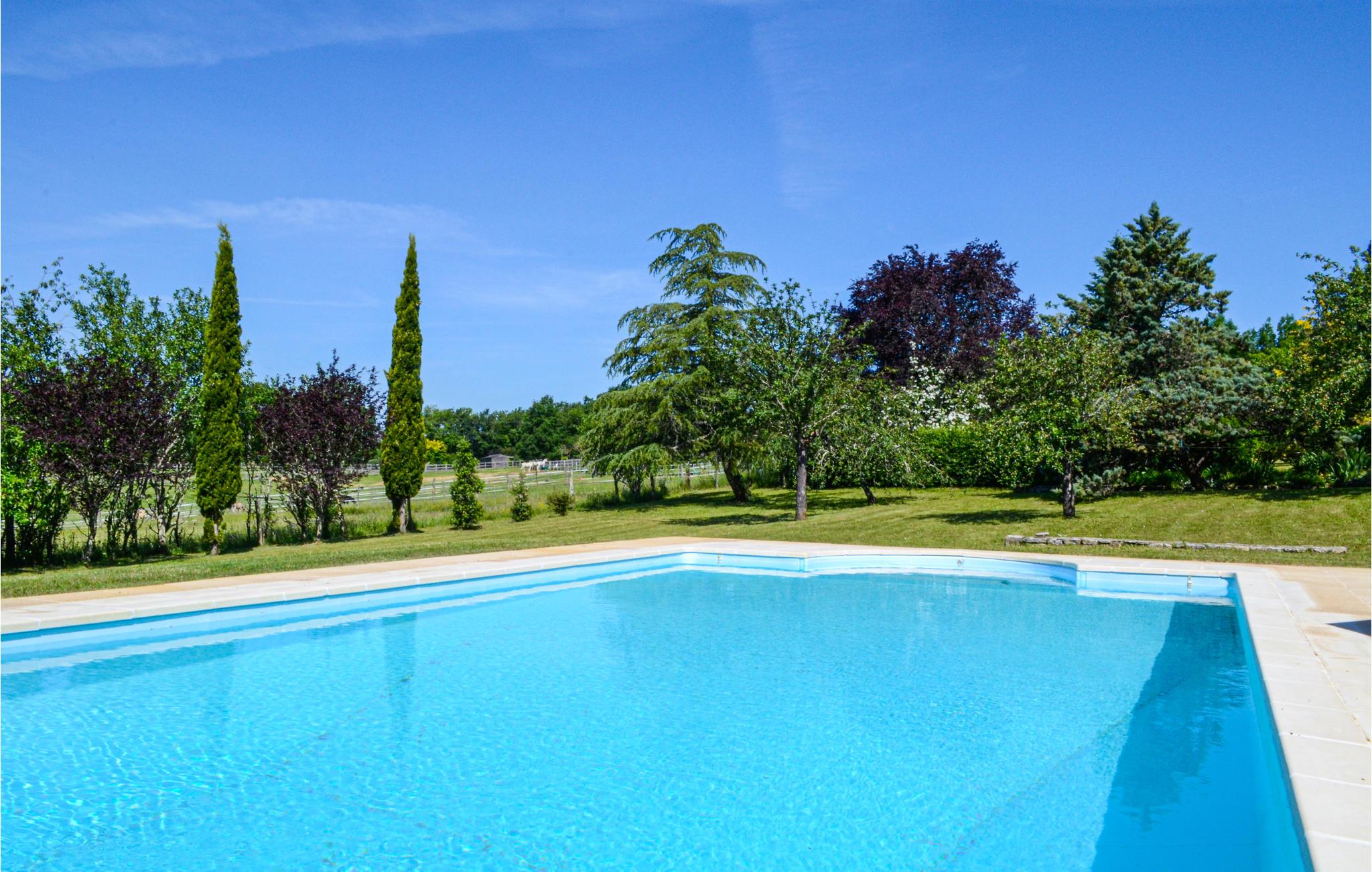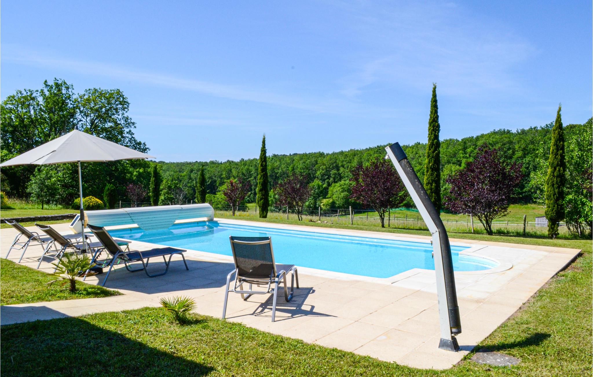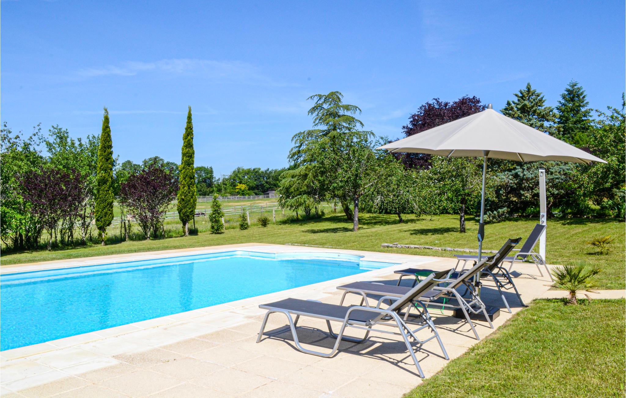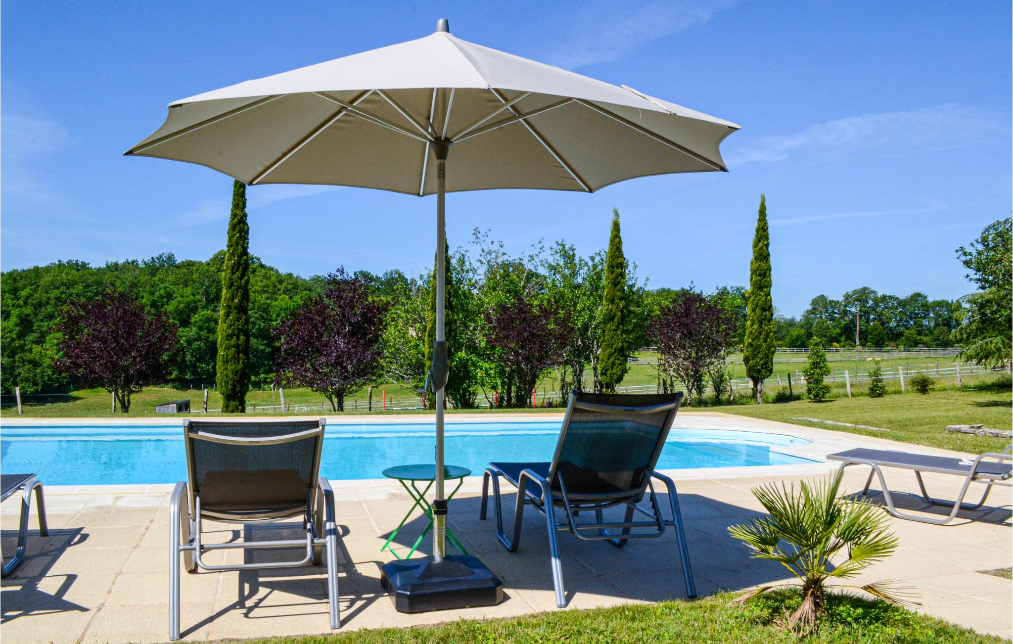 Huset, der giver jer fri udsigt over haven og den store private pool samt til skove og marker, er et ideelt sted at slappe af på. En terrasse, der vender mod vest, grænser op til dagligstuen, og på den overdækkede terrasse mod syd kan I spise i det fri. Poolen udenfor er udstyret med et skydetag for at garantere badning i alle slags vejr, og på terrassen har I flere liggestole.