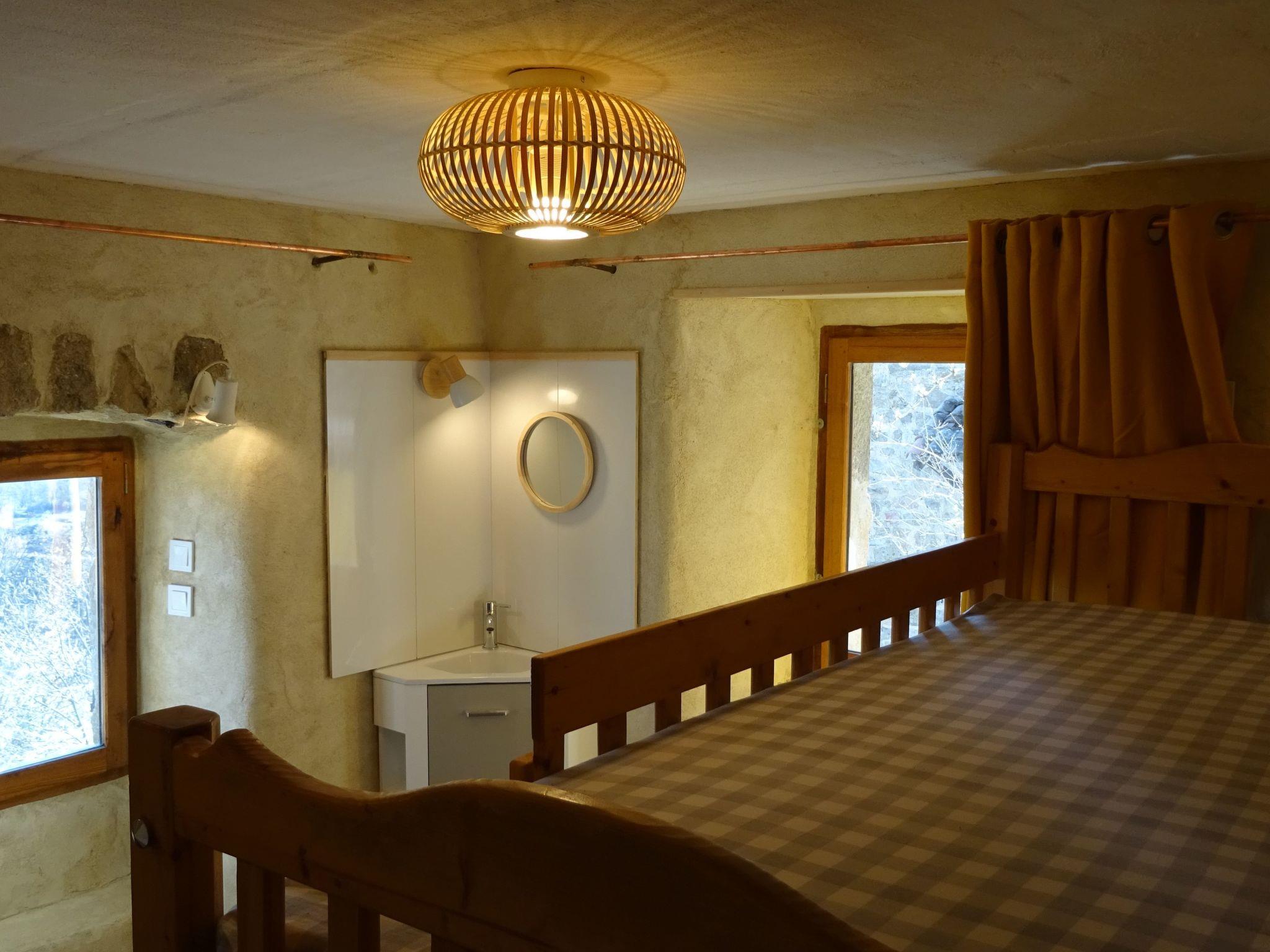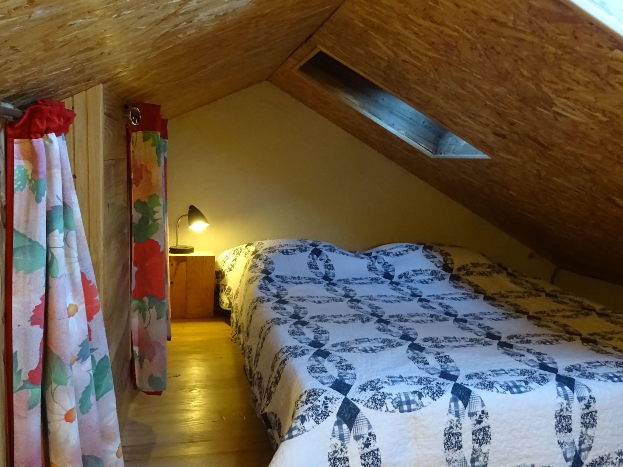 - an 11 m² mezzanine accessible from the vestibule (height under ridge: 1.30 m) with a double bed (length: 190 cm, width: 140 cm) and two Velux roof windows.