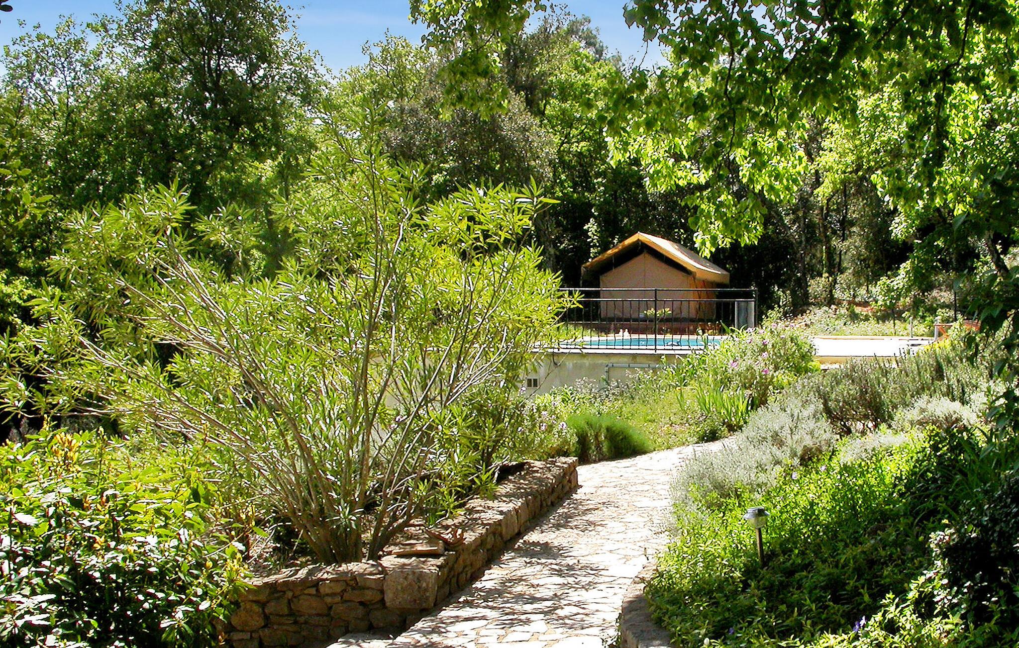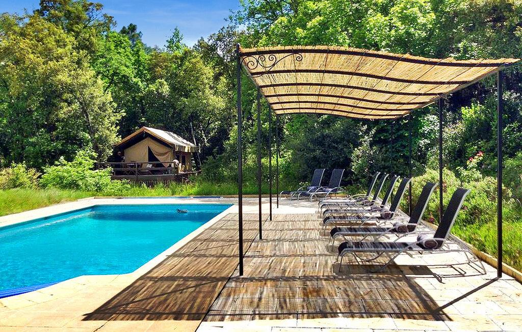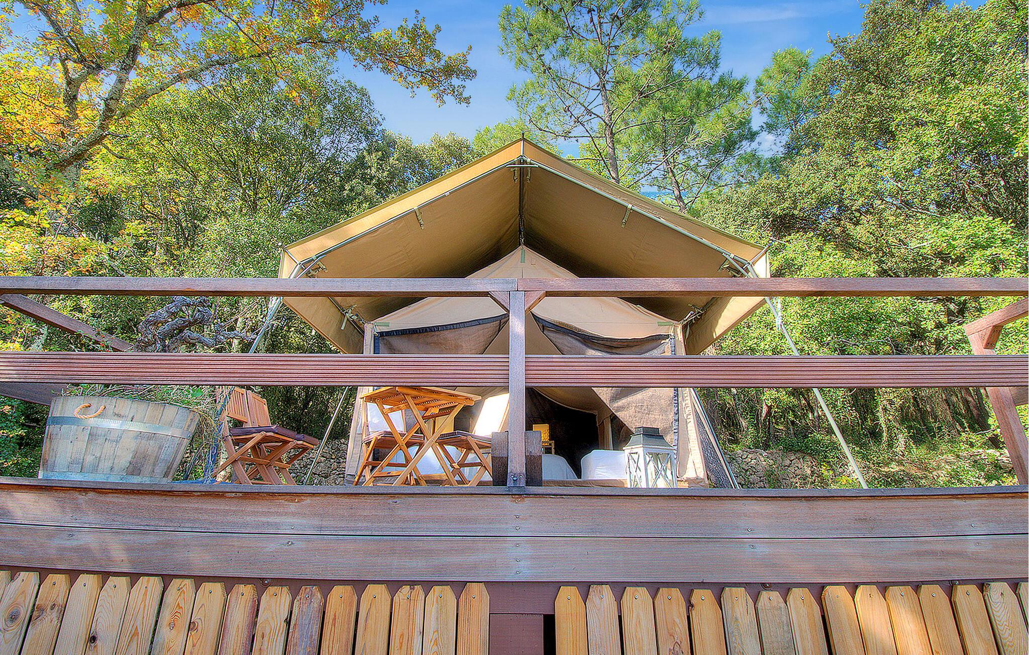 Beliggende i 4,5 hektar skov nær Goudargues, lover denne unikke stenejendom en romantisk ferie. Bo i et luksuriøst telt på 30 m² med egen terrasse og adgang til fælles pool. Teltet har et soveområde med dobbeltseng (180 x 200), to børnesenge (0,90 x 190), Nespresso-maskine, elkedel og vinkøleskab. Badeværelset omfatter bruser, håndvask og toilet. Udenfor lokker en eksotisk træplatform (50 m²) med havemøbler. Ejendommen, som deles af feriegæster, giver et fredfyldt tilflugtssted med parkering til en bil. En 10 mx 4,50 m fælles pool med en rummelig terrasse og liggestole inviterer til afslapning. Bemærk venligst, at madlavning ikke er tilladt i teltene. Ejeren tilbyder en gratis morgenmad og valgfri aftenmiddage. Table d'hôtes, to gange om ugen, er 29,50 euro per person. På andre nætter er en luksusspiseservice i dit telt tilgængelig for 39,50 euro pr. person.
