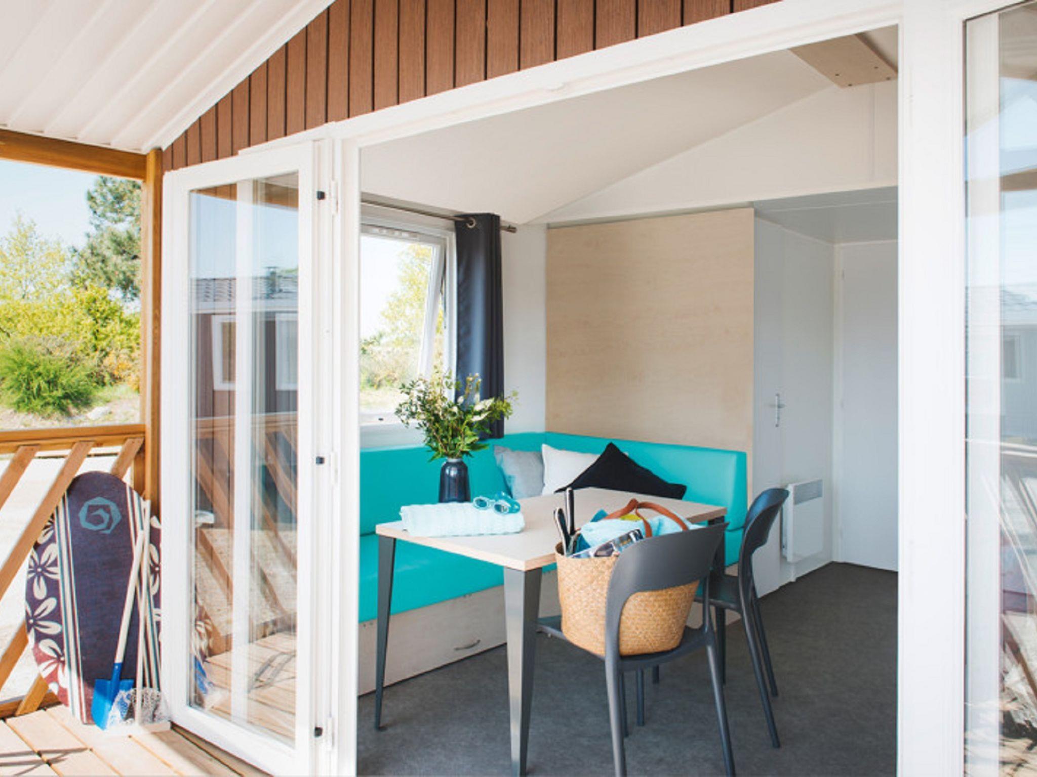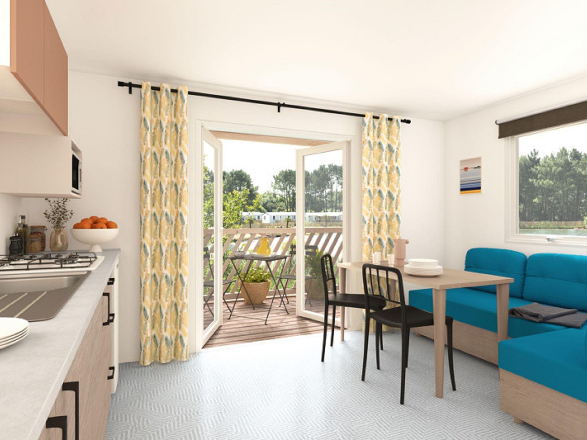 "Domaine de Château Laval", 3-room mobile home 31 m2. Practical furnishings: living/dining room with dining table and TV. Exit to the terrace. 1 room with 1 french bed. 1 room with 2 beds. Open kitchen (4 gas rings, microwave, freezer, electric coffee machine). Shower, sep. WC. Electric heating. Terrace. Terrace furniture. Facilities: children's high chair, baby cot. Please note: maximum 2 pets/ dogs allowed. Smoke alarm.