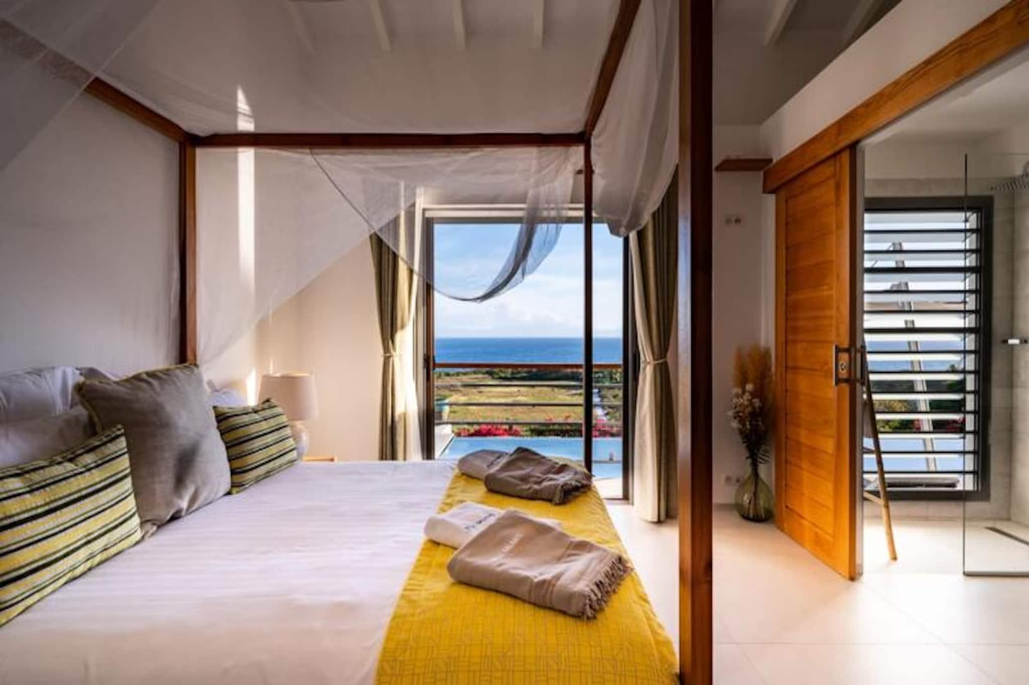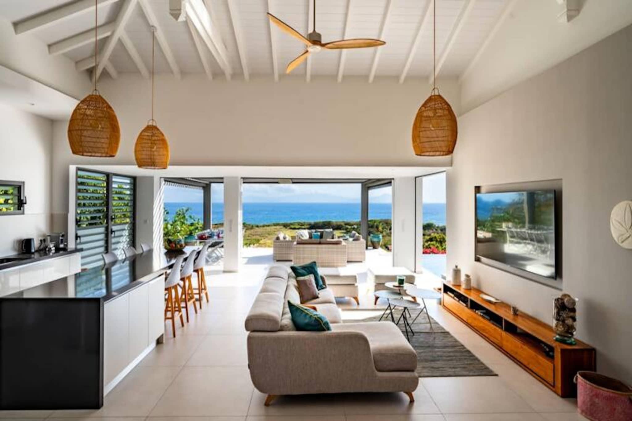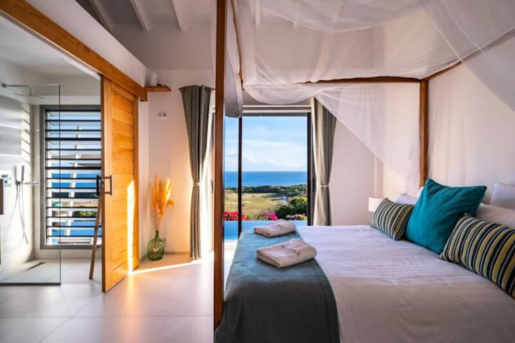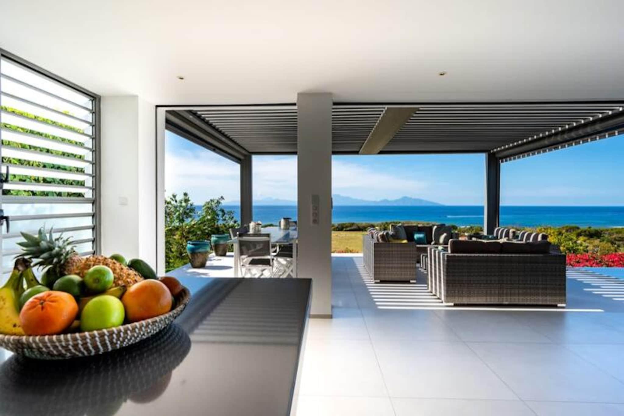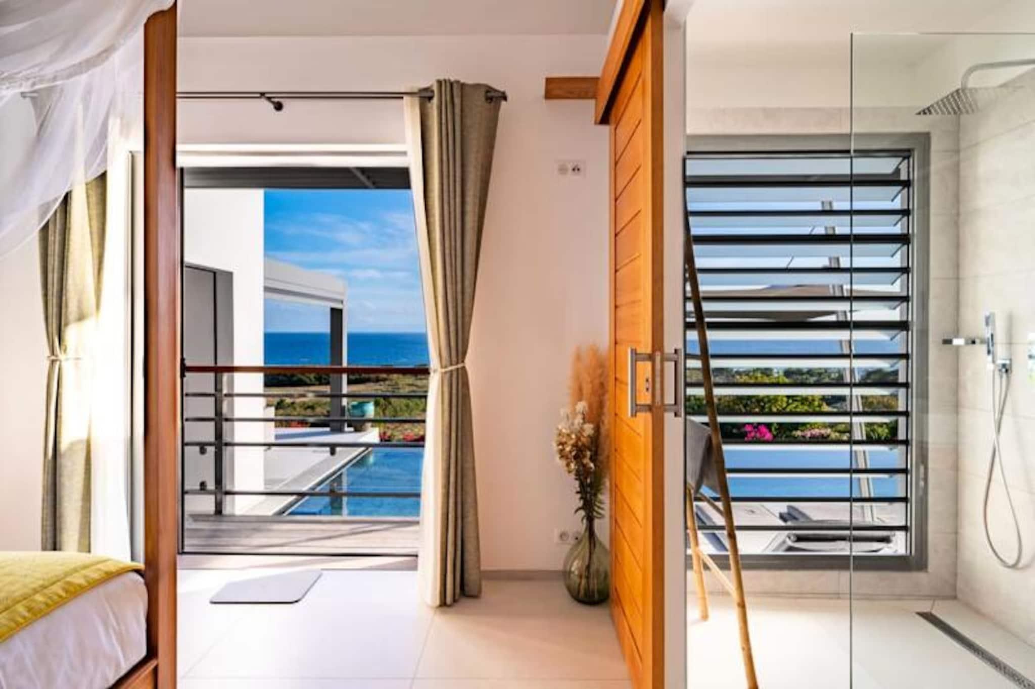 Beliggende på de fredfyldte højder i Les Basses, er Villa Belle Galante et fristed for moderne luksus og caribisk charme. Med sin betagende panoramaudsigt over det turkisblå hav og en infinity-pool, der synes at smelte sammen med horisonten, inviterer denne villa dig til at slappe af i absolut ro. De blide passatvinde og frodige omgivelser skaber en perfekt kulisse for din drømmeferie. Denne moderne villa strækker sig over imponerende 246 m² og har plads til op til 11 gæster fordelt på fem smukt designede soveværelser, der hver har eget badeværelse med bruseniche. Fire af soveværelserne er udstyret med 160 cm senge, mens det femte tilbyder en 140 cm seng og en ekstra 90 cm seng, hvilket gør den ideel til familier eller vennegrupper. Det fuldt udstyrede køkken med sin centrale køkkenø flyder problemfrit over i spiseområdet på den overdækkede terrasse, hvor op til tolv gæster kan nyde måltider, mens de kigger ud over Det Caribiske Hav. Villaens træmøbler og moderne arkitektur tilføjer et strejf af elegance til den indbydende atmosfære. Villaen ligger kun fem minutter fra den charmerende by Grand-Bourg og tilbyder nem adgang til supermarkeder, livlige markeder og dejlige kreolske restauranter. De nærliggende strande Anse Canot og La Feuillère er et must-see, uanset om du ønsker at svømme i krystalklart vand eller prøve kræfter med kitesurfing. For dem, der søger eventyr, kan du udforske lokale romdestillerier, vandre gennem sukkerrørsmarker eller deltage i strandkoncerter under stjernerne. Med sin blanding af komfort, stil og nærhed til det bedste af Marie-Galante lover Villa Belle Galante en uforglemmelig caribisk flugt. Uanset om du slapper af ved infinity-poolen, nyder solnedgange på terrassen eller opdager øens skatte, er denne villa din port til paradis.
