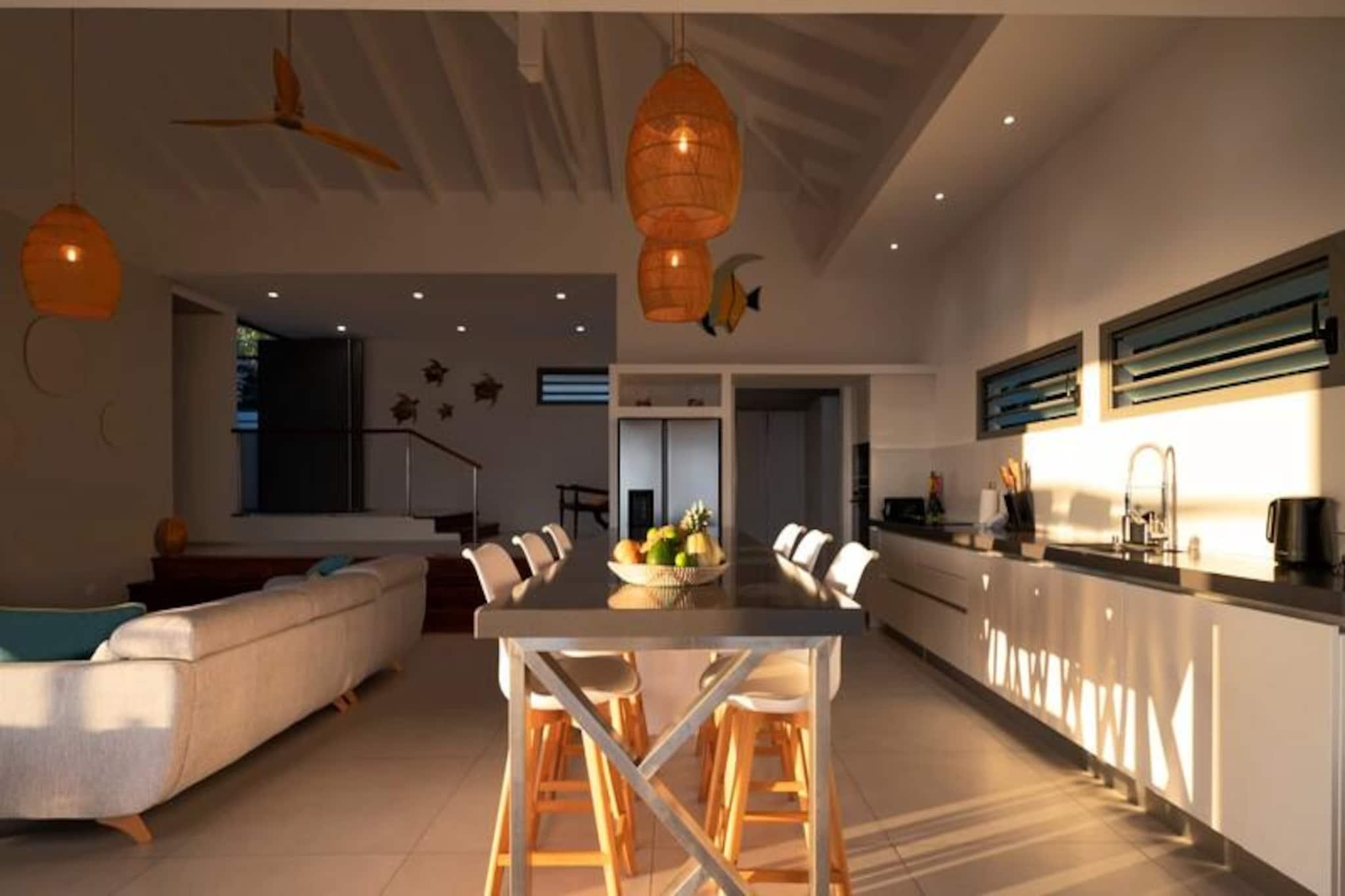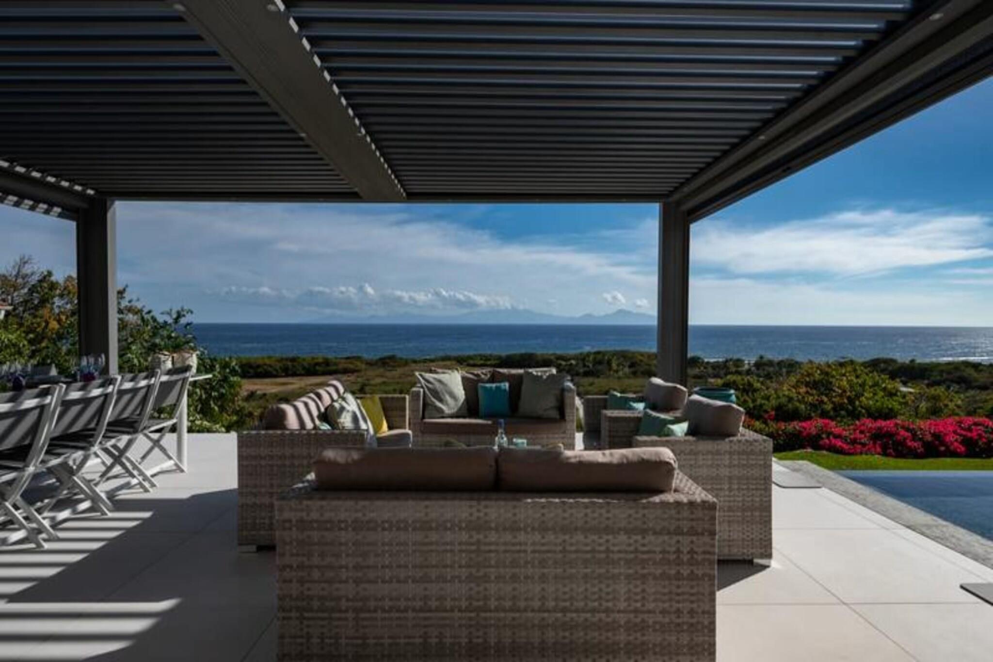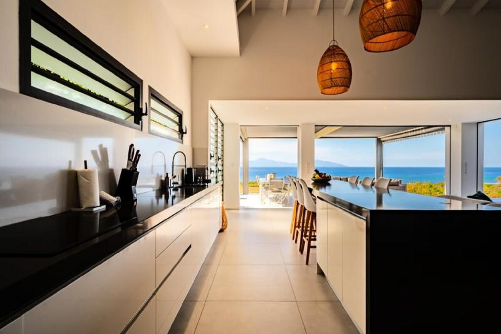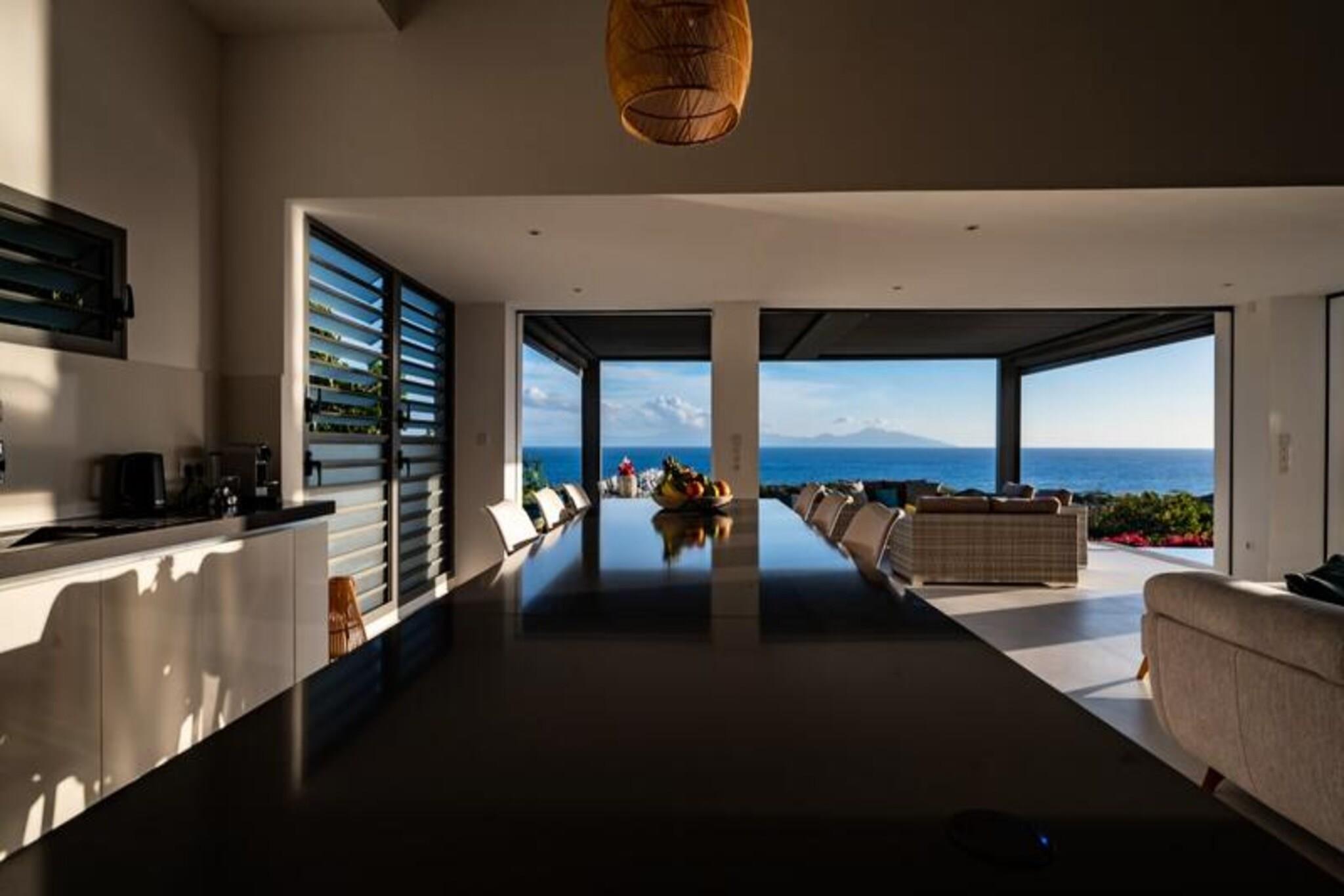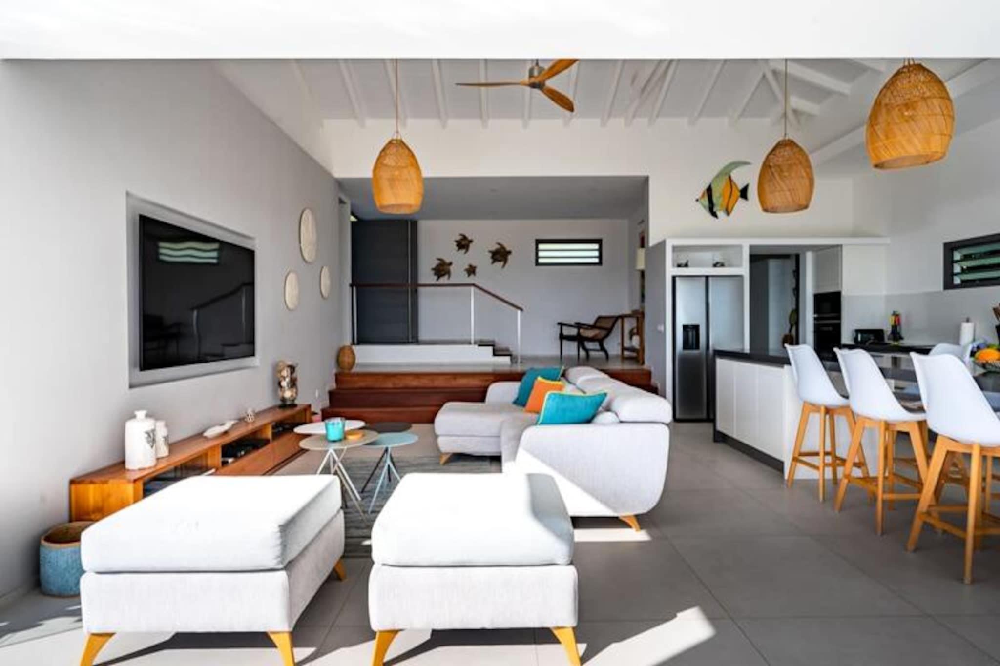 Beliggende på de fredfyldte højder i Les Basses, er Villa Belle Galante et fristed for moderne luksus og caribisk charme. Med sin betagende panoramaudsigt over det turkisblå hav og en infinity-pool, der synes at smelte sammen med horisonten, inviterer denne villa dig til at slappe af i absolut ro. De blide passatvinde og frodige omgivelser skaber en perfekt kulisse for din drømmeferie. Denne moderne villa strækker sig over imponerende 246 m² og har plads til op til 11 gæster fordelt på fem smukt designede soveværelser, der hver har eget badeværelse med bruseniche. Fire af soveværelserne er udstyret med 160 cm senge, mens det femte tilbyder en 140 cm seng og en ekstra 90 cm seng, hvilket gør den ideel til familier eller vennegrupper. Det fuldt udstyrede køkken med sin centrale køkkenø flyder problemfrit over i spiseområdet på den overdækkede terrasse, hvor op til tolv gæster kan nyde måltider, mens de kigger ud over Det Caribiske Hav. Villaens træmøbler og moderne arkitektur tilføjer et strejf af elegance til den indbydende atmosfære. Villaen ligger kun fem minutter fra den charmerende by Grand-Bourg og tilbyder nem adgang til supermarkeder, livlige markeder og dejlige kreolske restauranter. De nærliggende strande Anse Canot og La Feuillère er et must-see, uanset om du ønsker at svømme i krystalklart vand eller prøve kræfter med kitesurfing. For dem, der søger eventyr, kan du udforske lokale romdestillerier, vandre gennem sukkerrørsmarker eller deltage i strandkoncerter under stjernerne. Med sin blanding af komfort, stil og nærhed til det bedste af Marie-Galante lover Villa Belle Galante en uforglemmelig caribisk flugt. Uanset om du slapper af ved infinity-poolen, nyder solnedgange på terrassen eller opdager øens skatte, er denne villa din port til paradis.