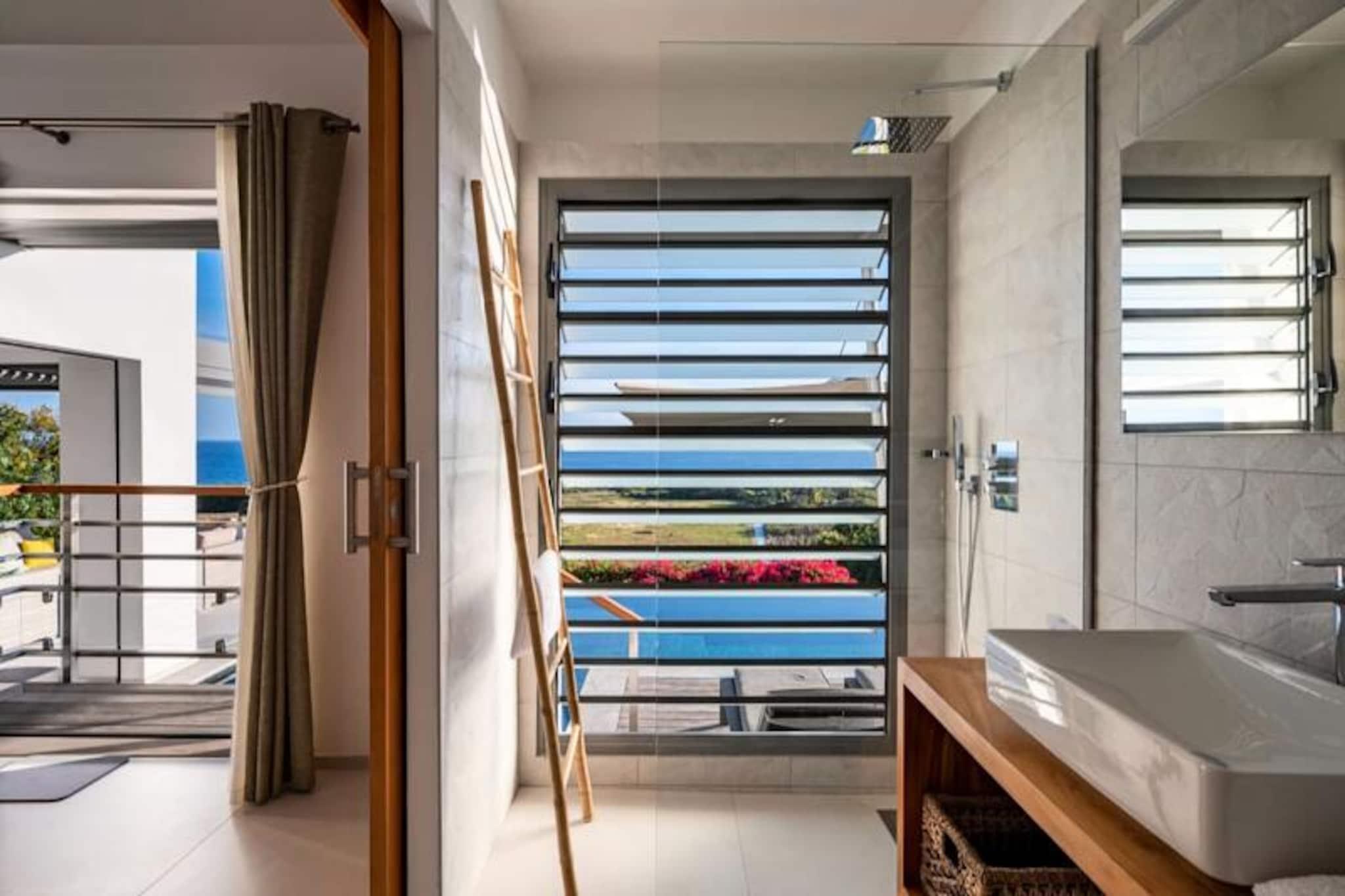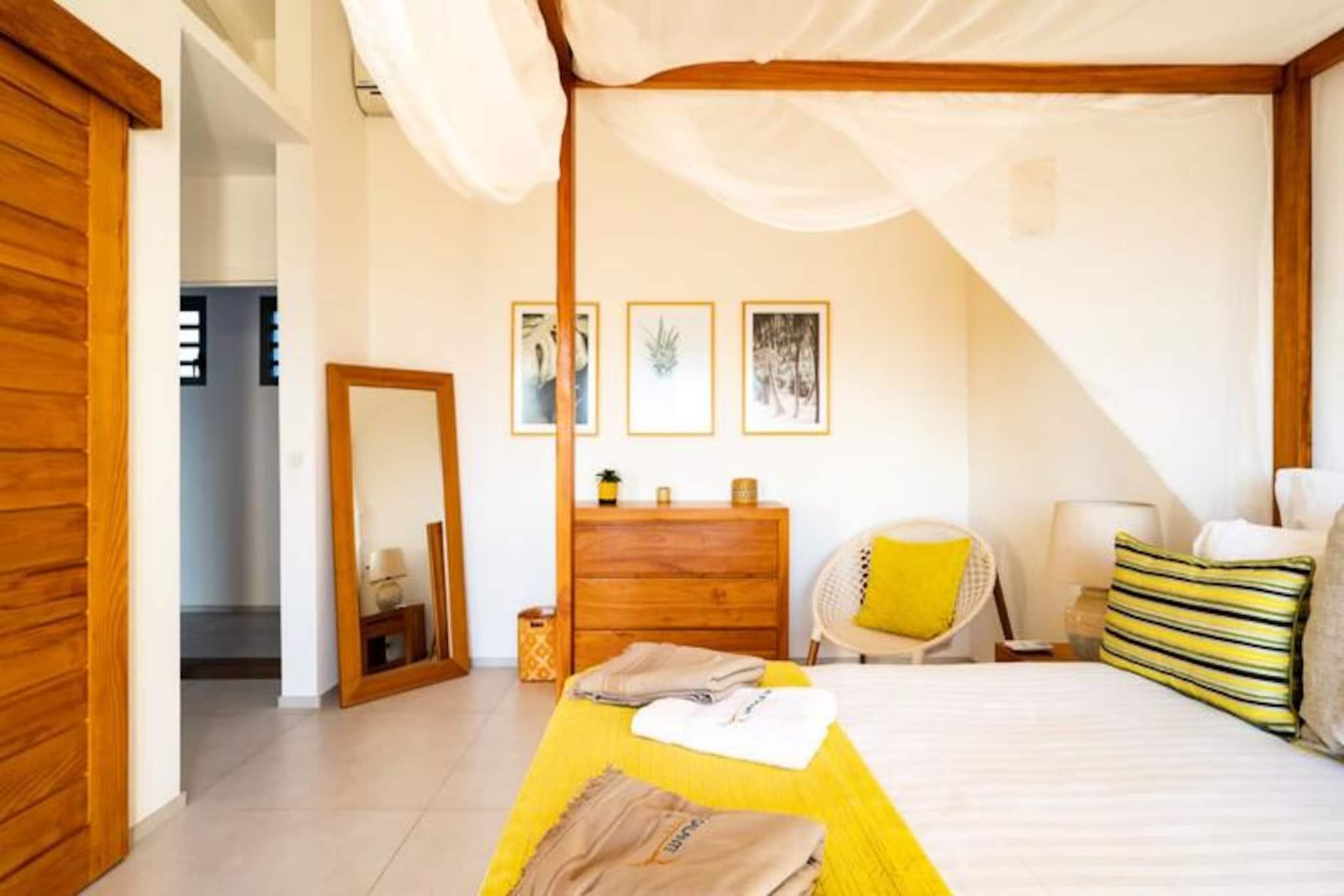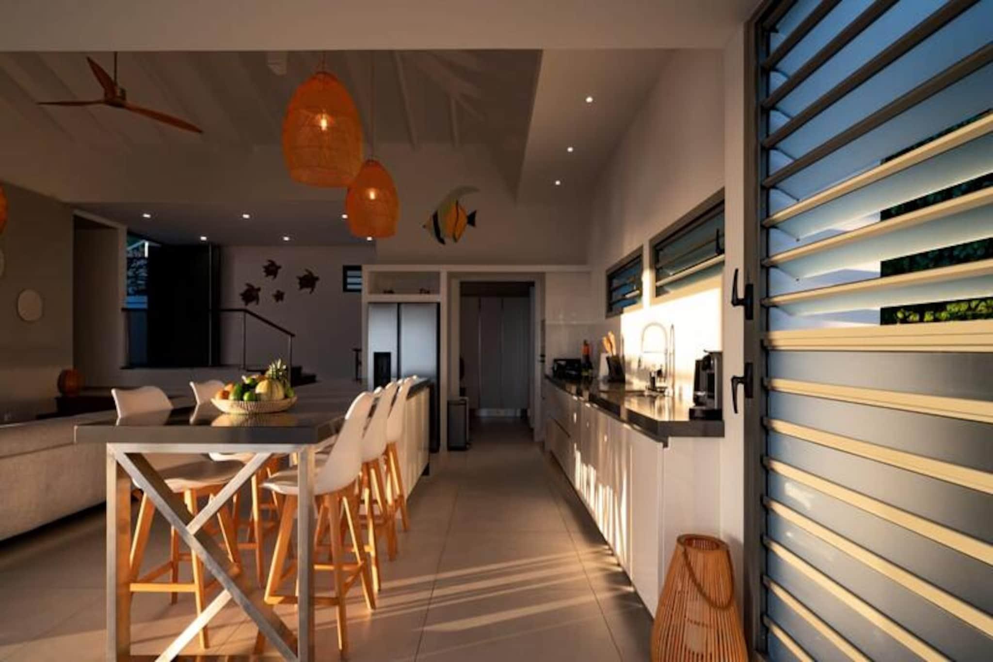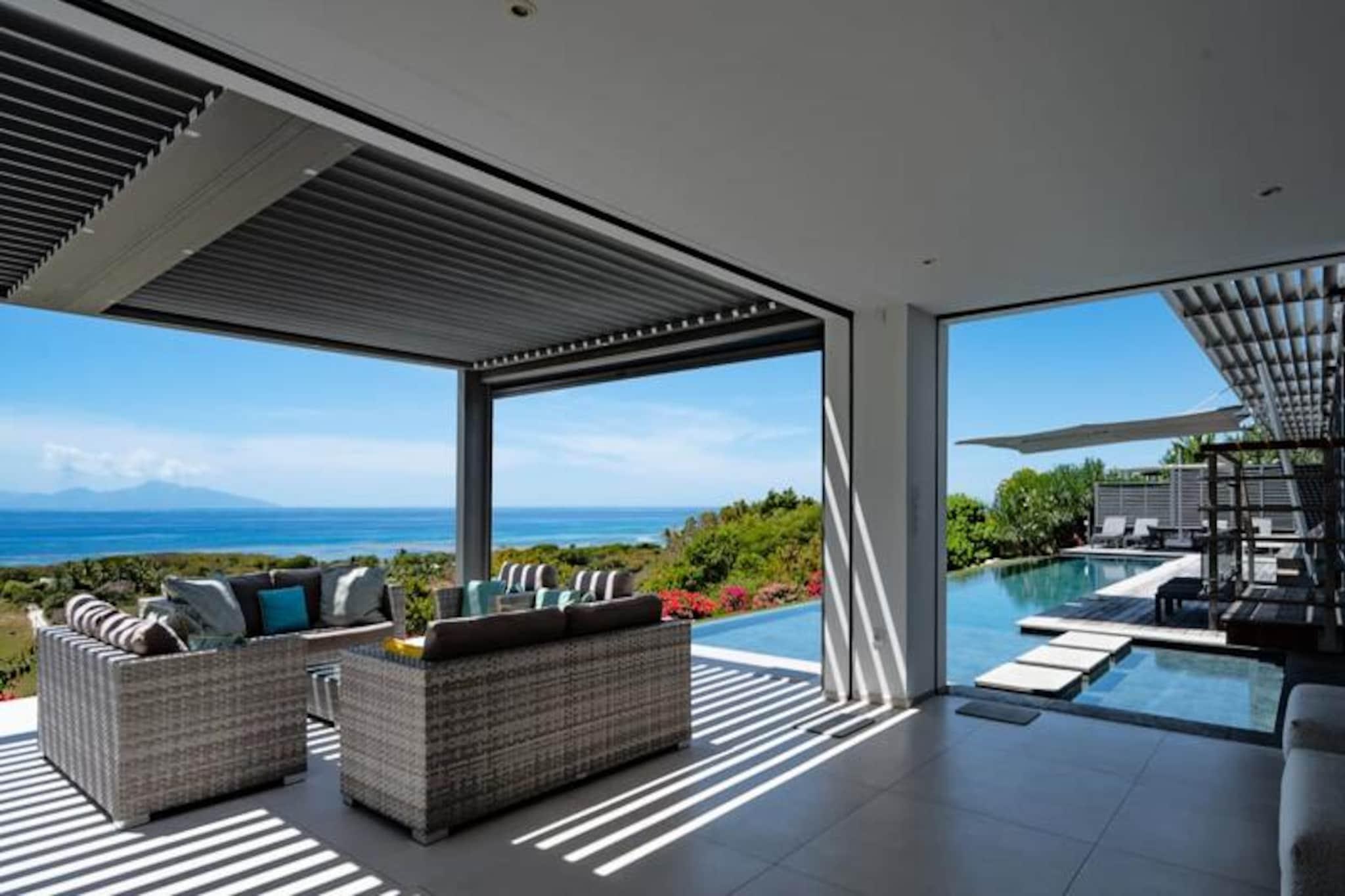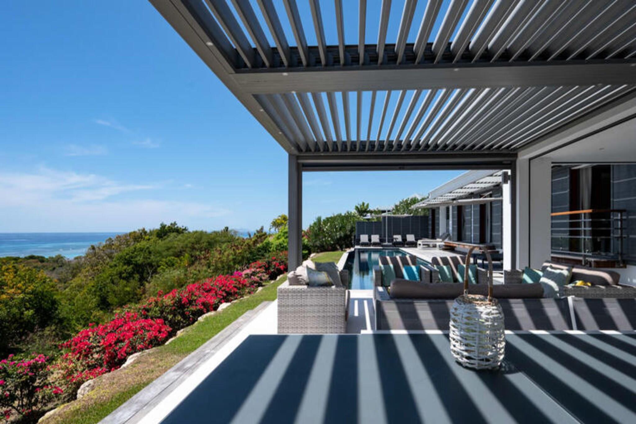 Beliggende på de fredfyldte højder i Les Basses, er Villa Belle Galante et fristed for moderne luksus og caribisk charme. Med sin betagende panoramaudsigt over det turkisblå hav og en infinity-pool, der synes at smelte sammen med horisonten, inviterer denne villa dig til at slappe af i absolut ro. De blide passatvinde og frodige omgivelser skaber en perfekt kulisse for din drømmeferie. Denne moderne villa strækker sig over imponerende 246 m² og har plads til op til 11 gæster fordelt på fem smukt designede soveværelser, der hver har eget badeværelse med bruseniche. Fire af soveværelserne er udstyret med 160 cm senge, mens det femte tilbyder en 140 cm seng og en ekstra 90 cm seng, hvilket gør den ideel til familier eller vennegrupper. Det fuldt udstyrede køkken med sin centrale køkkenø flyder problemfrit over i spiseområdet på den overdækkede terrasse, hvor op til tolv gæster kan nyde måltider, mens de kigger ud over Det Caribiske Hav. Villaens træmøbler og moderne arkitektur tilføjer et strejf af elegance til den indbydende atmosfære. Villaen ligger kun fem minutter fra den charmerende by Grand-Bourg og tilbyder nem adgang til supermarkeder, livlige markeder og dejlige kreolske restauranter. De nærliggende strande Anse Canot og La Feuillère er et must-see, uanset om du ønsker at svømme i krystalklart vand eller prøve kræfter med kitesurfing. For dem, der søger eventyr, kan du udforske lokale romdestillerier, vandre gennem sukkerrørsmarker eller deltage i strandkoncerter under stjernerne. Med sin blanding af komfort, stil og nærhed til det bedste af Marie-Galante lover Villa Belle Galante en uforglemmelig caribisk flugt. Uanset om du slapper af ved infinity-poolen, nyder solnedgange på terrassen eller opdager øens skatte, er denne villa din port til paradis.