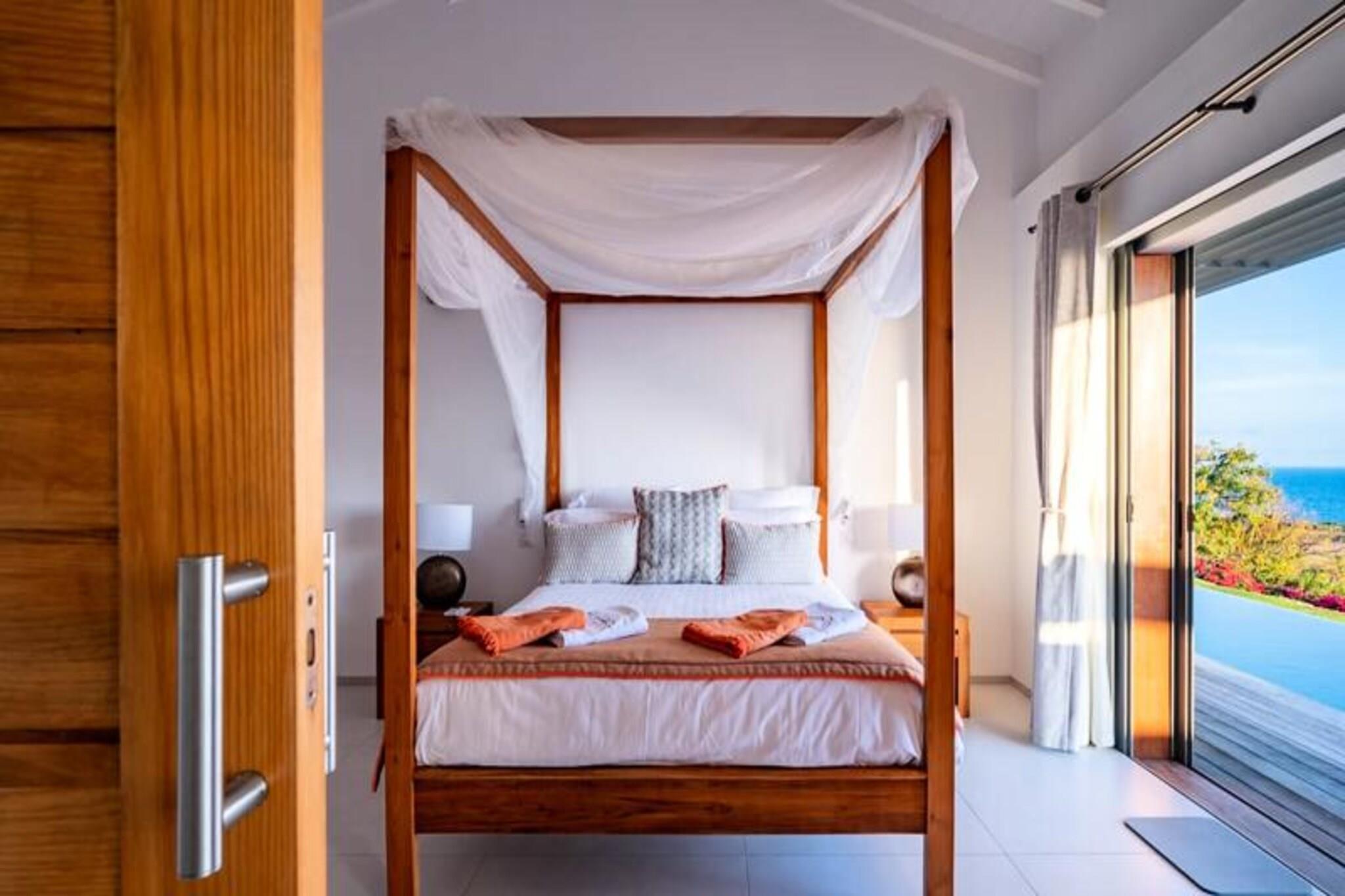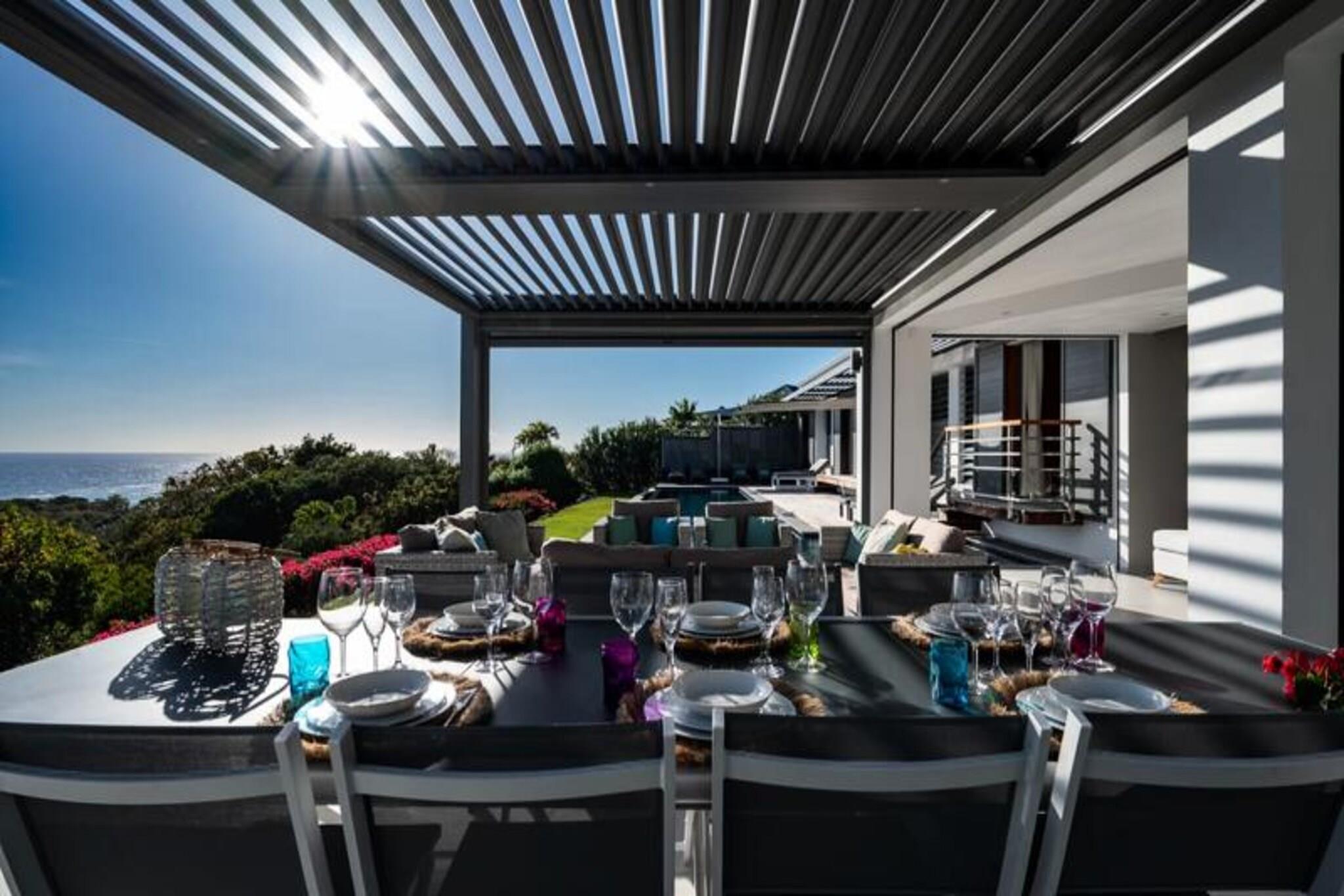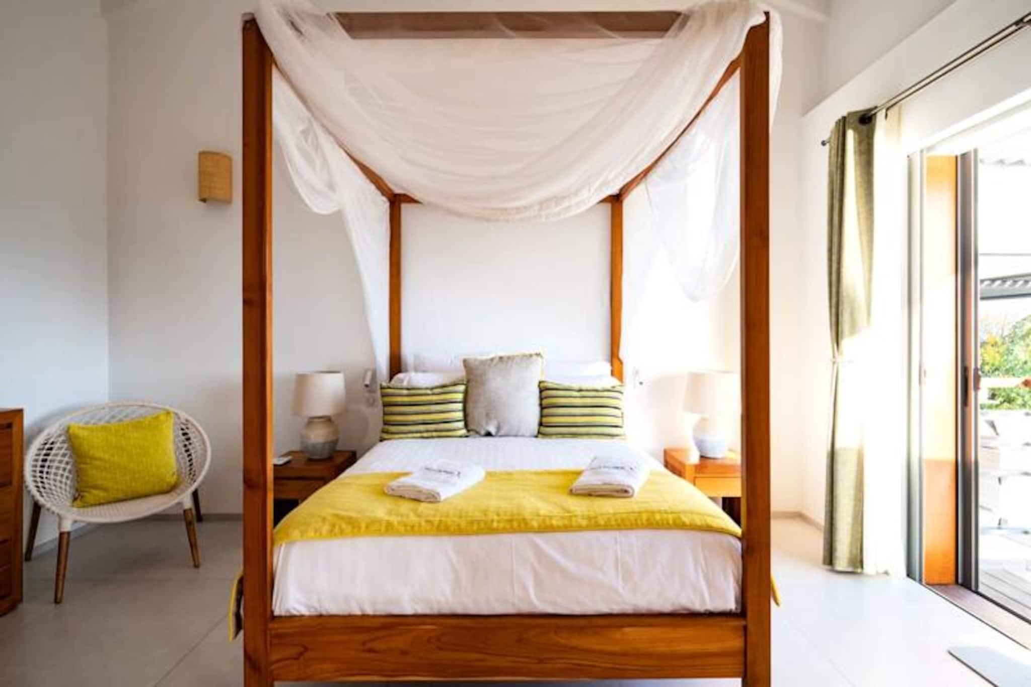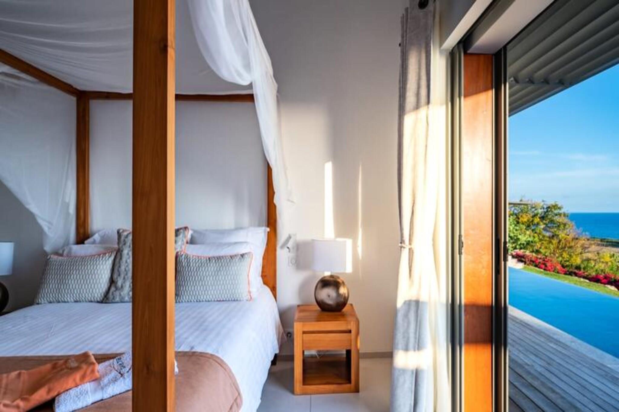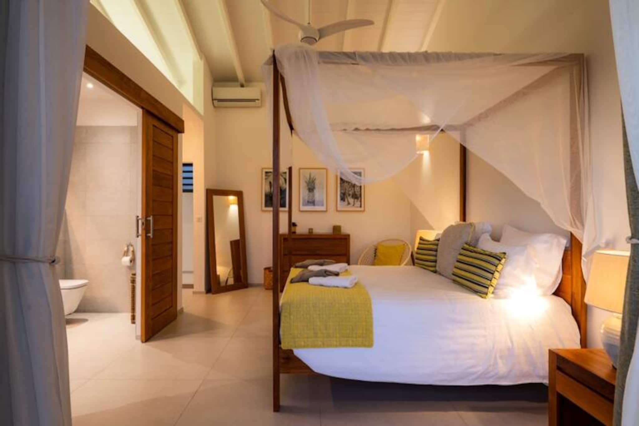 Beliggende på de fredfyldte højder i Les Basses, er Villa Belle Galante et fristed for moderne luksus og caribisk charme. Med sin betagende panoramaudsigt over det turkisblå hav og en infinity-pool, der synes at smelte sammen med horisonten, inviterer denne villa dig til at slappe af i absolut ro. De blide passatvinde og frodige omgivelser skaber en perfekt kulisse for din drømmeferie. Denne moderne villa strækker sig over imponerende 246 m² og har plads til op til 11 gæster fordelt på fem smukt designede soveværelser, der hver har eget badeværelse med bruseniche. Fire af soveværelserne er udstyret med 160 cm senge, mens det femte tilbyder en 140 cm seng og en ekstra 90 cm seng, hvilket gør den ideel til familier eller vennegrupper. Det fuldt udstyrede køkken med sin centrale køkkenø flyder problemfrit over i spiseområdet på den overdækkede terrasse, hvor op til tolv gæster kan nyde måltider, mens de kigger ud over Det Caribiske Hav. Villaens træmøbler og moderne arkitektur tilføjer et strejf af elegance til den indbydende atmosfære. Villaen ligger kun fem minutter fra den charmerende by Grand-Bourg og tilbyder nem adgang til supermarkeder, livlige markeder og dejlige kreolske restauranter. De nærliggende strande Anse Canot og La Feuillère er et must-see, uanset om du ønsker at svømme i krystalklart vand eller prøve kræfter med kitesurfing. For dem, der søger eventyr, kan du udforske lokale romdestillerier, vandre gennem sukkerrørsmarker eller deltage i strandkoncerter under stjernerne. Med sin blanding af komfort, stil og nærhed til det bedste af Marie-Galante lover Villa Belle Galante en uforglemmelig caribisk flugt. Uanset om du slapper af ved infinity-poolen, nyder solnedgange på terrassen eller opdager øens skatte, er denne villa din port til paradis.