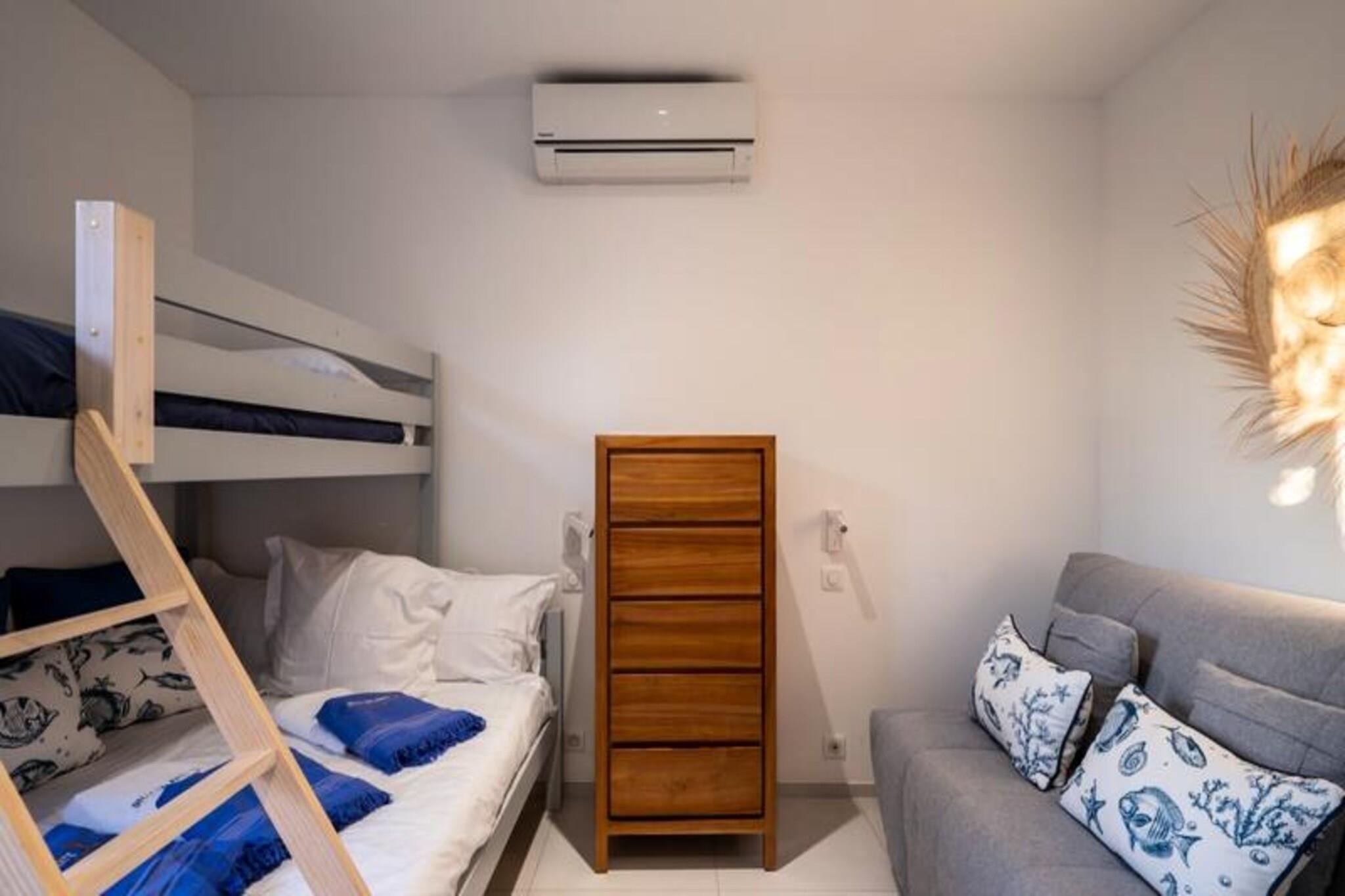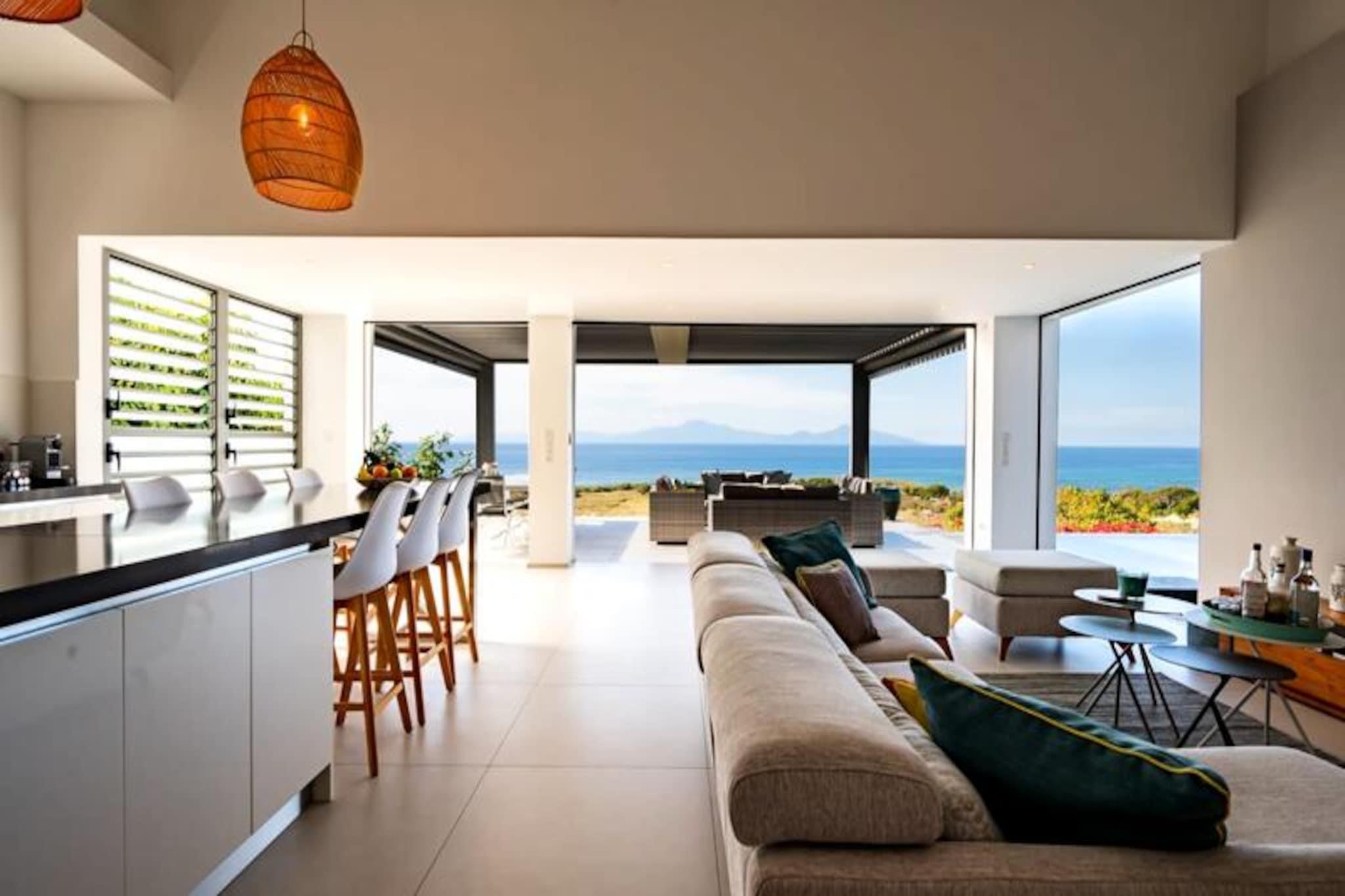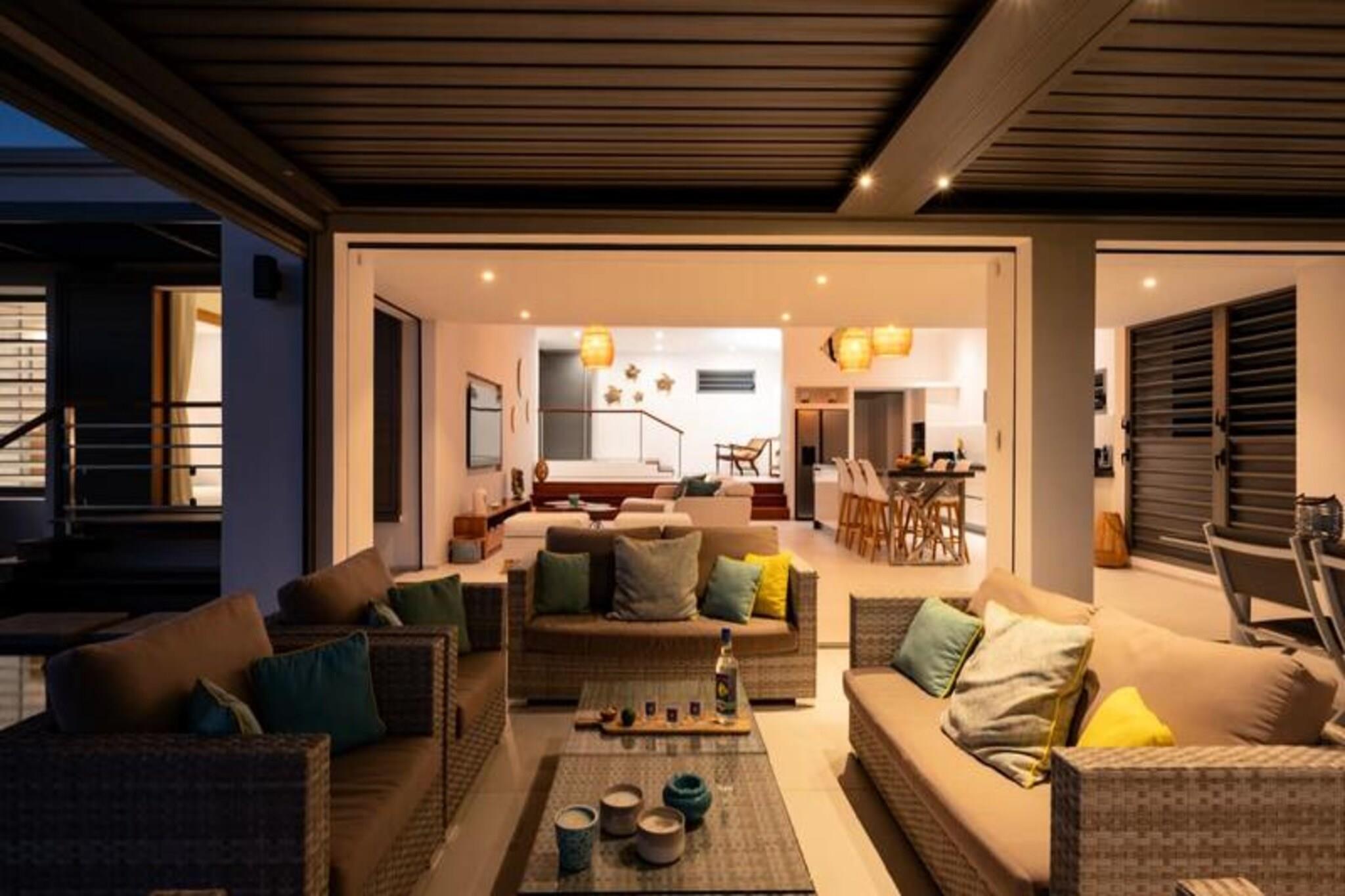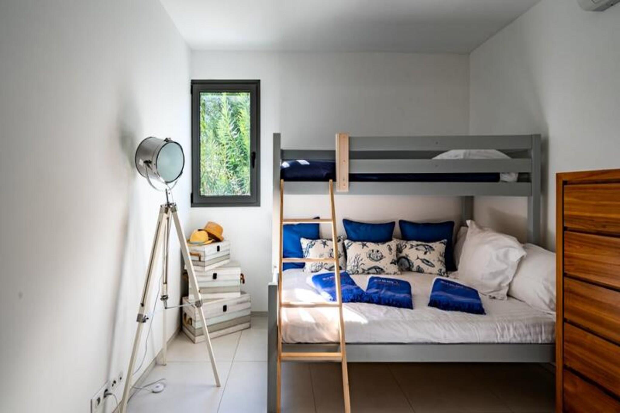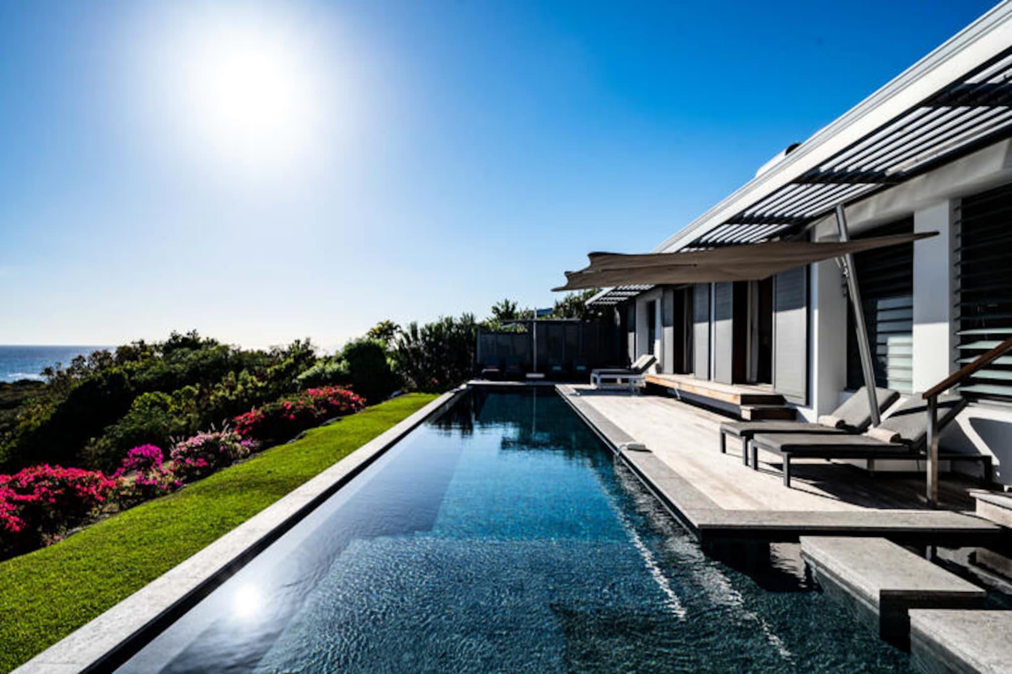 Beliggende på de fredfyldte højder i Les Basses, er Villa Belle Galante et fristed for moderne luksus og caribisk charme. Med sin betagende panoramaudsigt over det turkisblå hav og en infinity-pool, der synes at smelte sammen med horisonten, inviterer denne villa dig til at slappe af i absolut ro. De blide passatvinde og frodige omgivelser skaber en perfekt kulisse for din drømmeferie. Denne moderne villa strækker sig over imponerende 246 m² og har plads til op til 11 gæster fordelt på fem smukt designede soveværelser, der hver har eget badeværelse med bruseniche. Fire af soveværelserne er udstyret med 160 cm senge, mens det femte tilbyder en 140 cm seng og en ekstra 90 cm seng, hvilket gør den ideel til familier eller vennegrupper. Det fuldt udstyrede køkken med sin centrale køkkenø flyder problemfrit over i spiseområdet på den overdækkede terrasse, hvor op til tolv gæster kan nyde måltider, mens de kigger ud over Det Caribiske Hav. Villaens træmøbler og moderne arkitektur tilføjer et strejf af elegance til den indbydende atmosfære. Villaen ligger kun fem minutter fra den charmerende by Grand-Bourg og tilbyder nem adgang til supermarkeder, livlige markeder og dejlige kreolske restauranter. De nærliggende strande Anse Canot og La Feuillère er et must-see, uanset om du ønsker at svømme i krystalklart vand eller prøve kræfter med kitesurfing. For dem, der søger eventyr, kan du udforske lokale romdestillerier, vandre gennem sukkerrørsmarker eller deltage i strandkoncerter under stjernerne. Med sin blanding af komfort, stil og nærhed til det bedste af Marie-Galante lover Villa Belle Galante en uforglemmelig caribisk flugt. Uanset om du slapper af ved infinity-poolen, nyder solnedgange på terrassen eller opdager øens skatte, er denne villa din port til paradis.