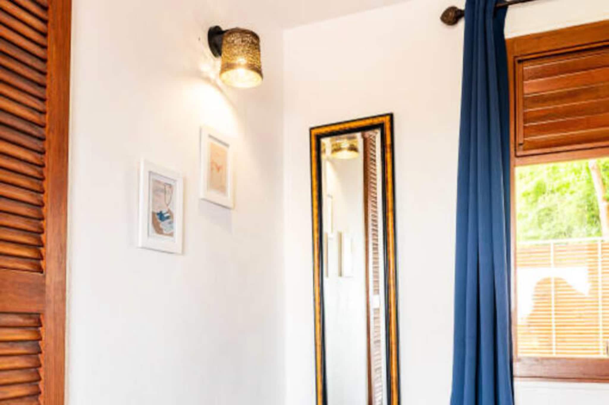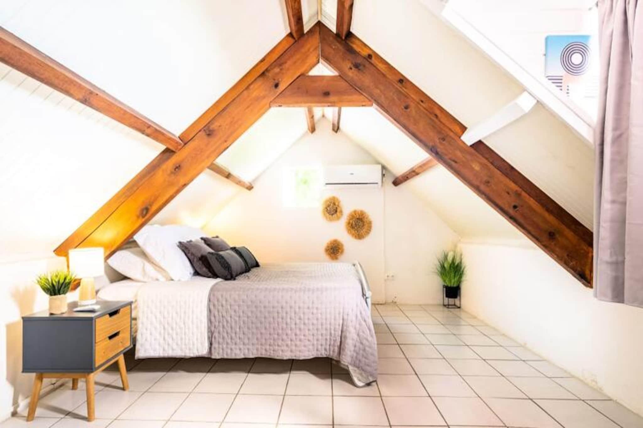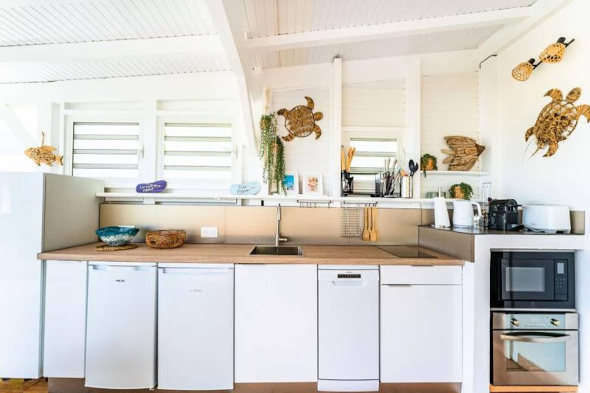 På den fredfyldte ø Marie-Galante, hvor tiden synes at gå langsommere, tilbyder Ti Moca-villaen en rolig oase med betagende udsigt over Les Saintes, Dominica og Guadeloupe. Dette elegante tilflugtssted inviterer dig til at slappe af midt i frodige omgivelser, hvor den blide caribiske brise og lyden af ??bølger sætter tonen for dit ophold. Uanset om du nipper til en morgenkaffe på terrassen eller ser solen synke ned under horisonten, føles hvert øjeblik her som et postkort, der kommer til live. Ti Moca er designet til at rumme op til seks gæster og har tre soveværelser med aircondition, inklusive et charmerende værelse ovenpå, og to veludstyrede badeværelser. Villaens udendørskøkken er et dejligt sted at tilberede måltider, mens spiseområdet er perfekt til at dele latter og lokale delikatesser med dine kære. Den private swimmingpool tilbyder en forfriskende oase, og poolhåndklæder er omhyggeligt udleveret for din bekvemmelighed. Hver detalje, fra villaens luftige layout til dens sengetøj i hotelkvalitet, er blevet kurateret for at sikre maksimal komfort. Ti Moca ligger i Grand-Bourg, kun en kort køretur fra øens mest fantastiske strande, herunder La Feuillère og Anse Canot, hvor turkisblåt vand og blødt sand venter. Den nærliggende landsby tilbyder alle nødvendige faciliteter, fra supermarkeder til kreolske restauranter og pulserende lokale markeder. For naturelskere giver øens vandrestier og sukkerrørsmarker et glimt af dens autentiske charme og naturlige skønhed. Uanset om du søger afslapning, eventyr eller en blanding af begge dele, er Ti Moca den perfekte base for at skabe uforglemmelige minder under den caribiske sol. Kombiner det med den nærliggende Villa Moca for større grupper, og lad øens magi udfolde sig omkring dig.