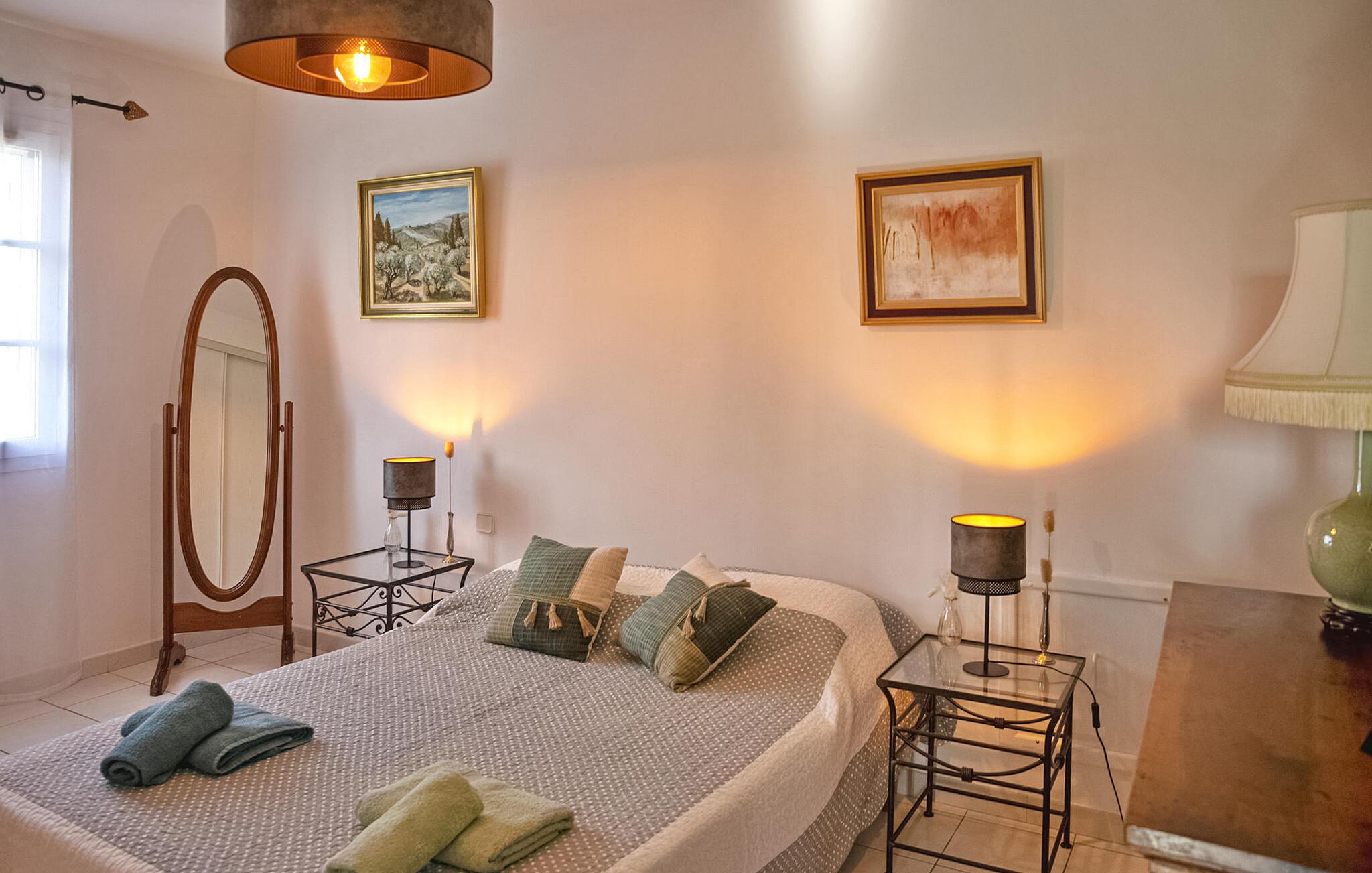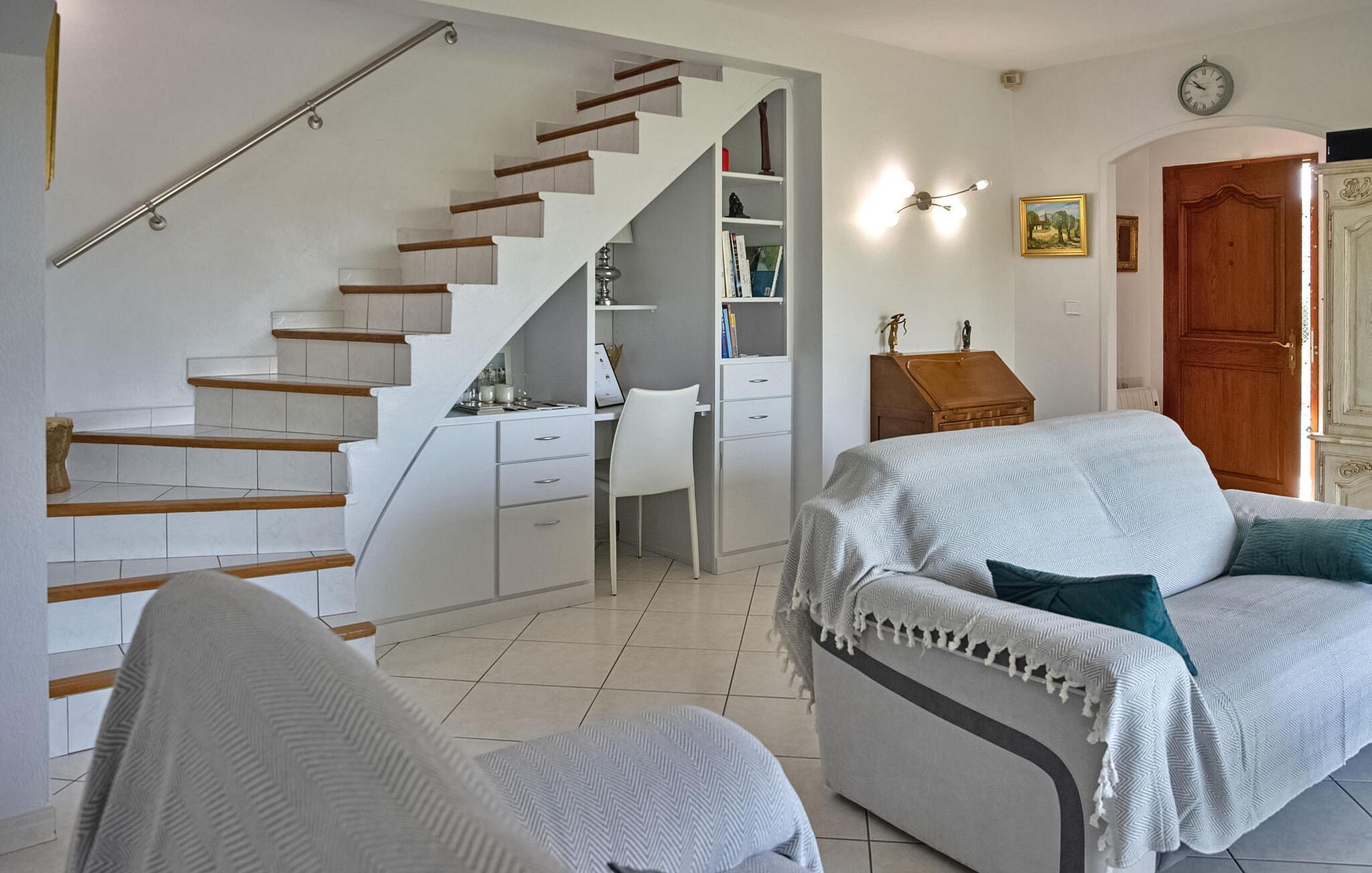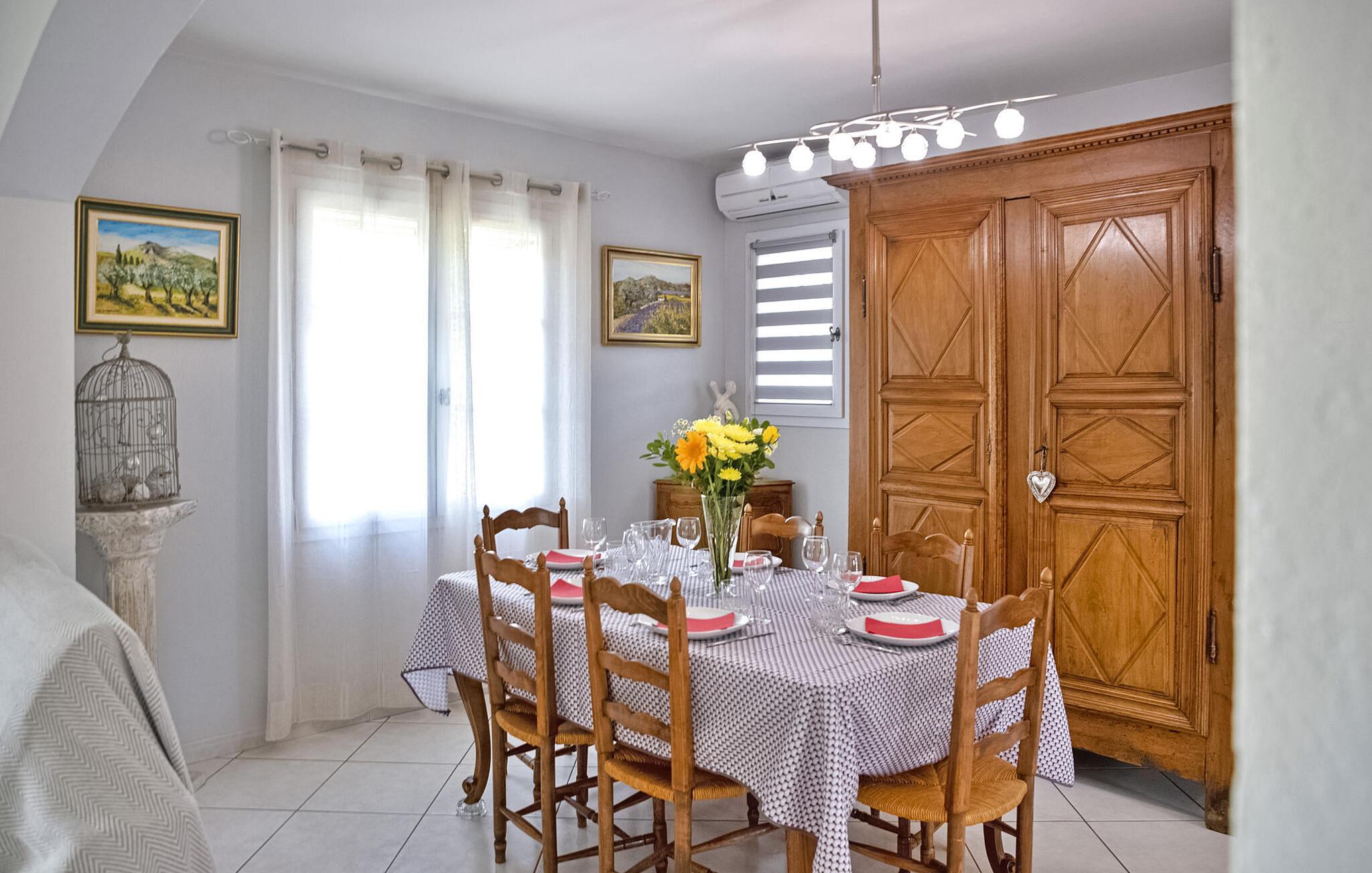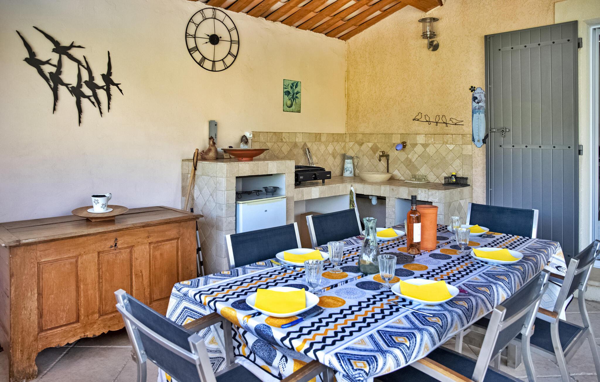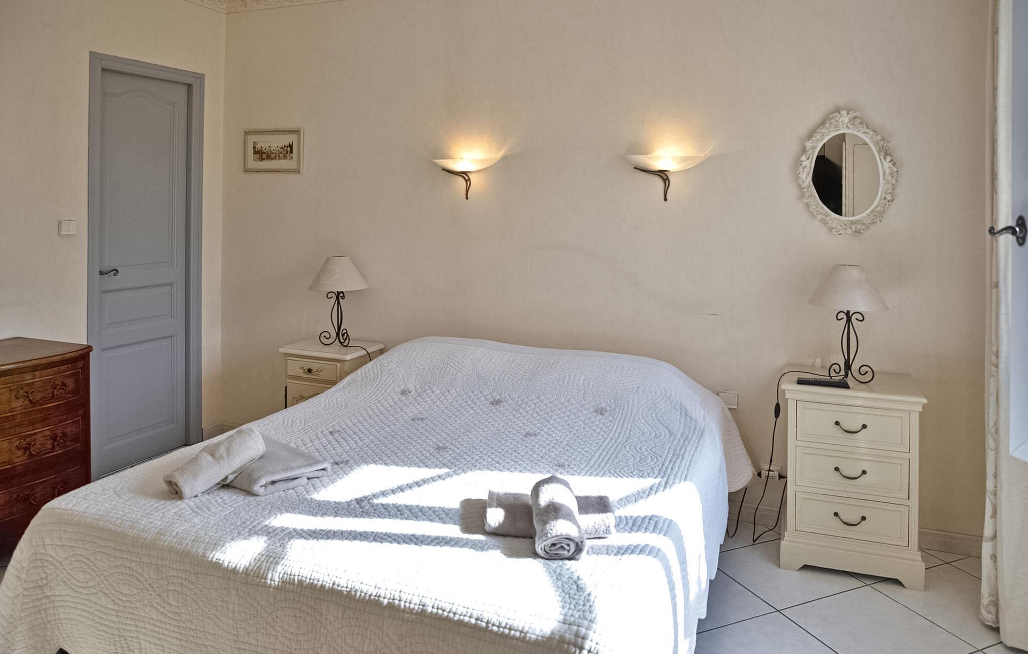 Bekvemt beliggende lige ved vejen, der betjener den nærliggende landsby, er denne traditionelle ferievilla tæt på de lokale faciliteter. Ejendommen er lys og rummelig og tilbyder komfortabel indkvartering og smukke haver, hvor man kan slappe af. Et højdepunkt ved villaen er et poolhus med sommerkøkken og elektrisk grill, perfekt til at nyde alfresco-måltider på lune aftener. Svømmehallen måler 10 mx 5 m med en dybde på op til 1,80 m. Den er sikret med en alarm, og der er seks liggestole og en parasol. Den nærliggende landsby Graveson er en typisk provencalsk landsby med en lille købmand, et par caféer og et marked om fredagen. Omfavn fortryllelsen af denne charmerende feriebolig. Bemærk venligst, at trappen i villaen har et gelænder på den ene side, hvilket efterlader den ene side ubeskyttet, især med små børn.