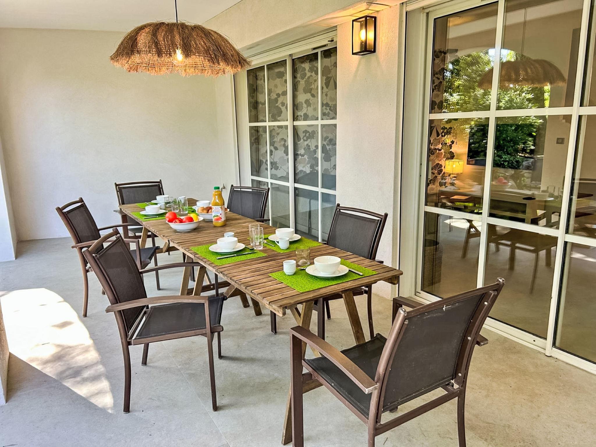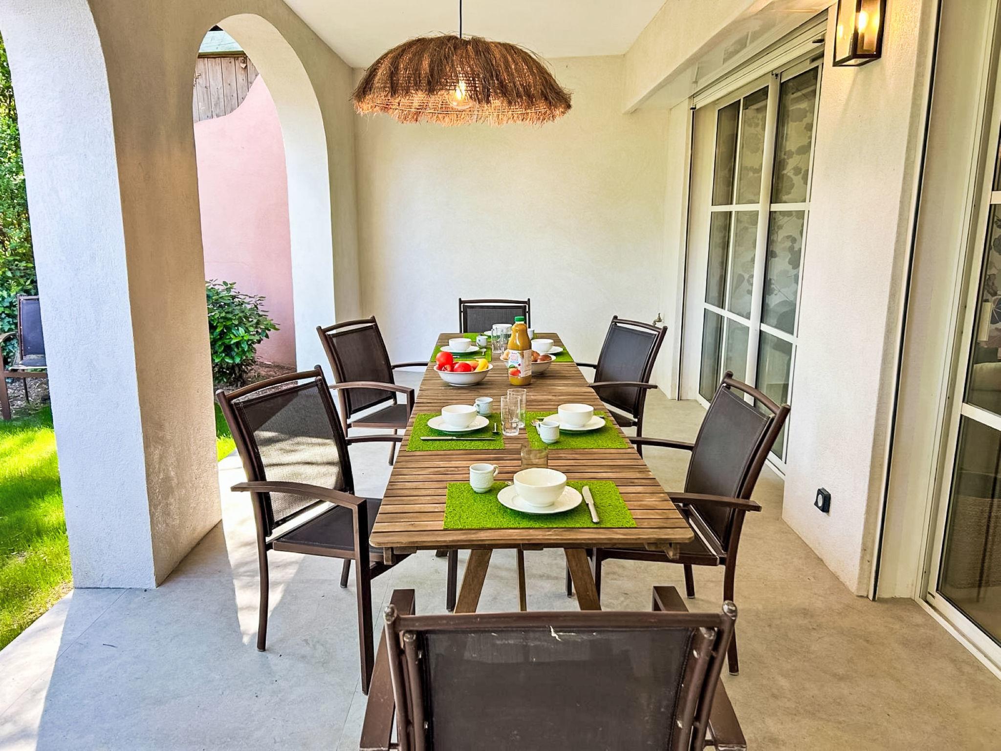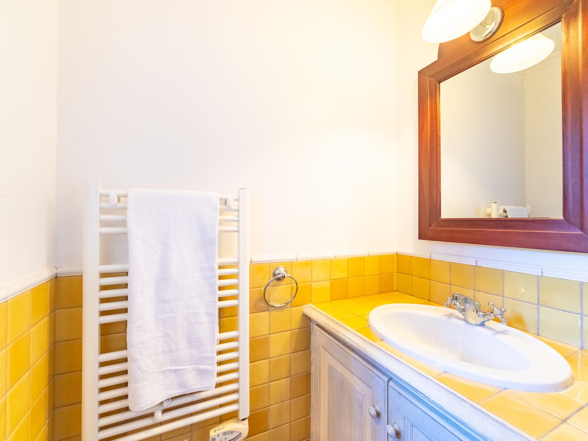 "Les Restanques 6", 3-room terraced house 75 m2 on 2 levels. Comfortable furnishings: living/dining room with 1 sofabed (160 cm, length 190 cm), TV (flat screen). Exit to the terrace. Kitchen (oven, dishwasher, 4 ceramic glass hob hotplates, microwave, freezer, electric coffee machine). Sep. WC. Upper floor: 1 room with 1 french bed (160 cm, length 200 cm). 1 room with 2 beds (90 cm, length 200 cm). Exit to the terrace. Bathroom, sep. WC. Electric heating, air-conditioning. 2 terraces 15 m2, patio 35 m2. Terrace furniture. Parking. Please note: smoke alarm. 8306800049037