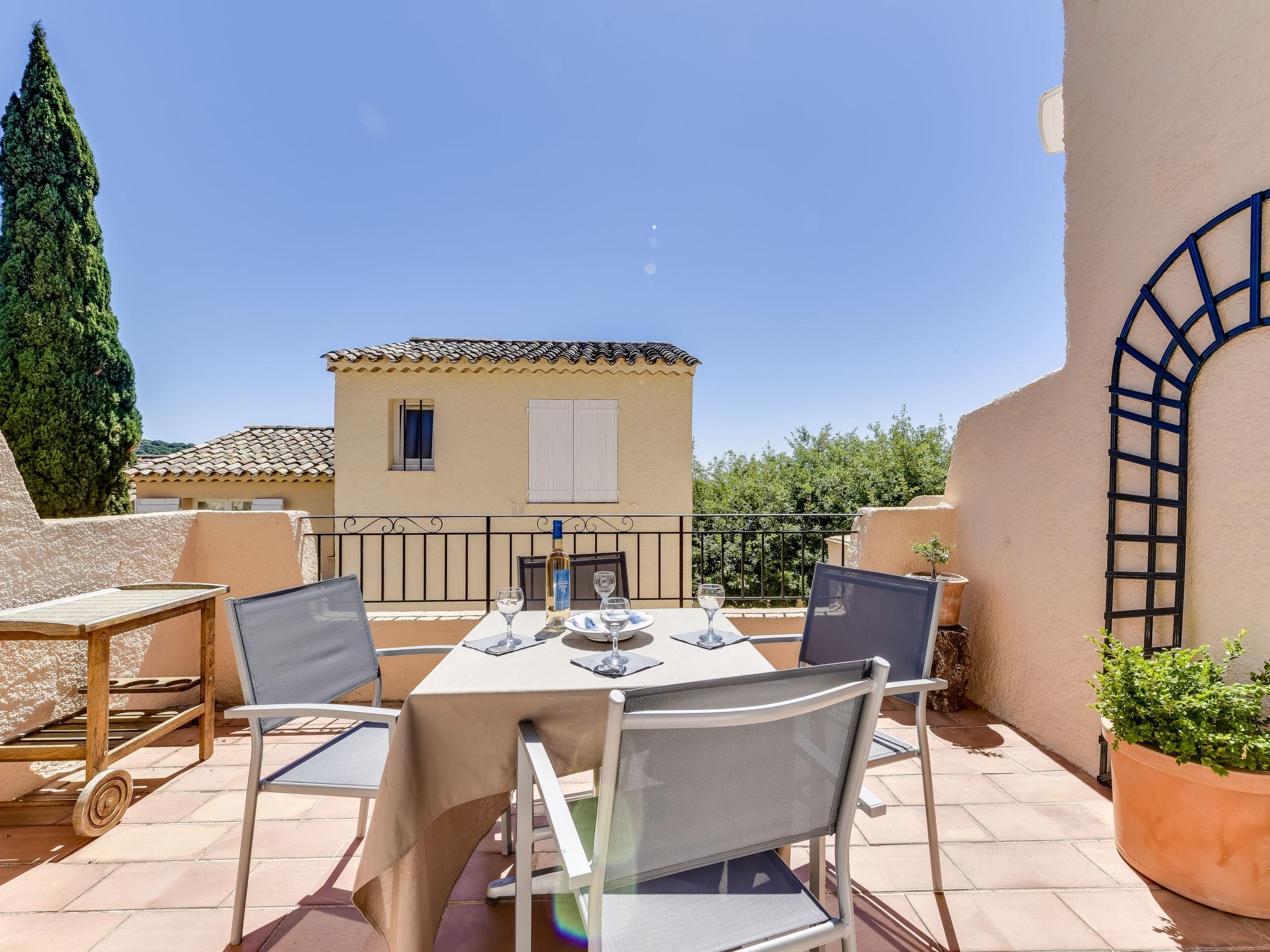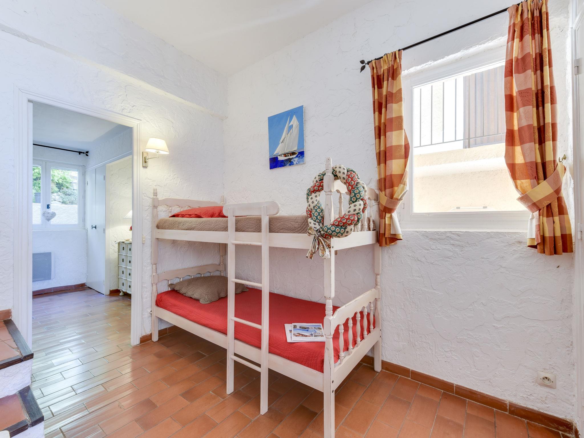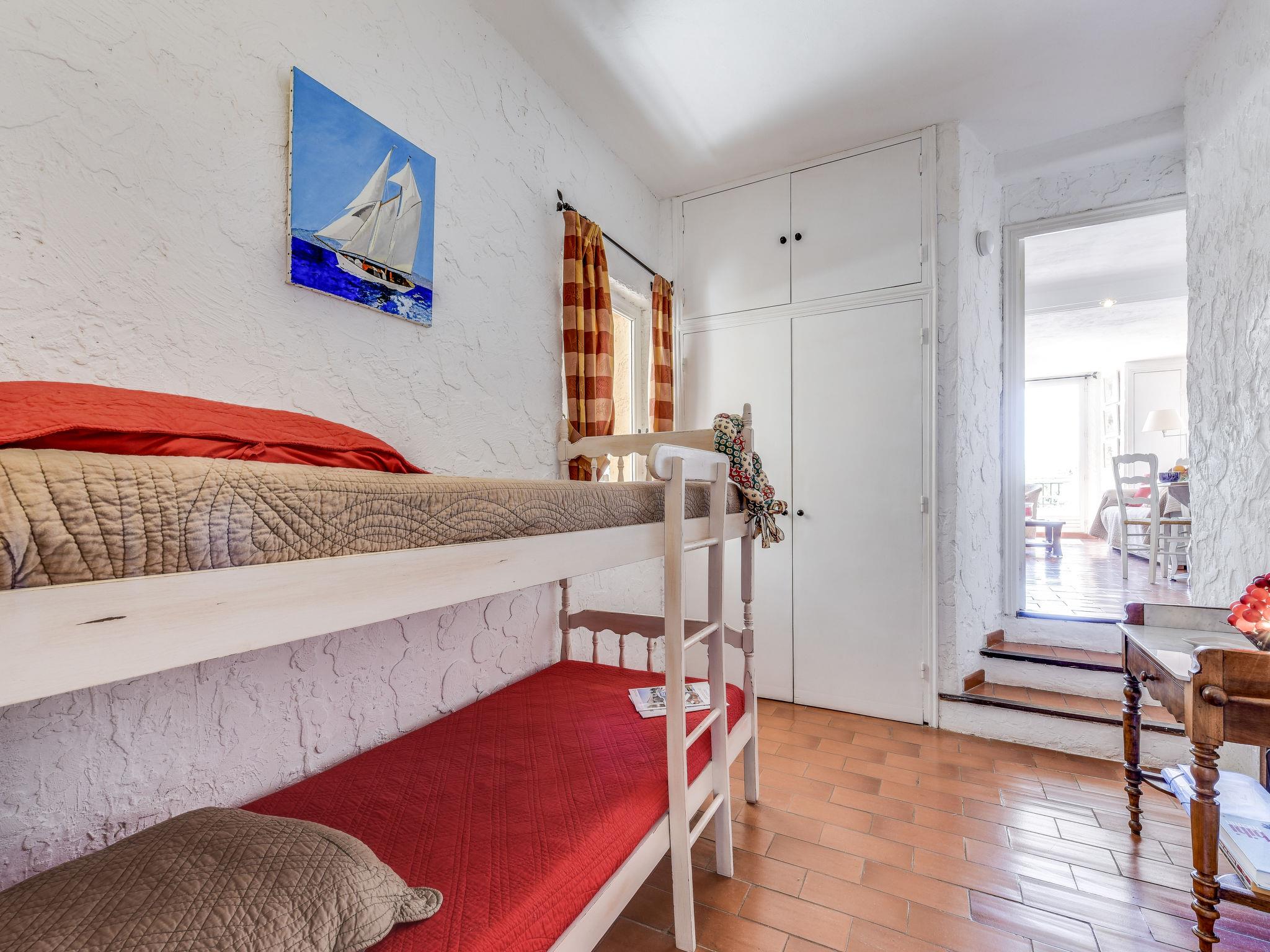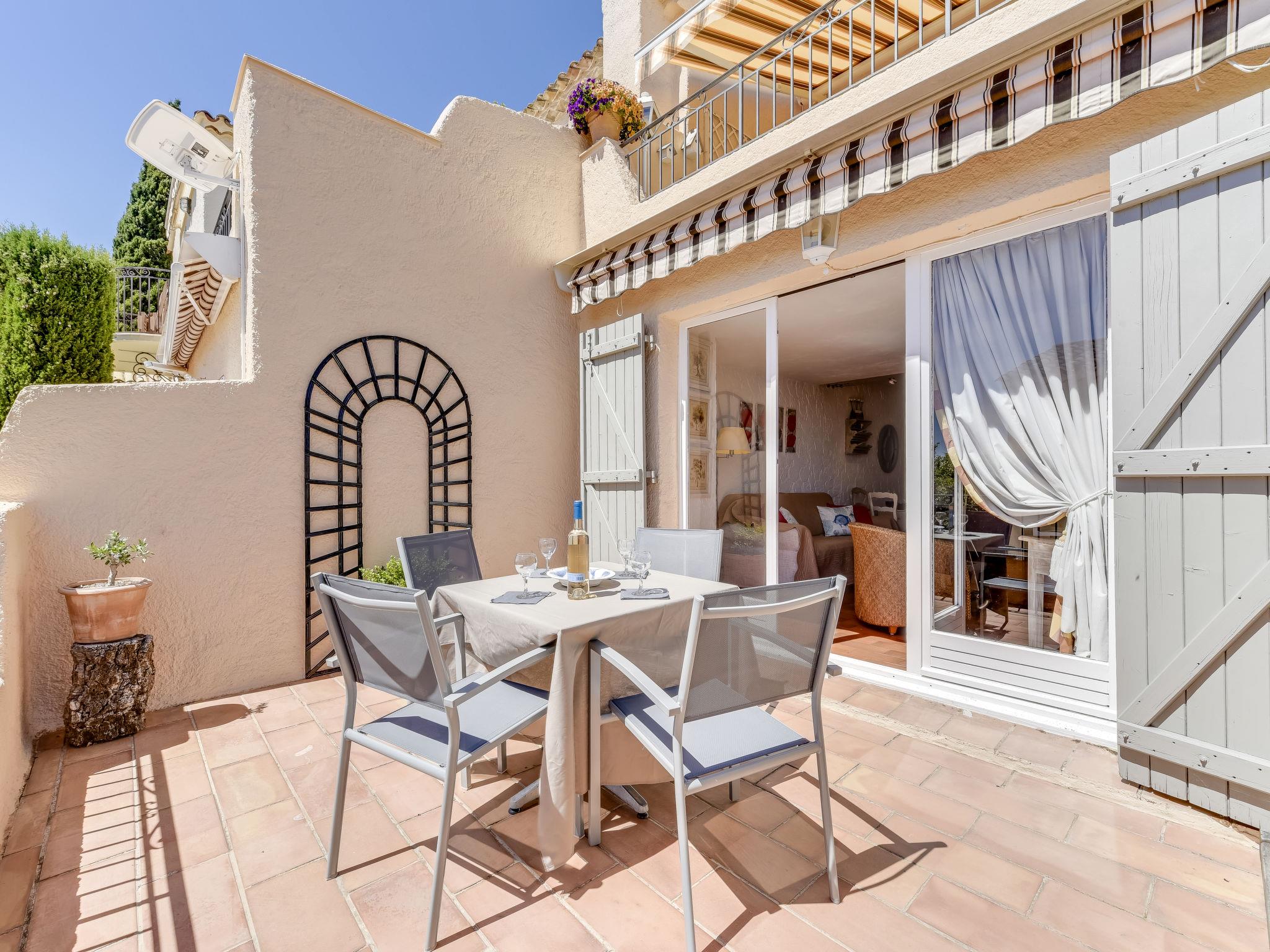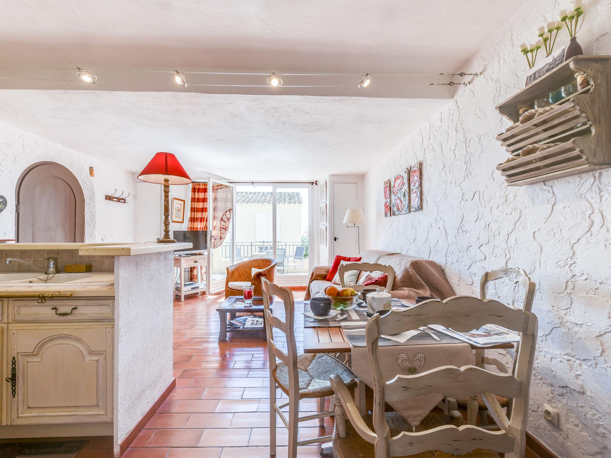 "Village de Silhouette 4", 3-room apartment 50 m2 on 1st floor. Cosy furnishings: living/dining room with TV (flat screen), air conditioning. Exit to the terrace. Sleeping alcove with 1 x 2 bunk beds (90 cm, length 190 cm). Interconnecting room with 1 french bed (160 cm, length 190 cm), air conditioning. Open kitchen (oven, dishwasher, 4 ceramic glass hob hotplates, microwave, electric coffee machine). Bathroom, sep. WC. Electric heating. Terrace 13 m2, south-east facing position. Terrace furniture, barbecue. Facilities: washing machine. Internet (WiFi, free). Parking. Please note: non-smokers only. Smoke alarm. Access to the double bedroom through the small bedroom with bunk beds. 83068000517LB
