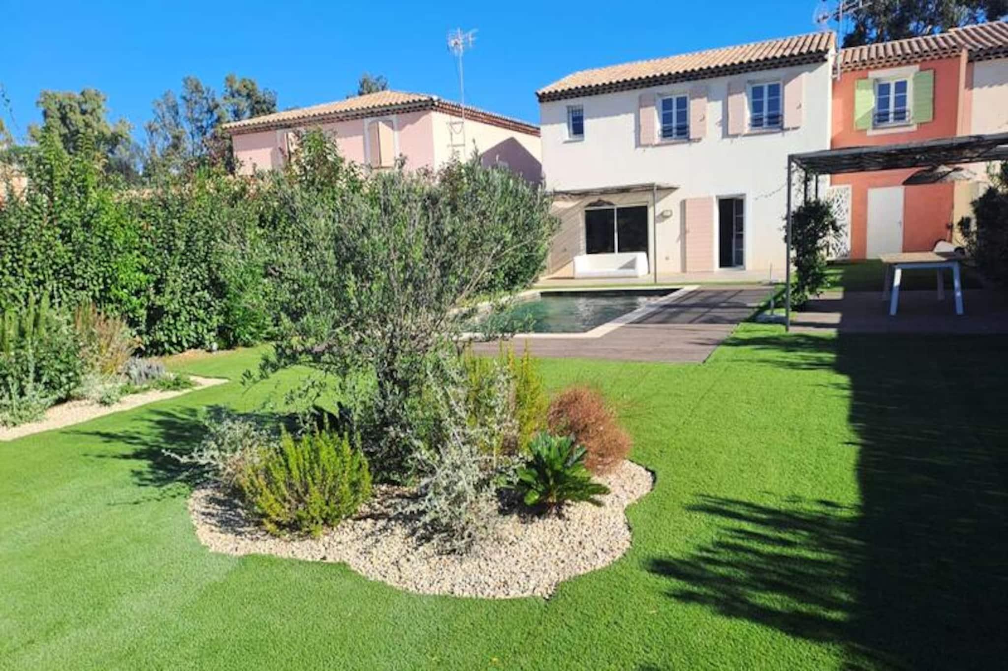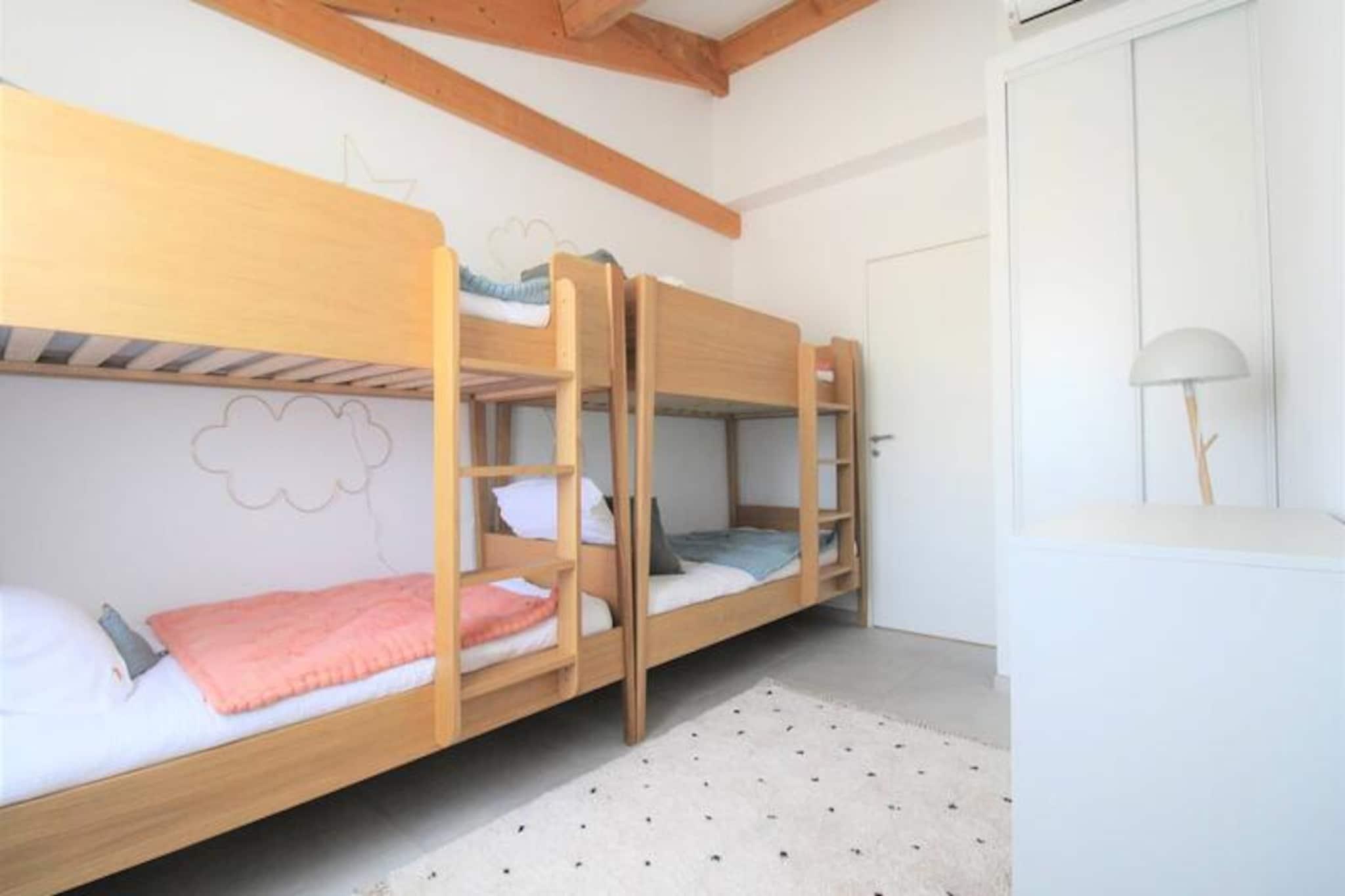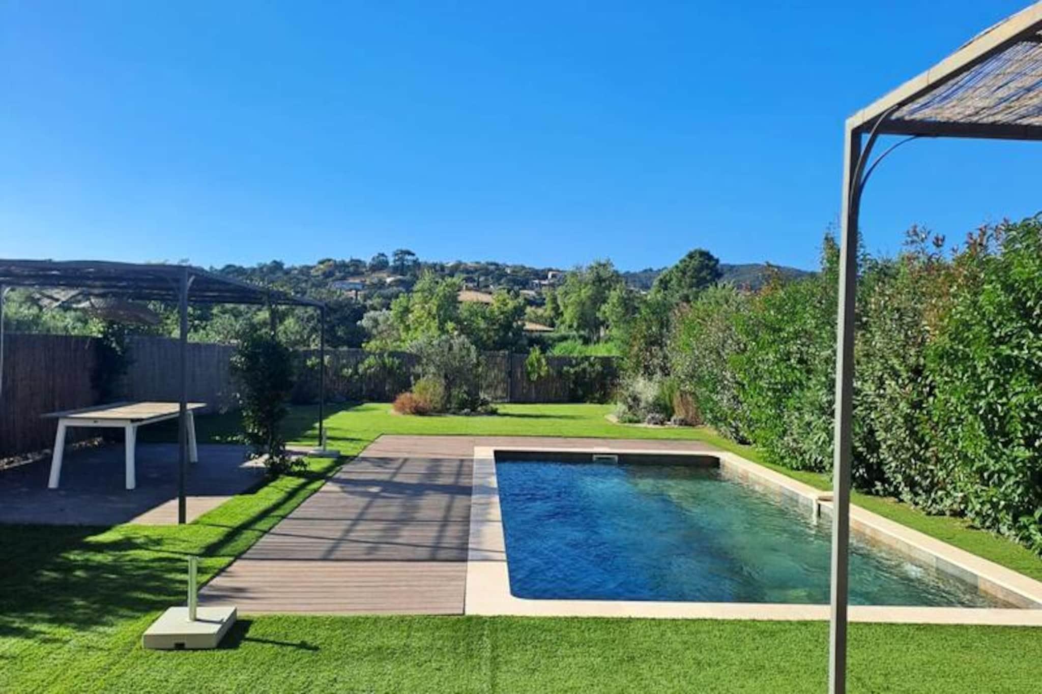 Dette moderne feriehus ligger kun 500 meter fra stranden og tilbyder et sikkert, fuldt indhegnet miljø med privat garage og to ekstra parkeringspladser. Ejendommen har fire komfortable soveværelser: en mastersuite med badeværelse og påklædningsværelse, et soveværelse med fire enkeltsenge, der er ideelle til børn, og to soveværelser med dobbeltsenge (160 cm). Hjemmet rummer komfortabelt familier og grupper, hvilket giver rummelige og indbydende rammer for en afslappende ferie. Kæledyr er ikke tilladt i denne ejendom, og det er et ikke-ryger område. Huset er perfekt placeret i hjertet af Saint-Tropez-bugten, omgivet af en række attraktioner. Den smukke Prairies de la Mer-strand ligger kun en kort gåtur væk, og gæsterne kan nyde nærliggende butikker, restauranter, vandaktiviteter og endda en bowlingbane. Port Grimaud er kun 2 km væk, Saint-Tropez er 6 km, og Sainte-Maxime er 9 km, tilbyder masser af muligheder for sightseeing og underholdning. Indvendigt kan boligen prale af en stor stue på 45 m² med åbent køkken fuldt udstyret med vaskemaskine, opvaskemaskine, mikroovn, Nespresso kaffemaskine og traditionel ovn. Huset indeholder to badeværelser, et ensuite og et separat, og er udstyret med reversibel aircondition i alle værelser for komfort. Den store private have omfatter en 4x8 meter pool omgivet af et afslappende loungeområde, ideelt til at slappe af efter en dag med udforskning.