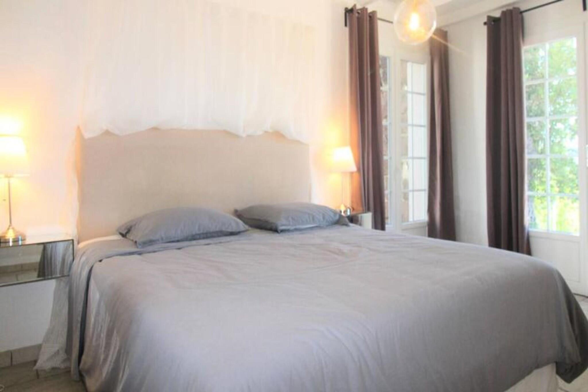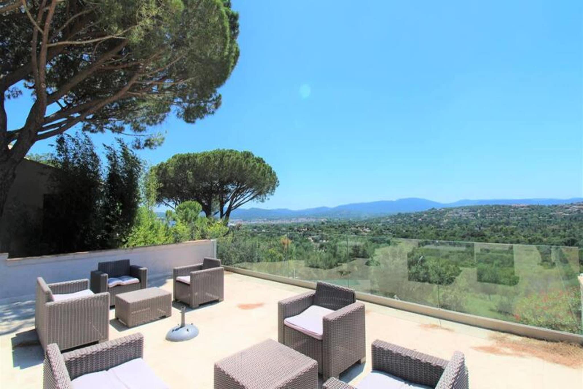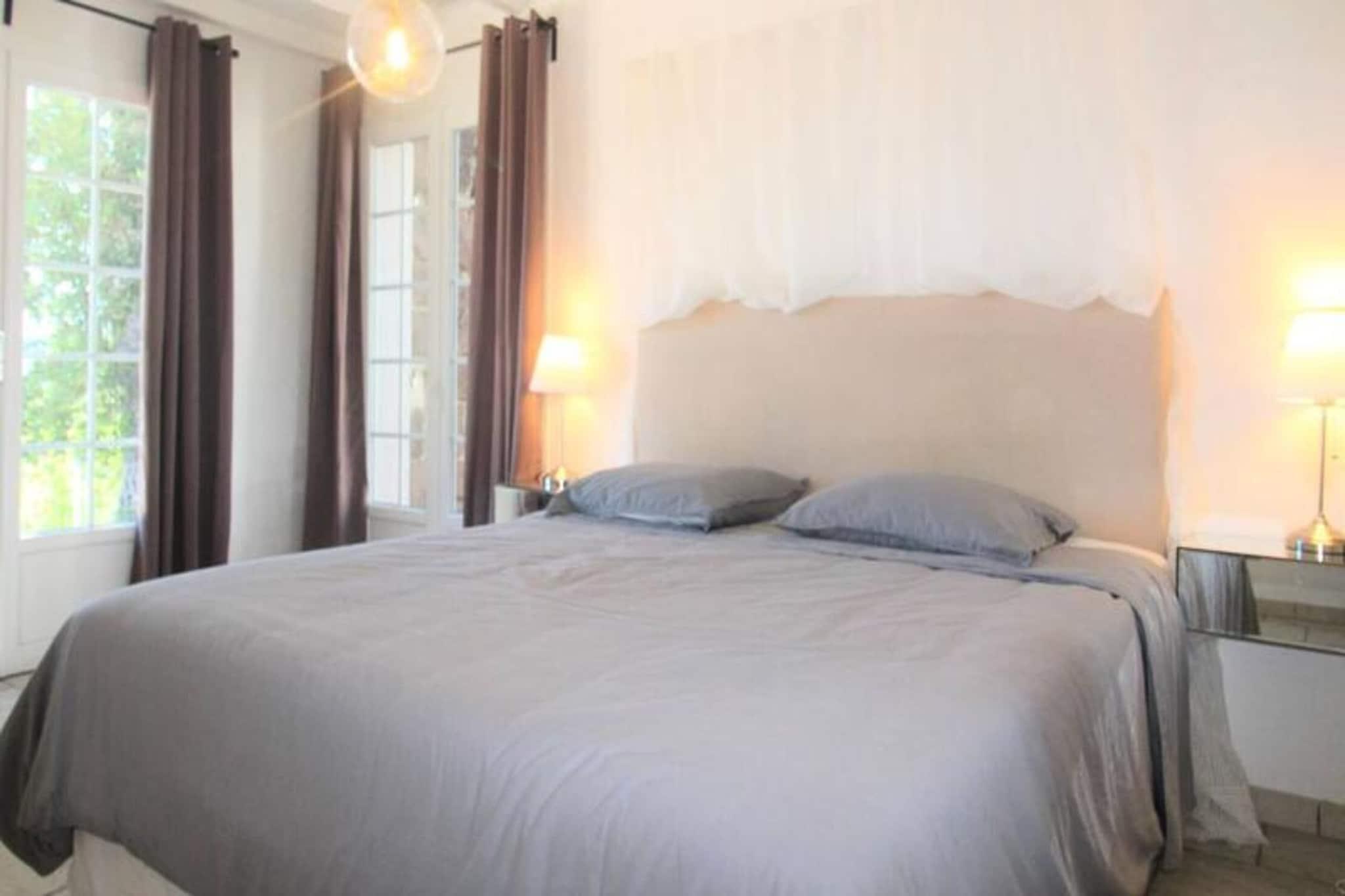 Denne fredelige villa med aircondition tilbyder de perfekte rammer for en afslappende ferie. Beliggende på højderne af Grimaud, villaen omfatter tre komfortable soveværelser: et master soveværelse med en 180x200 seng og en-suite badeværelse, et andet soveværelse med to 90x200 senge, og et tredje soveværelse med en 160x200 seng. Hvert værelse har aircondition for ekstra komfort. Ejendommen er kæledyrsvenlig med en ekstra mulighed for din lodne ledsager. Villaen byder på rigelig udendørs plads med en stor terrasse, panoramaudsigt og en swimmingpool. Denne villa ligger kun 11 km fra Saint-Tropez og er ideelt placeret til at udforske det omkringliggende område. Strandene i Pampelonne (20 minutter), Grimaud (9 minutter) og Sainte-Maxime (15 minutter) er alle let tilgængelige. Den charmerende landsby Grimaud byder på lokale caféer, restauranter og markeder, perfekt til at nyde regionens mad og kultur. Villaens førsteklasses beliggenhed sikrer et fredeligt tilflugtssted med nem adgang til den pulserende atmosfære i Saint-Tropez-bugten. Villaens åbne planløsning omfatter et rummeligt opholds- og spiseområde, der fører til terrassen, hvor du kan nyde en udendørs lounge og spiseplads. Køkkenet er fuldt udstyret og løber ud i den lyse stue. Yderligere faciliteter omfatter et fladskærms-tv, Wi-Fi, et udendørs vaskerum og en udendørs bruser. Fra terrassen fører et par trin dig ned til swimmingpoolen og området til solbadning.