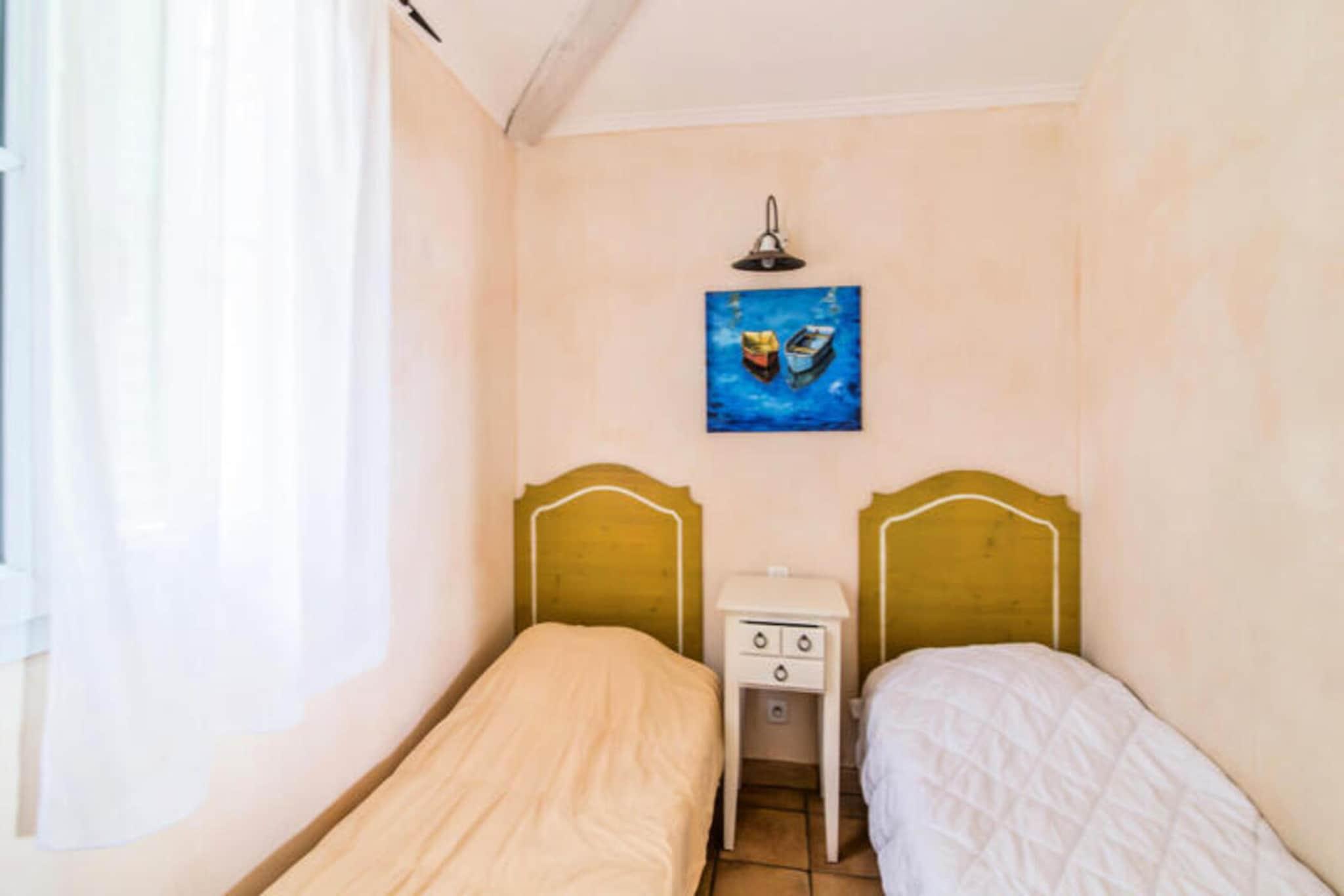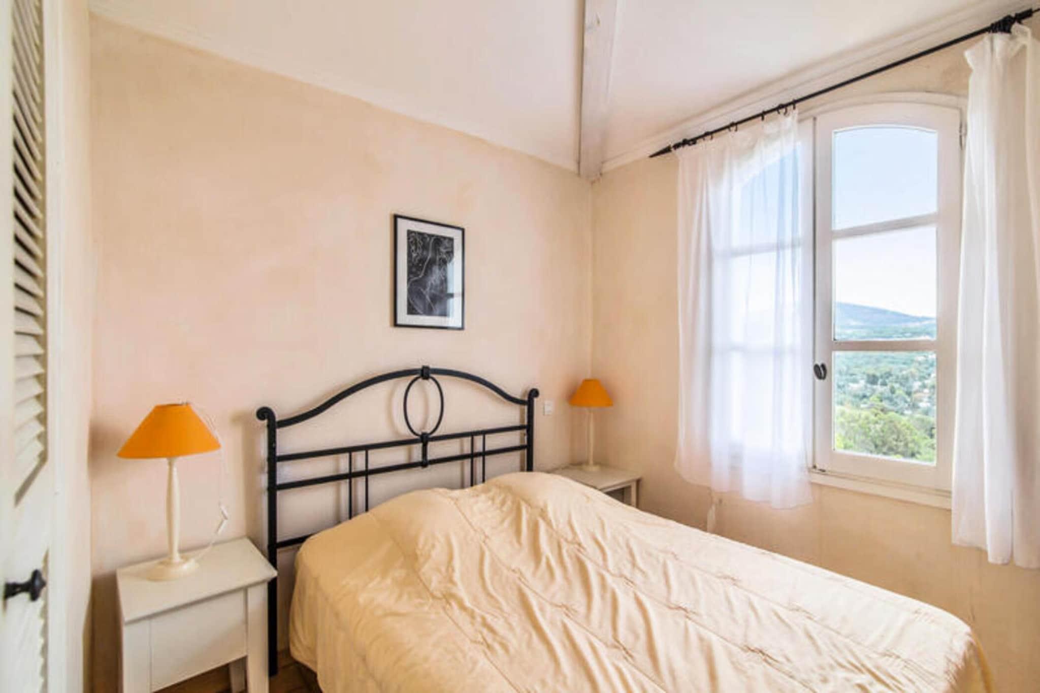 Dette rummelige feriehus ligger i det fredfyldte Bastides-distrikt p? en 25 hektar stor skovbevokset ejendom, der tilbyder rigelig plads til op til 8 personer. Ejendommen har 3 sovev?relser, 2 badev?relser og en komfortabel stue. K?ledyr er tilladt mod et ekstra gebyr, og en gratis overd?kket parkeringsplads er inkluderet, afh?ngigt af tilg?ngelighed. For ekstra komfort kan g?sterne nyde en privat terrasse med smuk udsigt, ideel til at slappe af udend?rs. Denne bolig ligger kun 3 km fra stranden og giver adgang til n?rliggende attraktioner, herunder den pulserende by Saint-Tropez, der er ber?mt for sine caf?er, butikker og livlige atmosf?re. Omr?det byder ogs? p? adskillige markeder og spisesteder, perfekt til at udforske den lokale kultur og nyde friske r?varer. Derudover byder boligen p? et stort vandomr?de med et b?lgebassin og en opvarmet swimmingpool, perfekt til familiehygge. Indenfor er feriehuset veludstyret med et fuldt m?bleret k?kken og en r?kke v?sentlige faciliteter, herunder en vaskemaskine. Badev?relserne har badekar og bruser, mens ejendommen tilbyder valgfri tjenester s?som sengelinned, h?ndkl?der og et babys?t. Boligen tilbyder ogs? aktiviteter omkring pools, hvilket sikrer sjov for g?ster i alle aldre.