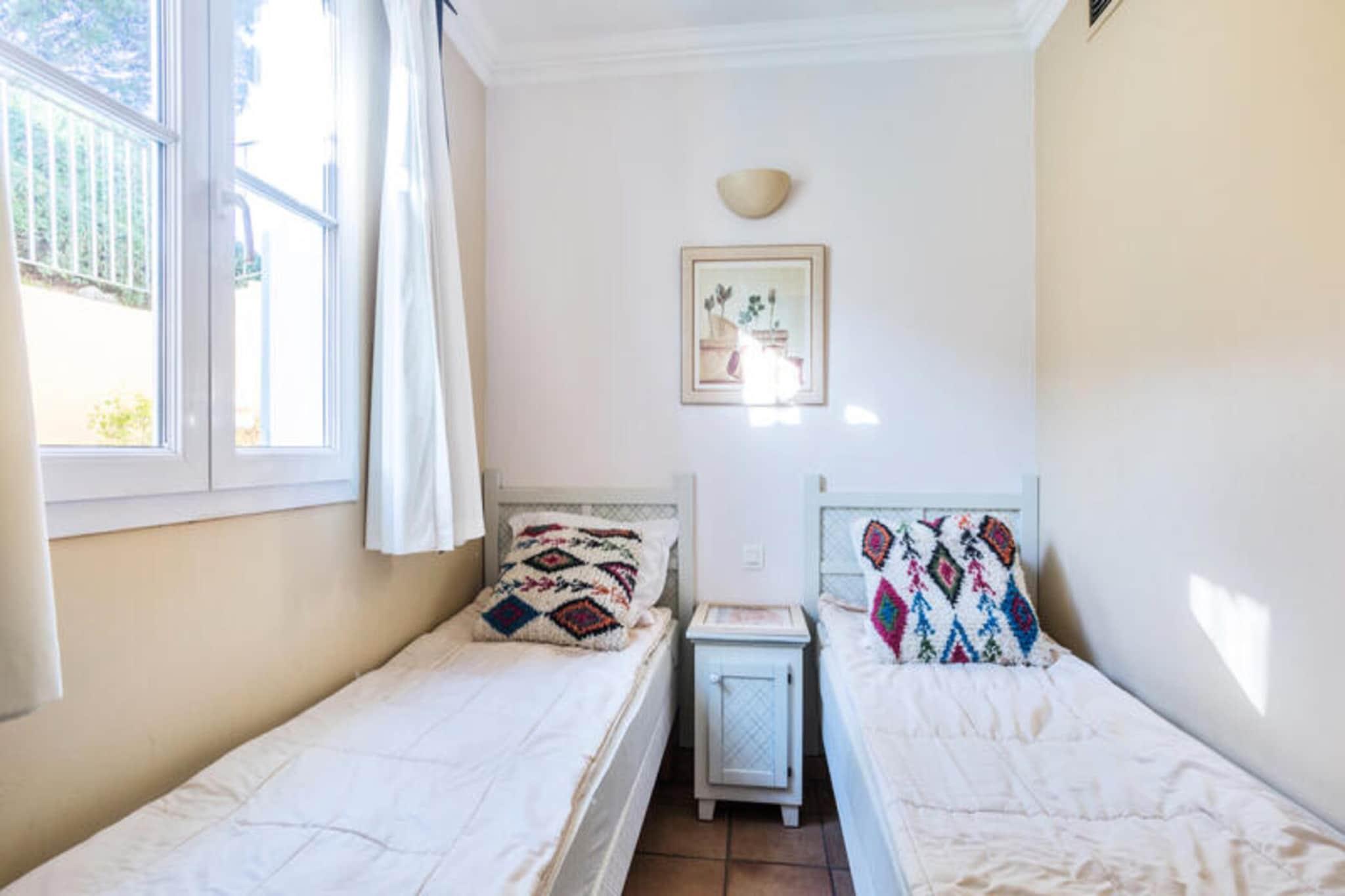 Dette charmerende feriehus ligger på en smuk 25 hektar stor skovbevokset ejendom, der tilbyder et perfekt tilflugtssted for familier eller venner. Den rummelige lejlighed på 65 m² har en stue med en sovesofa, en spiseplads med plads til seks og to soveværelser - det ene med en dobbeltseng og det andet med to enkeltsenge. Der er to badeværelser, det ene med badekar og det andet med bruser samt separat toilet. Kæledyr er tilladt, og boligen har en overdækket terrasse med havudsigt og en have. Parkering er tilgængelig for gæster i boligen, afhængigt af tilgængelighed. Blot 3 km fra stranden tilbyder boligen en fantastisk udsigt over Middelhavets bugt. Gæsterne kan nyde nærliggende attraktioner såsom landsbyerne Croix Valmer, Grimaud og Ramatuelle, perfekt til aftenture eller spisning på lokale restauranter. For eventyrlystne er aktiviteter som windsurfing, ridning og vandreture let tilgængelige. Luna Park tivoli og Grimaud havn er også gode muligheder for familieudflugter. Inde i lejligheden finder du et fuldt udstyret køkken, ideelt til at tilberede måltider under dit ophold. Opholdsstuen er lys og smagfuldt indrettet, hvilket giver en behagelig plads til afslapning. Boligen har to swimmingpools: et bølgebassin med rutsjebaner (åbent 1. maj – 15. september) og en opvarmet pool (åbent 6. april – 30. september). Yderligere faciliteter omfatter gratis parkering, Wi-Fi (tilgængelig mod et ekstra gebyr) og adgang til tv.