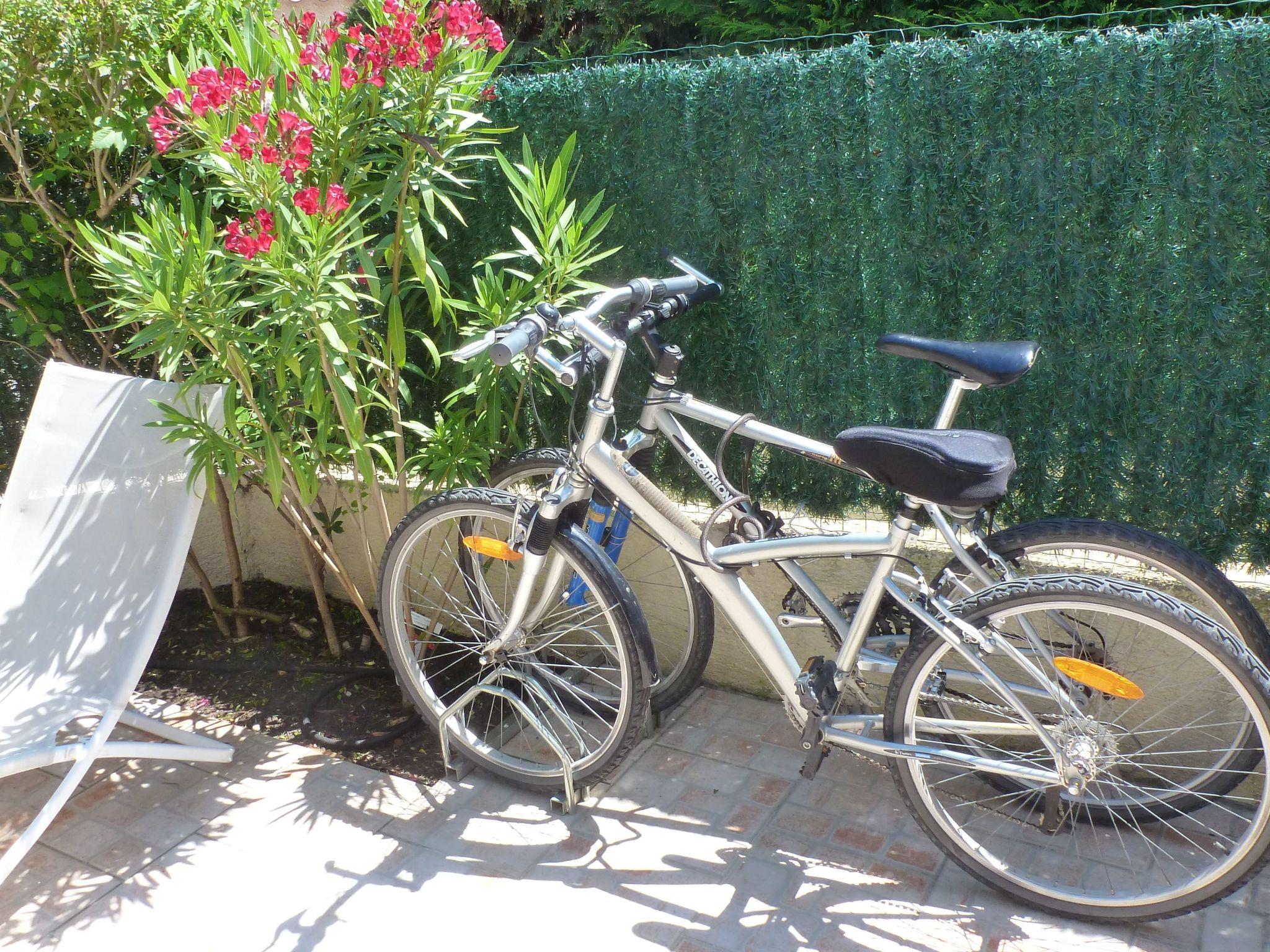 a barbecue, garden furniture: table and chairs for 6 people under a pergola, two sun loungers with a small table, a parasol, a 2-seater bicycle rack.