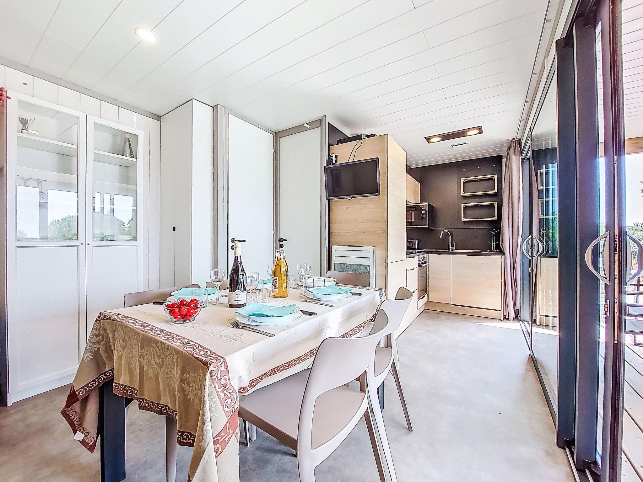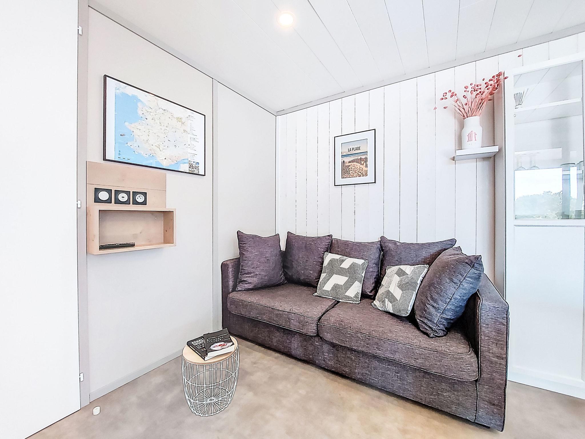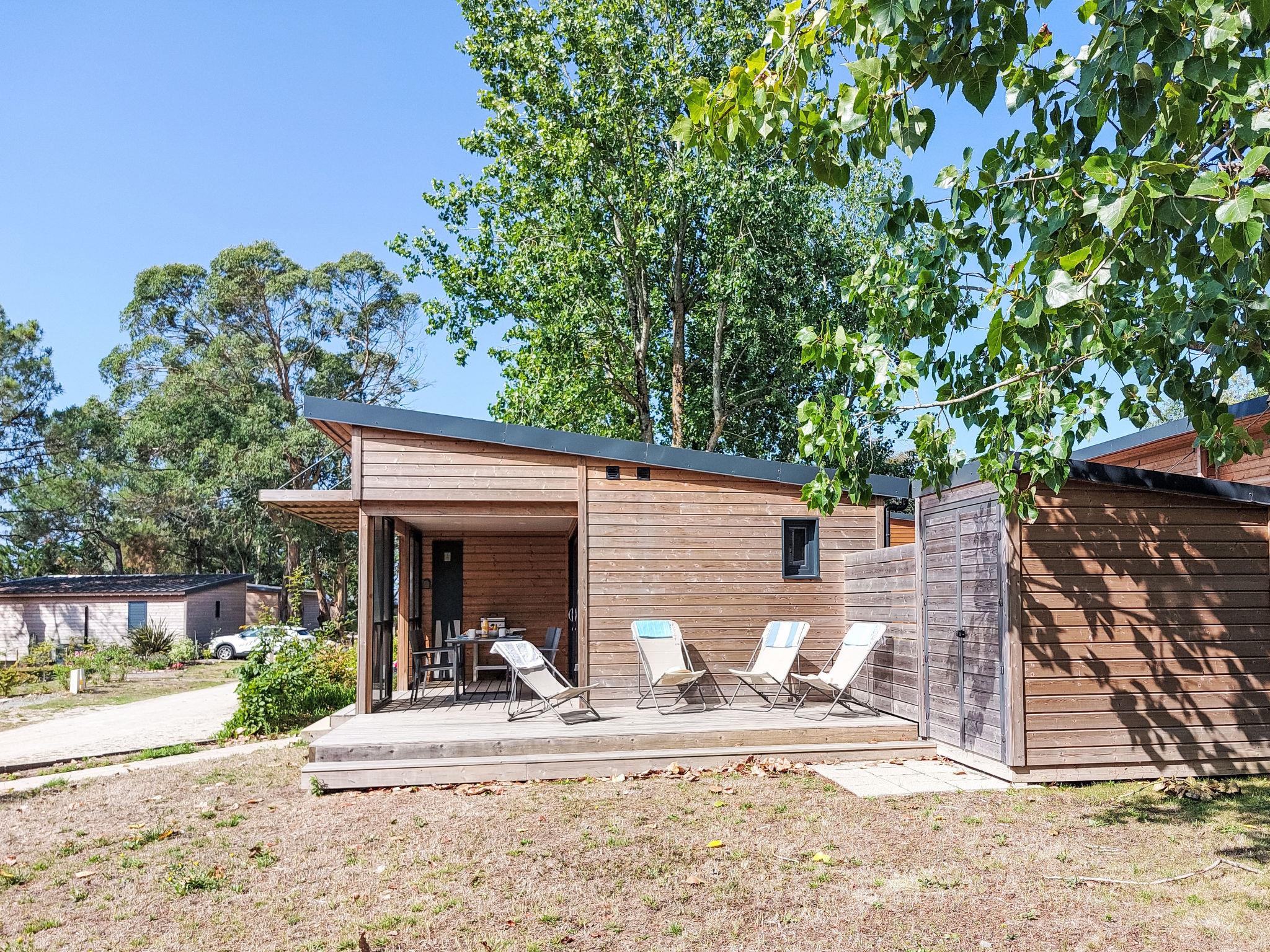 "Chalet moderne La Baule-Guérande", 3-room chalet 48 m2. Very beautiful furnishings: living room with panoramic window with dining nook and TV (flat screen). Exit to the terrace. 1 room with 1 french bed (160 cm, length 200 cm). 1 room with 2 beds (80 cm, length 200 cm), 1 bunk beds (80 cm, length 200 cm) (1 pers.). Open kitchen (oven, dishwasher, 4 ceramic glass hob hotplates, toaster, kettle, microwave, freezer, electric coffee machine). Shower, sep. WC. Electric heating. Large terrace 22 m2 partly roofed, south facing position. Terrace furniture, electric barbecue (portable), deck chairs (4), box-room. Facilities: washing machine, children's high chair, baby cot for up to 2 year olds, hair dryer. Internet (WiFi, free). Parking space n 36. Please note: non-smokers only. Smoke alarm. Offer by a private individual according to Art. 155, IV of CGI.