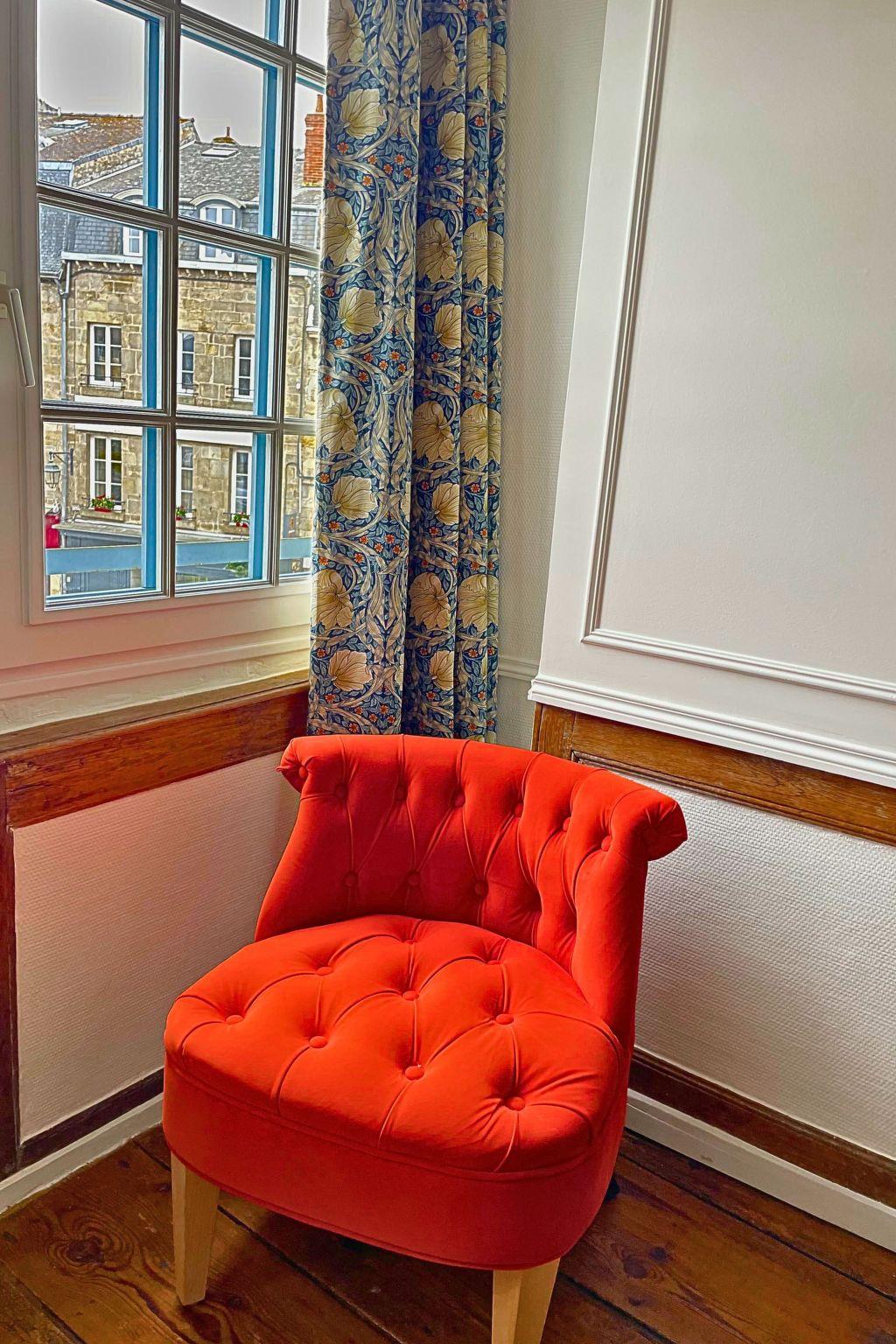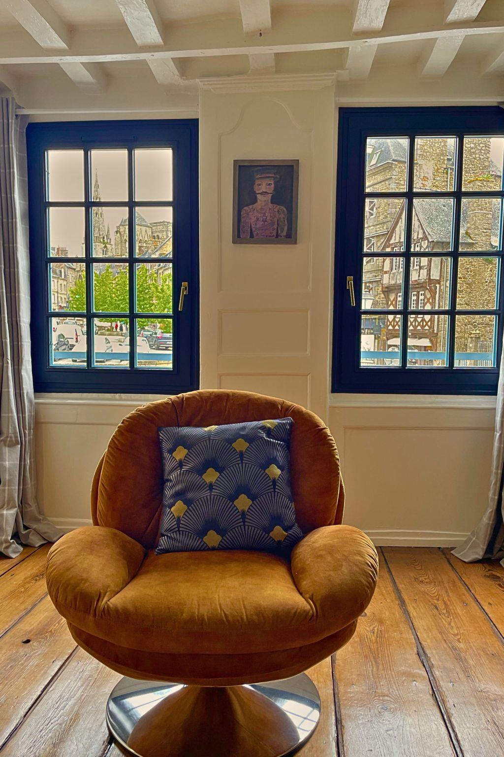 After crossing the small private courtyard, you can climb up to the living room and kitchen on the 1st floor, with its lovely, unobstructed view over the main square in the historic heart of Guingamp.