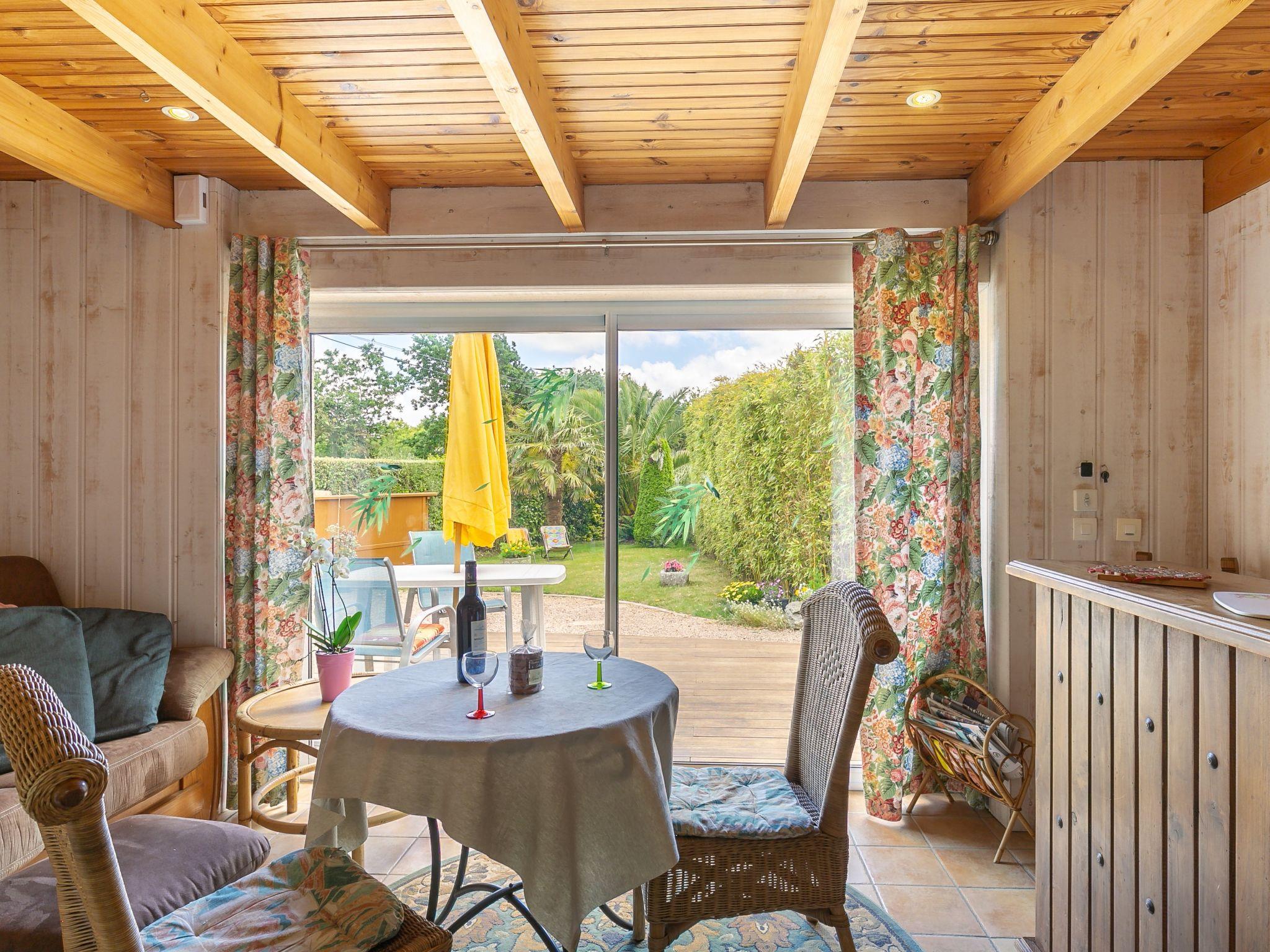 "Les Bambous", 3-room house 60 m2 on 2 levels. Rustic and cosy furnishings: living/dining room with Scandinavian wood stove, dining table, satellite TV and hi-fi system. Exit to the terrace. 1 room with 1 french bed (160 cm, length 190 cm), hand-basin. Open kitchen (oven, dishwasher, 4 ceramic glass hob hotplates, toaster, kettle, microwave, freezer, electric coffee machine) with dining table. Shower, sep. WC. Upper floor: 1 room with sloping ceilings, ceiling height 180 - 200 cm with 2 beds (90 cm, length 160 cm). Sep. WC. Electric heating. Parquet floors. Terrace, south facing position. Terrace furniture, barbecue (portable), deck chairs (2). Facilities: washing machine, iron, children's high chair, baby cot. Internet (WiFi, free). Please note: non-smoking house.