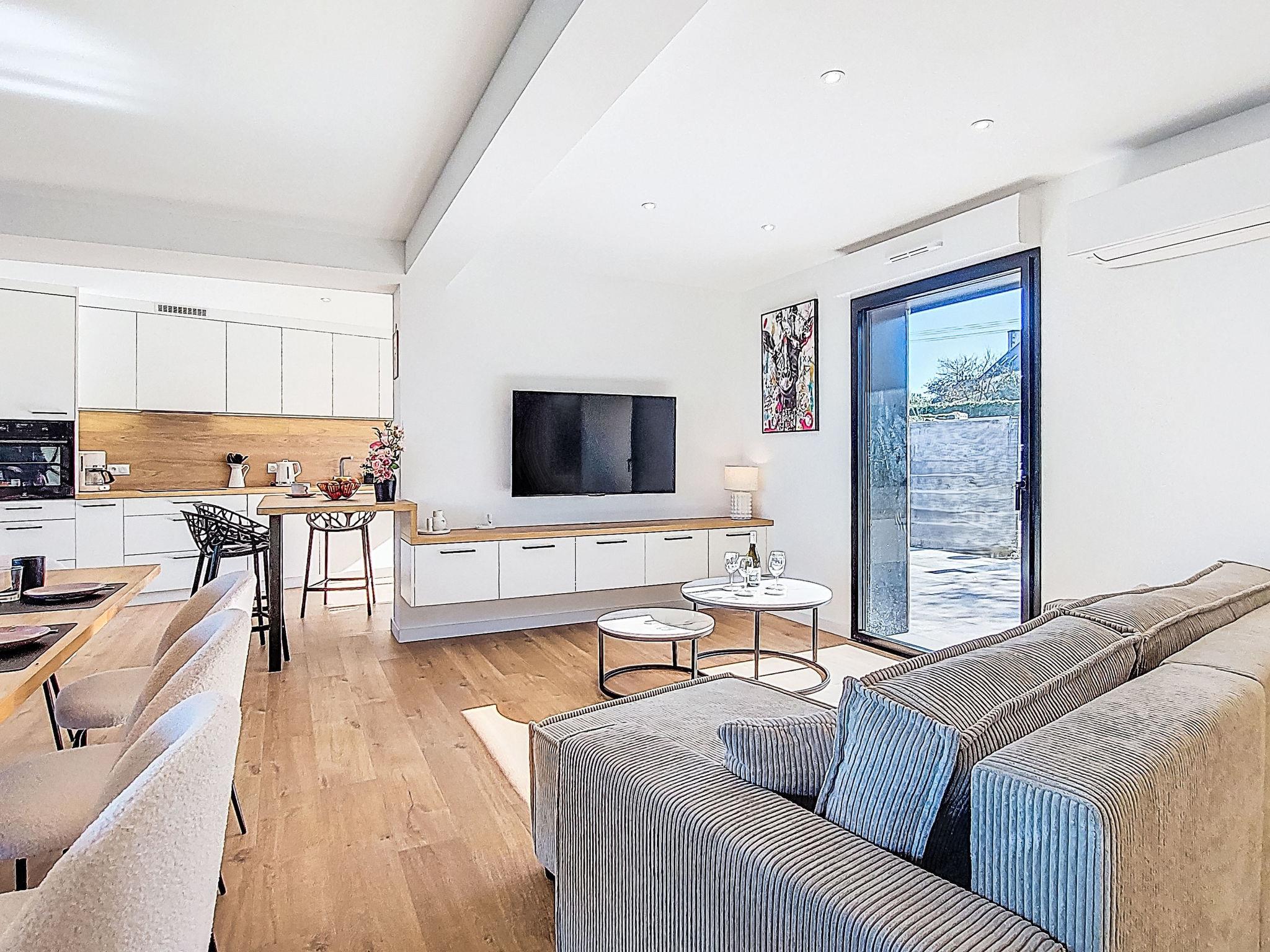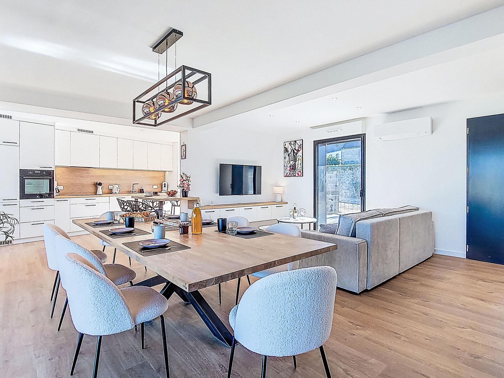 "Ty Béthanie", 5-room house 130 m2. Spacious and bright, comfortable and tasteful furnishings: open large living/dining room 40 m2 with digital TV and flat screen. Exit to the garden, to the terrace. 1 room 15 m2 with 2 beds (90 cm, length 200 cm). Large, open kitchen (oven, dishwasher, 4 induction hot plates, toaster, kettle, microwave, freezer, electric coffee machine, Capsules for coffee machine (Senseo) extra) with bar. Shower/WC. Upper floor: open living room 12 m2. 1 room 12 m2 with 2 beds (90 cm, length 200 cm). 1 room 12 m2 with 1 french bed (160 cm, length 200 cm). Shower, sep. WC. Heating, air-conditioning. Large terrace 60 m2, south facing position, large terrace 30 m2, north facing position. Terrace furniture, barbecue, deck chairs. Partial view of the sea. Facilities: washing machine, dryer, iron, children's high chair, baby cot for up to 2 year olds, hair dryer. Internet (WiFi, free). Please note: non-smoking house. Maximum 1 small pet/ dog allowed. Smoke alarm. The ground floor of the house is adapted for people with reduced mobility. Offer by a private individual according to Art. 155, IV of CGI.