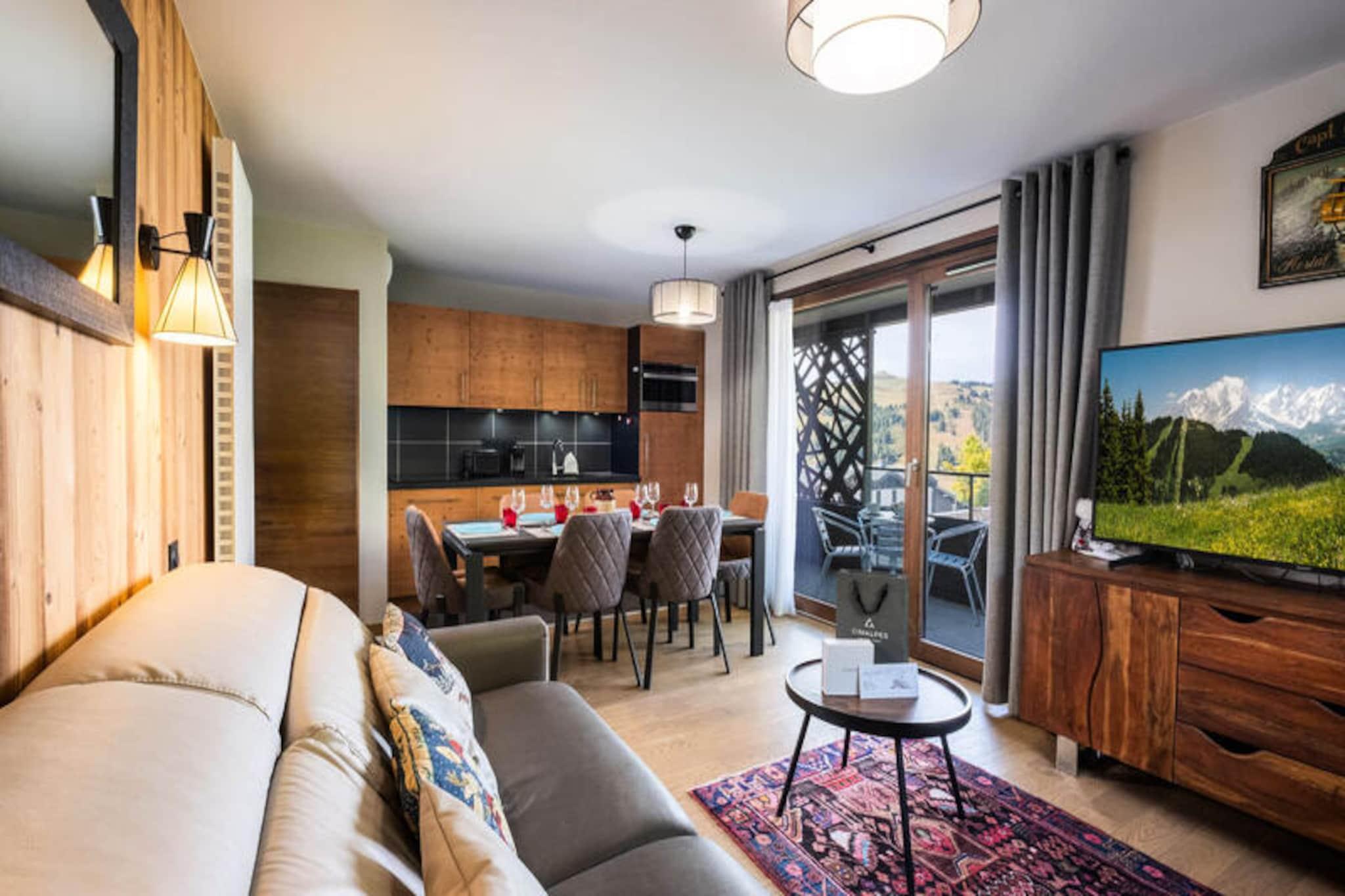 Højt over den charmerende landsby Les Saisies tilbyder dette alpine tilflugtssted en harmonisk blanding af moderne komfort og traditionel savoyard-charme. Med panoramaudsigt over bjergene og en førsteklasses beliggenhed kun få skridt fra pisterne og lokale butikker er Les Chalets des Cimes den perfekte base for en uforglemmelig alpinferie. Uanset om du besøger stedet for spændingen ved vintersport eller roen ved sommervandreture, inviterer denne bolig dig til at opleve de franske alpers skønhed med stil. Lejligheden har komfortabel plads til op til seks gæster, hvilket gør den ideel til familier eller små grupper. Dens gennemtænkte planløsning omfatter en hyggelig stue med en sovesofa, et åbent køkken, der fører ud til en privat balkon, og to indbydende soveværelser - et med en dobbeltseng og et andet med køjesenge og en ekstra enkeltseng. To badeværelser, et brusebad og et separat toilet sikrer bekvemmelighed og privatliv for alle gæster. Moderne faciliteter såsom parkeringskælder, et skiskab og inkluderede tjenester som sengelinned, håndklæder og slutrengøring gør dit ophold så problemfrit som muligt. Les Saisies er et pulserende feriested, der tilbyder aktiviteter året rundt. Om vinteren kan du nyde direkte adgang til uberørte skiløjper, mens sommeren byder på muligheder for vandreture, mountainbiking og udforskning af det betagende alpine landskab. Selve landsbyen er fyldt med hyggelige restauranter, lokale butikker og en indbydende atmosfære, der indfanger essensen af ??Savoyard-kulturen. Uanset om du søger eventyr eller afslapning, tilbyder denne lejlighed på Les Chalets des Cimes de perfekte rammer for at skabe dyrebare minder i hjertet af Alperne.