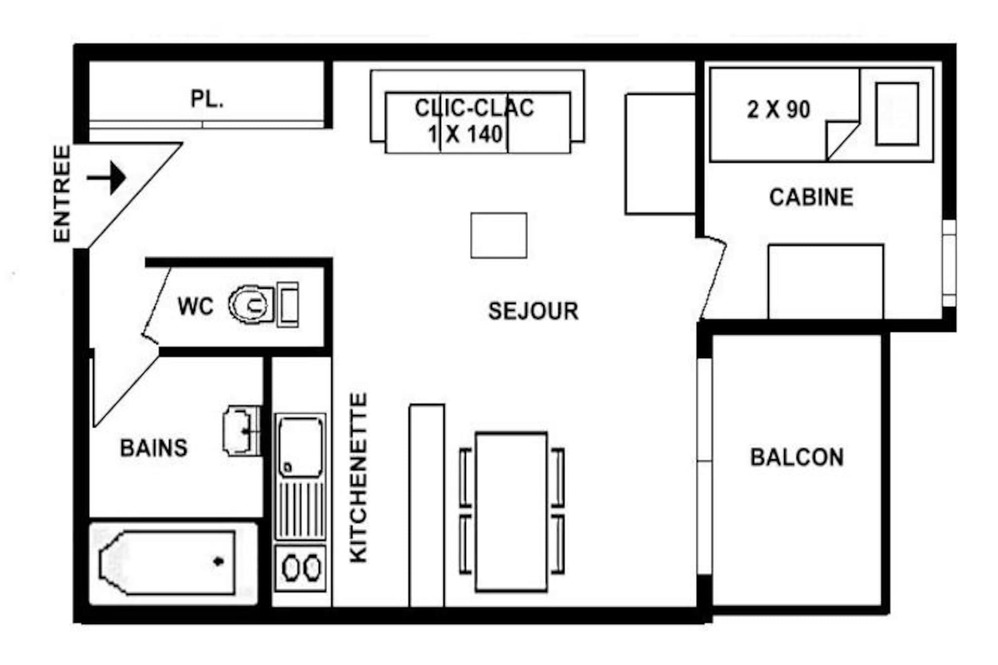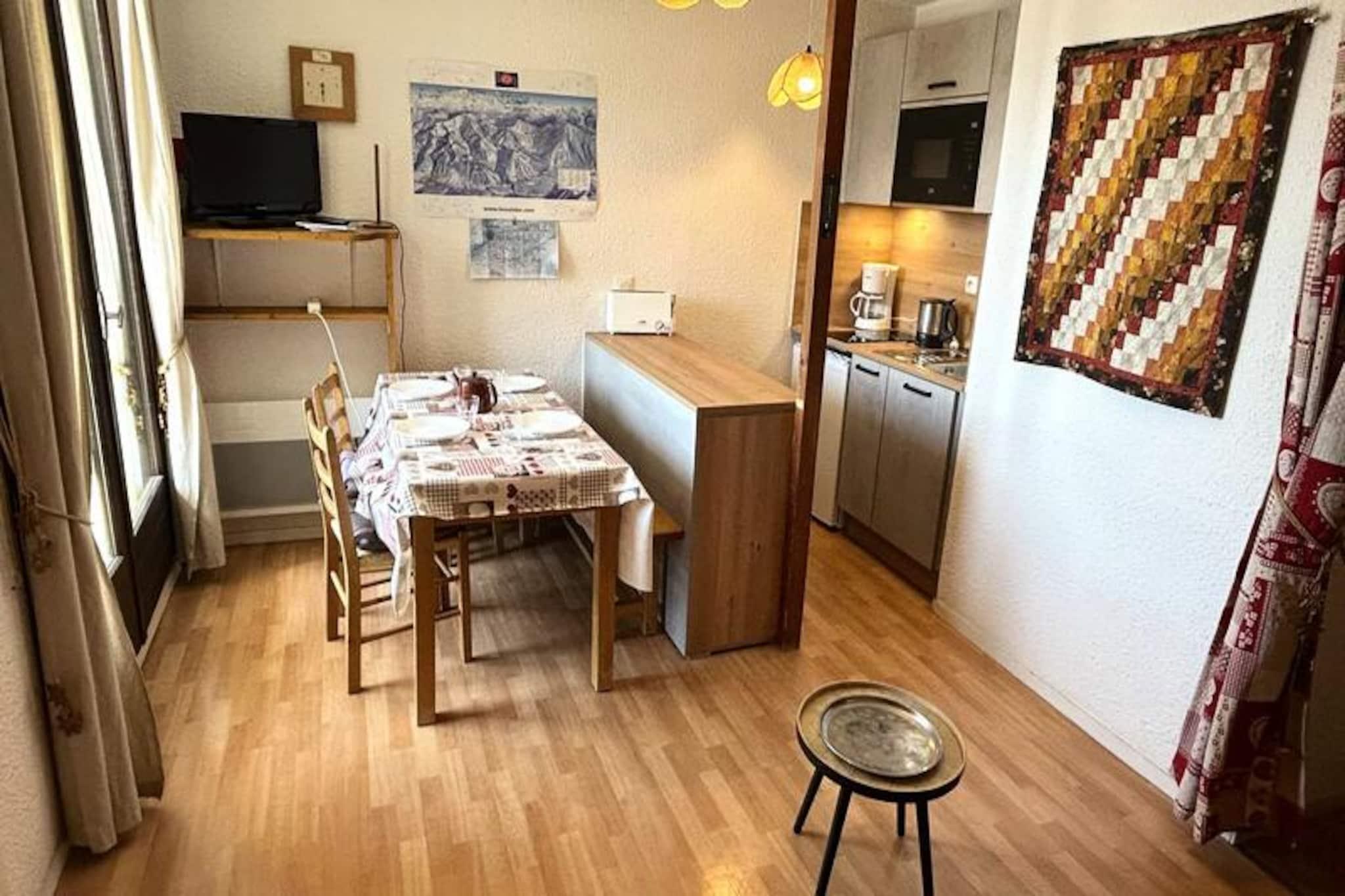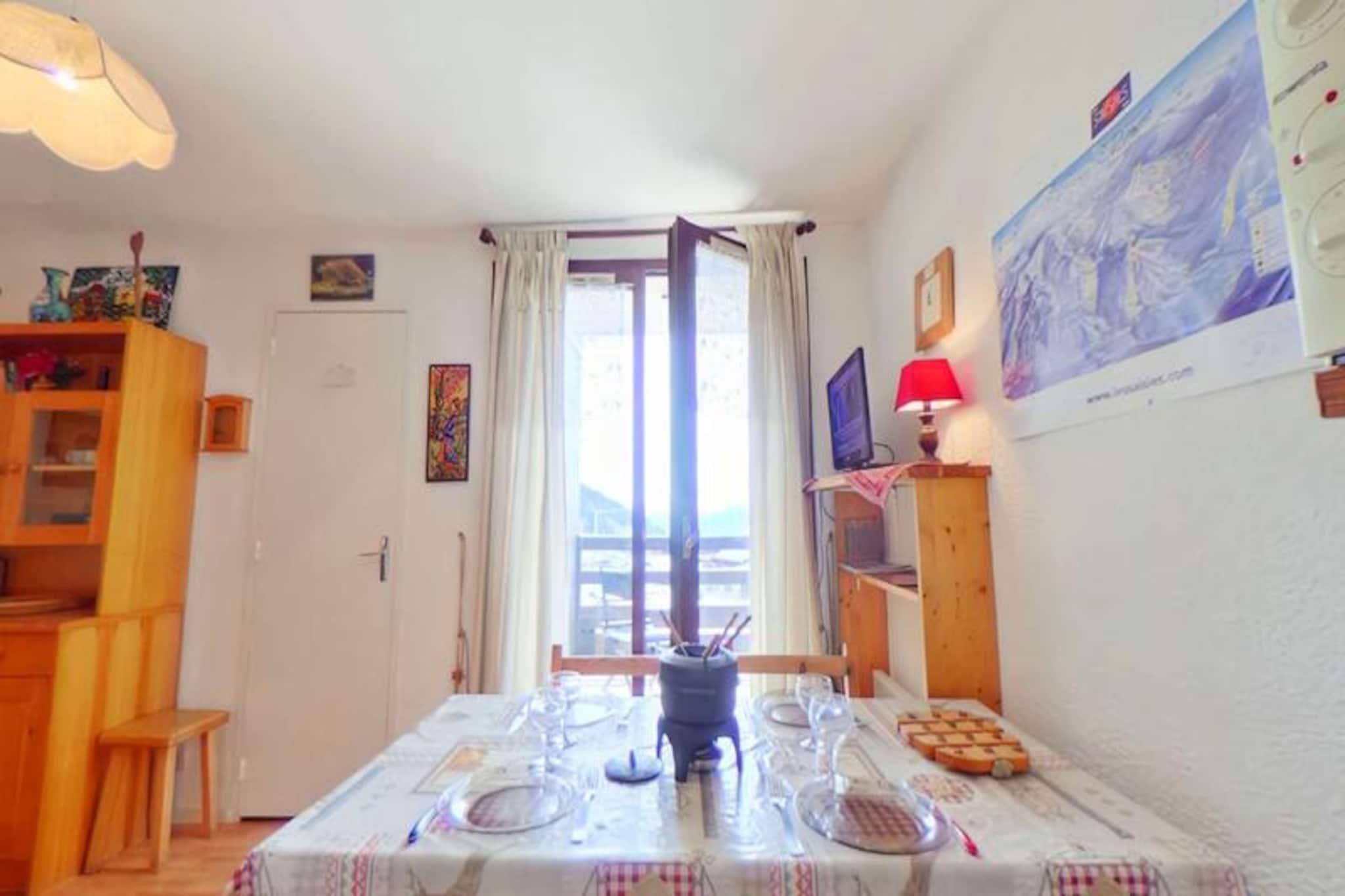 Vågn op til den friske bjergluft og det gyldne morgenlys i denne charmerende studiolejlighed, perfekt beliggende i hjertet af feriestedet. Med sin østvendte balkon kan du starte din dag med en betagende udsigt over det omkringliggende alpine landskab, der sætter tonen for en uforglemmelig ferie. Uanset om du er her for at stå på ski, vandre eller bare slappe af, tilbyder dette hyggelige tilflugtssted den ideelle base for at udforske de franske alpers skønhed. \n\nLejligheden ligger på første sal i en bolig, kun få skridt fra alle feriestedets faciliteter, og har en gennemtænkt planløsning. Stuen har en komfortabel 140 cm sovesofa og et åbent tekøkken udstyret med alt det nødvendige til at tilberede måltider efter en dag med eventyr. En separat sovealkove med køjesenge (bemærk: den øverste køjeseng er ikke egnet til børn under 6 år) sikrer afslappende nætter for familier eller små grupper. Lejligheden kan også prale af et badeværelse og et separat toilet for ekstra bekvemmelighed. Klassificeret som en 2-stjernet møbleret turistindkvartering kombinerer den komfort med praktisk anvendelighed for et stressfrit ophold.\n\nTræd udenfor, og du vil blive fordybet i feriestedets pulserende energi. Fra skiløjper og vandrestier til charmerende restauranter og butikker er alt hvad du behøver inden for gåafstand. Om vinteren kan du nyde direkte adgang til skiløb i verdensklasse, mens sommeren byder på muligheder for naturskønne vandreture, mountainbiking og paragliding. Den nærliggende Tarentaise-dal og de majestætiske tinder i Alperne danner en fantastisk kulisse for dine eventyr.\n\nUanset om du søger spændende udendørsaktiviteter eller en fredelig bjergflugt, tilbyder denne studiolejlighed en varm og indbydende oase i hjertet af de franske alper. Skab minder, der vil vare hele livet, i dette idylliske alpine tilflugtssted.