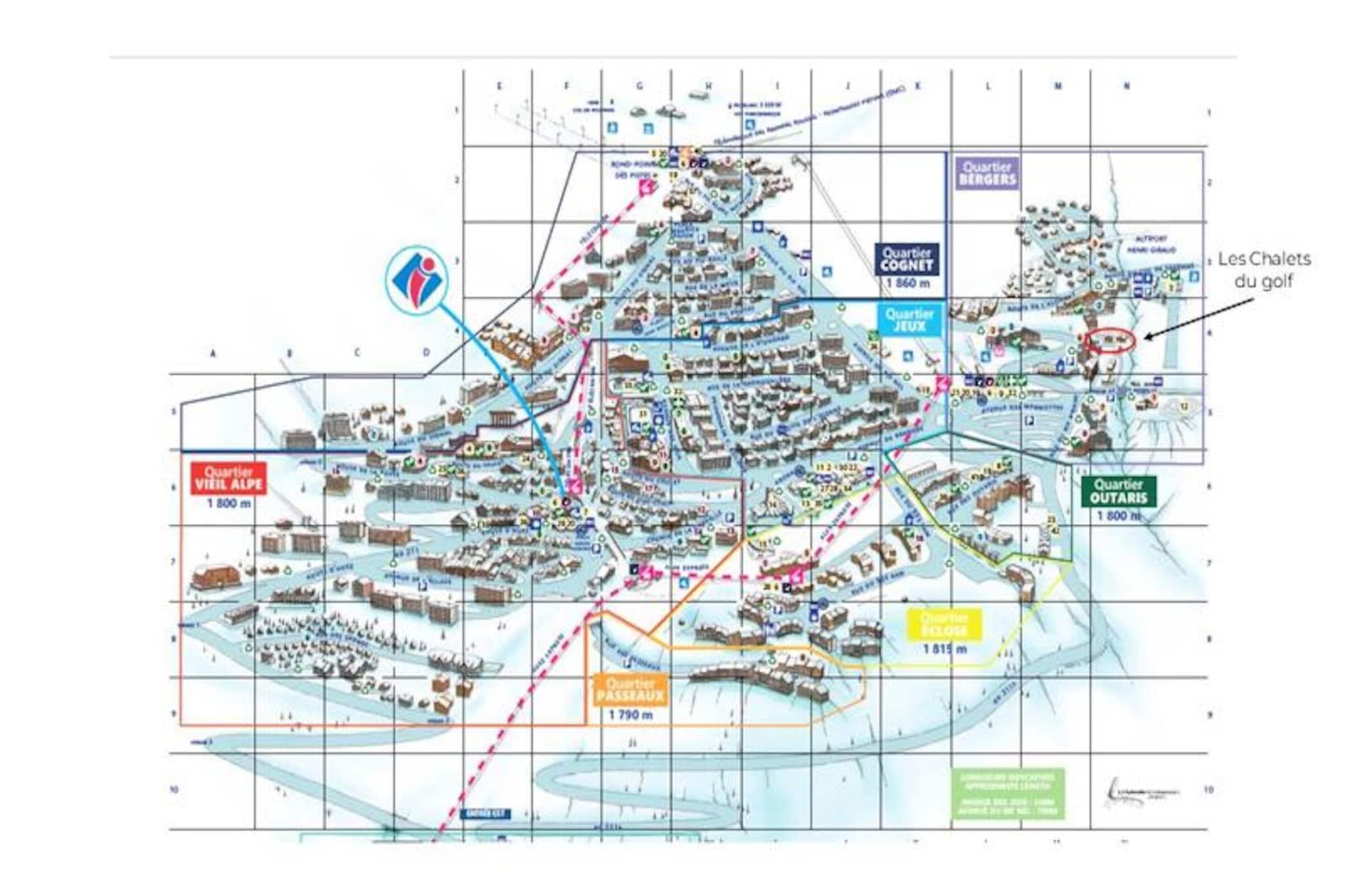 I det fredfyldte Bergers-distrikt i Alpe d'Huez inviterer denne luksuriøse lejlighed i den nye Chalets du Golf dig til at opleve den perfekte blanding af alpin charme og moderne elegance. Med sin betagende udsigt over bjergene og førsteklasses beliggenhed kun 150 meter fra den nærmeste skilift tilbyder denne ejendom uovertruffen ski-in/ski-out-bekvemmelighed, hvilket gør den til et ideelt tilflugtssted for både vintersportsentusiaster og naturelskere. Forestil dig at starte din dag med den friske bjergluft og afslutte den med den nedgående sols skær over bjergtoppene, alt sammen fra din komfortable private 20 m² store terrasse. \n\nLejligheden strækker sig over to etager og er omhyggeligt designet til at rumme op til otte gæster i absolut komfort. Stueetagen har en lys og indbydende opholdsstue, et åbent fuldt udstyret køkken og et dobbelt soveværelse med eget badeværelse. Ovenpå finder du tre yderligere dobbeltværelser, inklusive et andet med eget badeværelse, og et privat badeværelse. Hver detalje er omhyggeligt udvalgt for at sikre et problemfrit ophold, fra den elegante indretning til de eksklusive faciliteter. \n\nGæster vil sætte pris på de inkluderede tjenester såsom sengelinned, opredte senge ved ankomst, toiletartikler og slutrengøring. Ejendommen tilbyder også både indendørs og udendørs parkeringspladser for ekstra bekvemmelighed. Ud over boligen tilbyder den pulserende Alpe d'Huez et væld af aktiviteter året rundt, fra skiløb og snowboarding i verdensklasse om vinteren til vandre- og cykelstier om sommeren. Med sin førsteklasses beliggenhed og luksuriøse detaljer er denne lejlighed den perfekte base for at skabe uforglemmelige alpine minder.