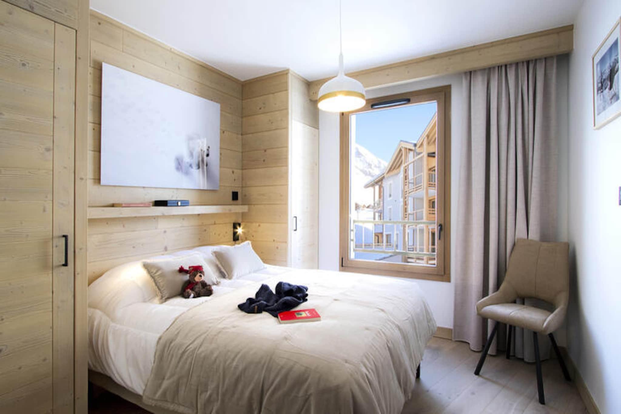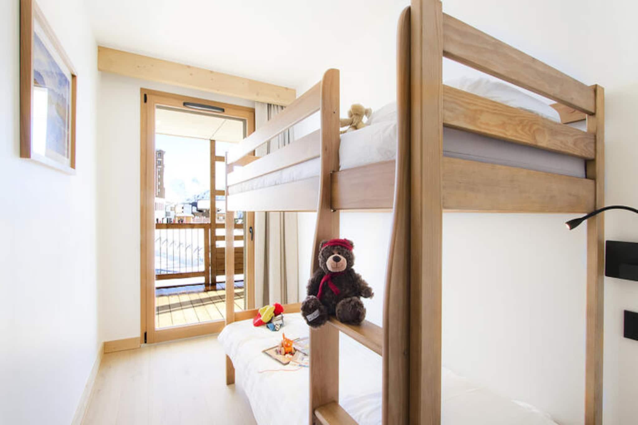 På kanten af ??de uberørte pister i Les Arcs 1800 tilbyder denne elegante ski-in/ski-out-lejlighed en luksuriøs alpin ferie med direkte adgang til skiløb i verdensklasse og en betagende udsigt over bjergene. Forestil dig morgener tilbragt med at nippe til kaffe på din sydøstvendte terrasse, mens du nyder solen, mens de snedækkede tinder glimter foran dig. Denne bolig kombinerer moderne komfort med charmen fra de franske alper og skaber et uforglemmeligt tilflugtssted for både familier og venner. \n\nTræd indenfor for at opdage en rummelig opholdsstue designet til afslapning og samvær. Spisestuen, komplet med et tv, indbyder til hyggelige aftener efter en dag med eventyr, mens det fuldt udstyrede køkken - med ovn, mikrobølgeovn, opvaskemaskine, køleskab, induktionskogeplade og vaskemaskine - gør det til en fornøjelse at tilberede måltider. Lejligheden har komfortabel plads til op til seks gæster, med to soveværelser med queensize-senge og en charmerende hytte med køjesenge. Et separat badeværelse og toilet sikrer bekvemmelighed, mens skirummet giver direkte adgang til pisterne for ubesværet alpin udforskning. \n\nSelve boligen er et paradis for wellness og fritid og tilbyder faciliteter såsom swimmingpool, fitnesscenter, sauna, dampbad og sensoriske brusere. Uanset om du slapper af efter en dag på pisterne eller forkæler dig selv med en foryngende spa-behandling, føles hvert øjeblik her som en fornøjelse. \n\nMed sengelinned, håndklæder og velkomstprodukter samt slutrengøring er dit ophold designet til at være problemfrit og stressfrit. Vælg denne exceptionelle ejendom til en ferie fyldt med eventyr, afslapning og den uovertrufne skønhed i de franske alper.