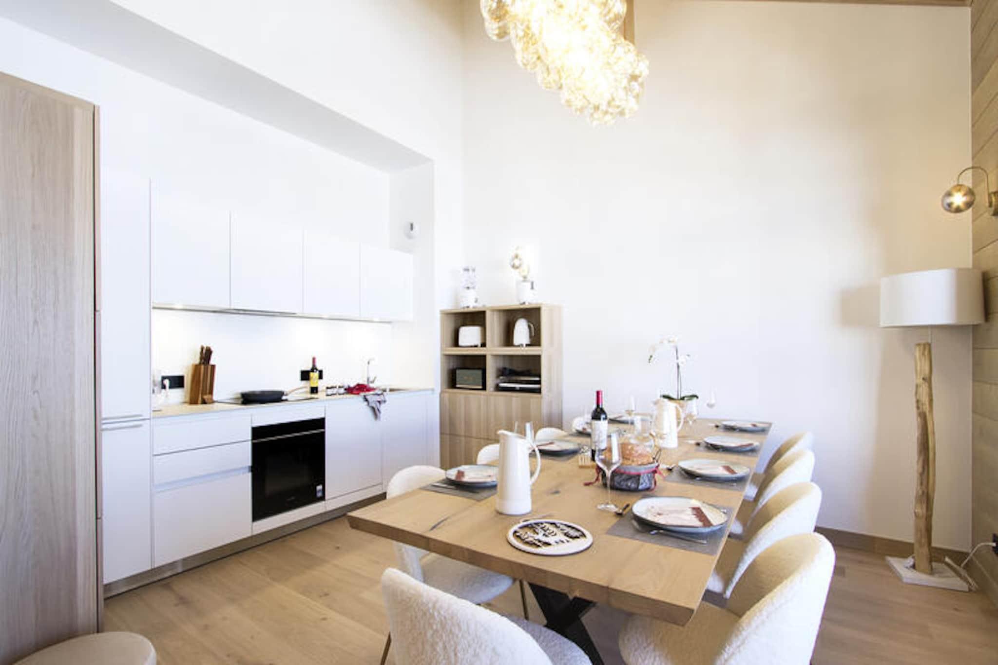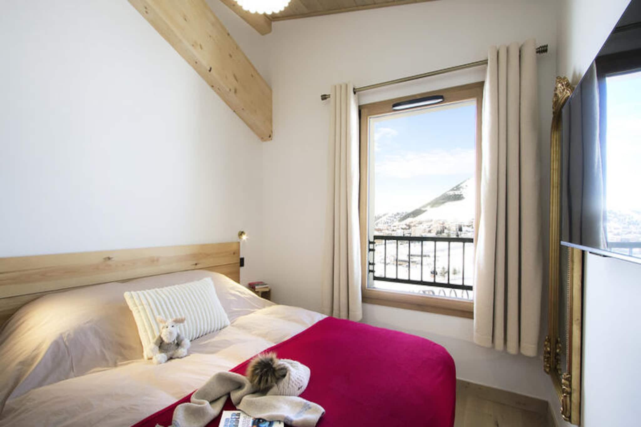 Denne rummelige lejlighed ligger højt oppe i de uberørte franske alper og tilbyder et luksuriøst tilflugtssted med direkte adgang til pisterne direkte til skiløb. Med en perfekt beliggenhed i en moderne bolig bydes gæsterne velkommen til en verden af ??komfort og elegance, omgivet af betagende udsigt over bjergene og alpin ro. Uanset om du er her for vintersport eller sommereventyr, lover denne ejendom et uforglemmeligt ophold i hjertet af naturens storhed. \n\nIndenfor kan lejligheden prale af en stor stue, der åbner ud til en vestvendt balkon, ideel til at nyde eftermiddagssolen. Det fuldt udstyrede køkken-alrum har topmoderne apparater, herunder ovn, opvaskemaskine, mikrobølgeovn, induktionskogeplade og et stort køleskab, hvilket gør det nemt at tilberede måltider til familie og venner. Med tre soveværelser med bløde 180 cm dobbeltsenge, en hyggelig hytte med køjesenge og ekstra køjesenge i et separat rum, rummer denne bolig komfortabelt større grupper. Moderne bekvemmeligheder såsom tv på soveværelserne, et rummeligt badeværelse, et brusebad og et separat toilet sikrer bekvemmelighed og afslapning under hele dit ophold.\n\nSelve boligen er et paradis for afslapning med swimmingpool, fitnesscenter, sauna, dampbad og sensoriske brusere til at forynge dig efter en dag på pisterne. Skirummet giver direkte adgang til pisterne, hvilket gør det nemt at begive sig ud på dine alpine eventyr. Gæsterne vil også sætte pris på ejendommens solrige beliggenhed og de betænksomme tjenester, der tilbydes, herunder sengelinned, håndklæder, velkomstprodukter og slutrengøring.\n\nUanset om du er tiltrukket af spændingen ved skiløb, roen ved bjergvandringer eller blot charmen ved de franske alper, er denne lejlighed den perfekte base for at skabe dyrebare minder. Med sin blanding af luksus, bekvemmelighed og naturlig skønhed inviterer den dig til at opleve bjergenes magi i enhver sæson.
