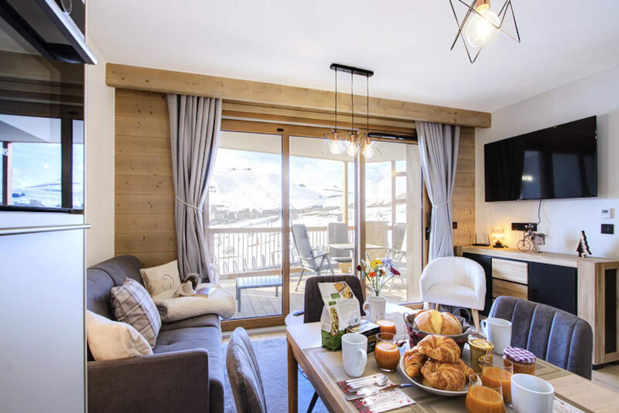 Højt over Tarentaise-dalen tilbyder denne moderne alpine lejlighed en blanding af luksus og bekvemmelighed til din næste bjergferie. Med direkte adgang til ski-in/ski-out fra boligen kan du nemt betræde pisterne og udforske de uberørte snedækkede stier i Les Arcs. Den vestvendte balkon inviterer dig til at slappe af hver aften med uforstyrret udsigt over den strålende solnedgang over bjergtoppene, hvilket skaber en rolig kulisse for din ferie. Uanset om du er her for vintersport eller sommereventyr, lover denne ejendom et uforglemmeligt ophold. \n\nIndvendigt er lejligheden omhyggeligt designet til at kombinere komfort og funktionalitet. Stue-/spisestuen er et hyggeligt sted at samles, komplet med et tv til afslappede aftener. Det fuldt udstyrede køkken har moderne apparater, herunder ovn, mikrobølgeovn, opvaskemaskine og induktionskogeplade, hvilket gør madlavning til en leg. Et dobbeltværelse med eget tv, en sovealkove med køjesenge og en sovesofa i stuen sikrer rigelig soveplads til familier eller små grupper. Brusebadet og det separate toilet bidrager til bekvemmeligheden, mens skirummet giver direkte adgang til pisterne. Gæsterne kan også drage fordel af en privat garage og adgang til boligens førsteklasses faciliteter, herunder swimmingpool, fitnesscenter, sauna, dampbad og sensoriske brusere.\n\nBoligen ligger i et solrigt og pulserende område og er perfekt placeret til at udforske det bedste af Les Arcs. Fra skiskoler og udlejningsbutikker til charmerende restauranter og afterski-steder er alt hvad du behøver inden for rækkevidde. Om sommeren forvandles regionen til et paradis for vandrere og cyklister med stier, der snor sig gennem betagende alpine landskaber. Uanset om du jagter puddersne eller søger ro, er denne lejlighed din port til de franske alpers vidundere.