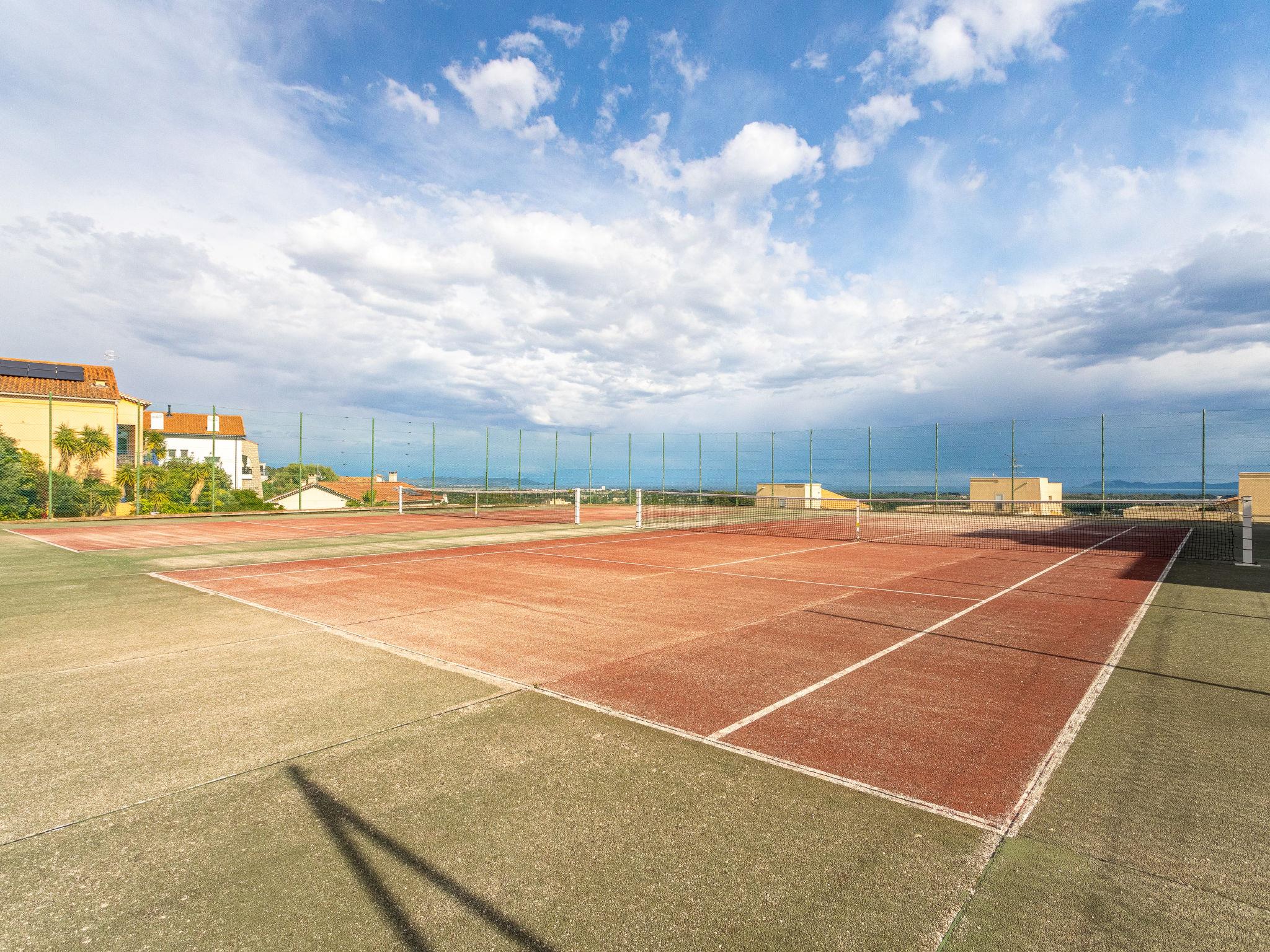 Hyères: Residence "Le Grand Large", 3 storeys, surrounded by trees. In a sunny position in the residential district, 4.3 km from the sea, 4.3 km from the beach. For shared use: swimming pool fenced (10 x 5 m, seasonal availability: 15.Jun. - 30.Sep. pool opening hours: 09:00-21:00). Tennis (2 x hard court). In the complex: lift. Supermarket 600 m, shopping centre 4.1 km, restaurant 1 km, bakery 600 m, bus stop 500 m, sandy beach "l'Ayguade" 4.3 km. Nearby attractions: Kiddy Parc 5.9 km, Parc Olbius Riquier 2.5 km, Casino Hyères 1.3 km. Please note: car recommended. The keys‘ handover takes place by the agency Interhome in Hyères sur le Port.