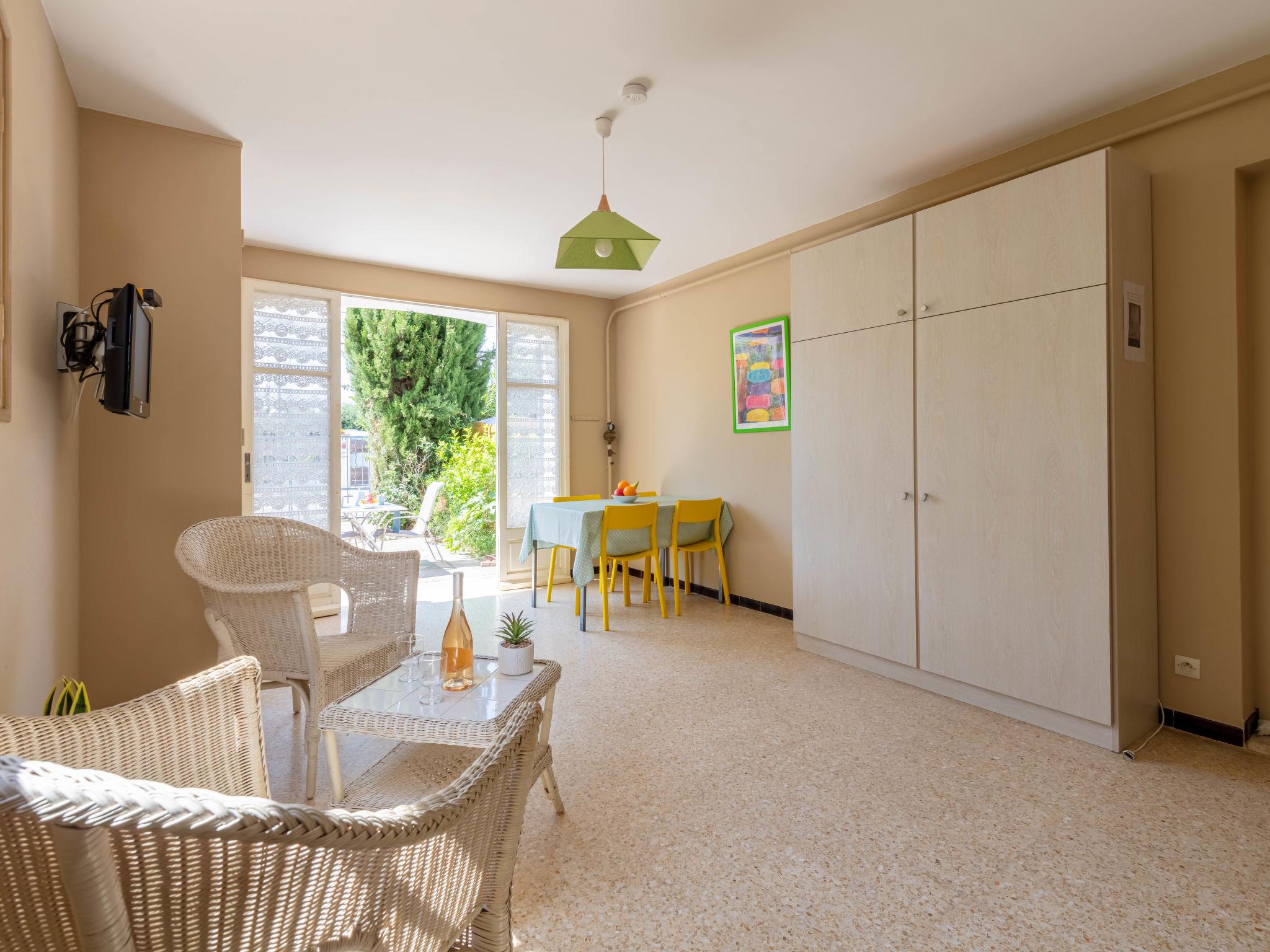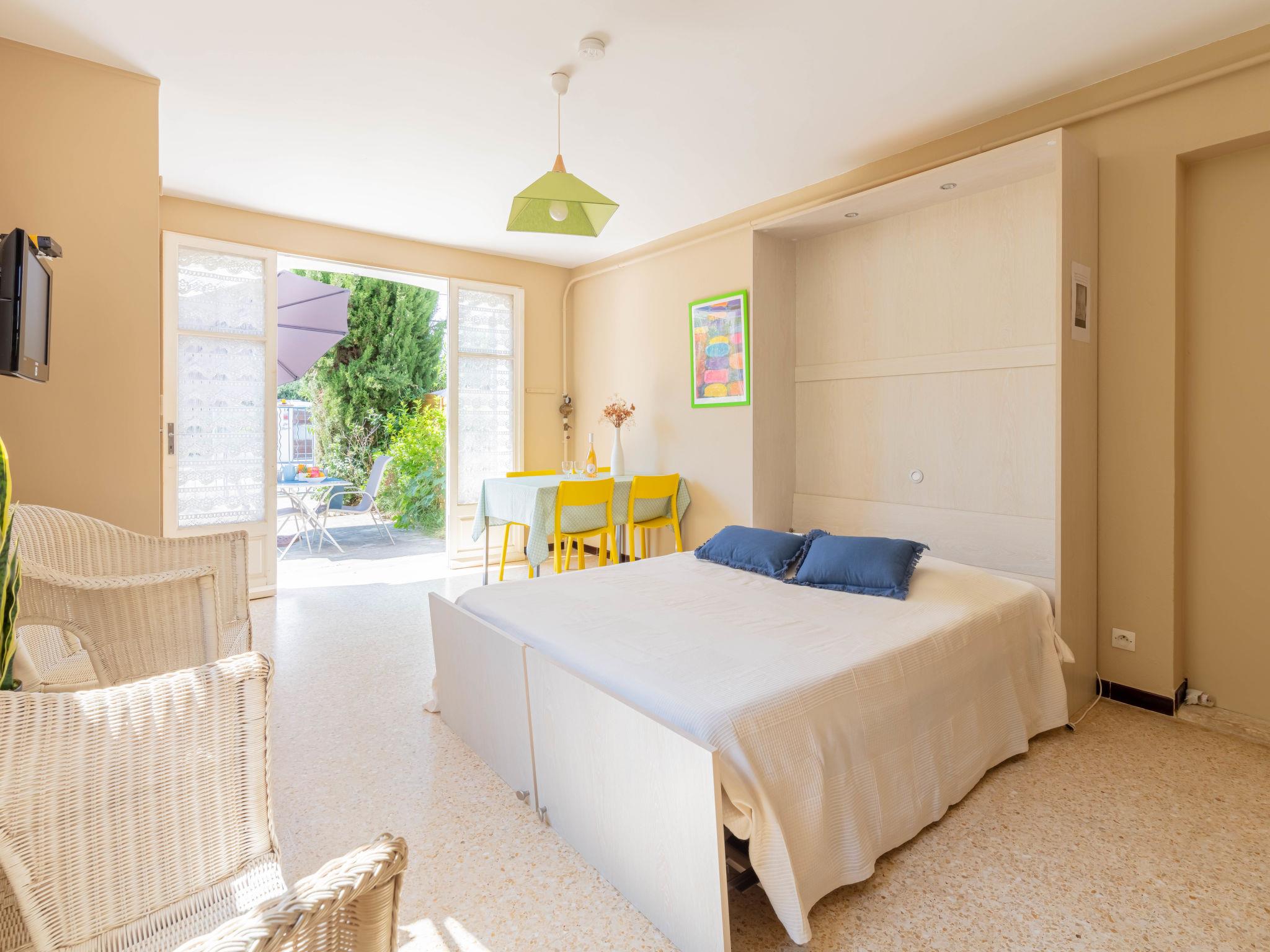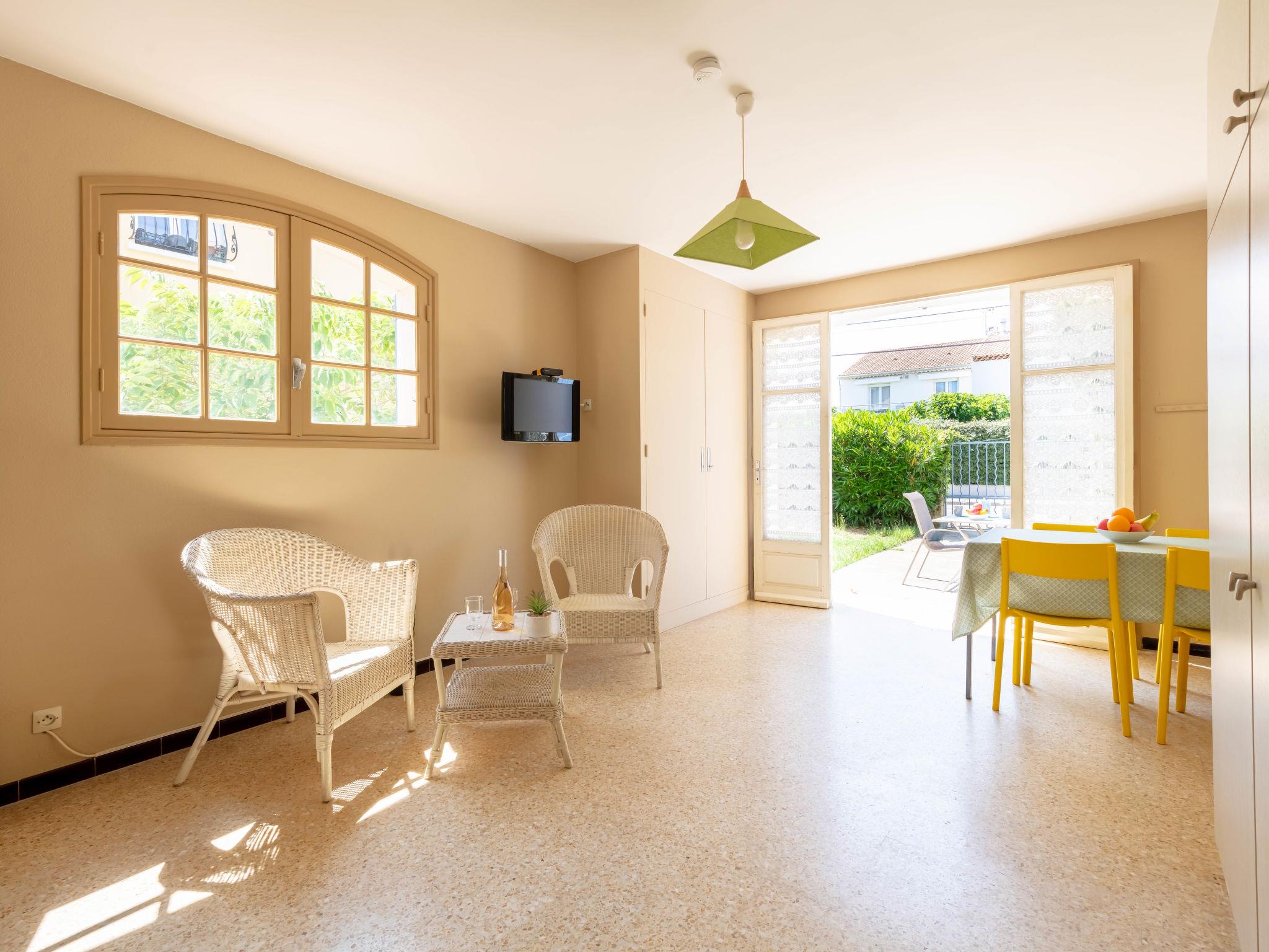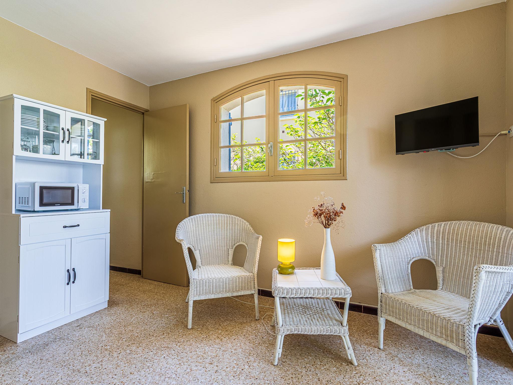 1-room studio 25 m2, on the ground floor. Practical and comfortable furnishings: living/dining room with 1 fold-away bed (140 cm, length 190 cm), TV (flat screen). Exit to the patio. Kitchenette 2 m2 (4 hot plates, oven, electric coffee machine). Shower, sep. WC. No heating option. Patio. Terrace furniture. Facilities: Internet (WiFi, extra). Please note: 1 small pet/ dog allowed. TV only FR. Smoke alarm.