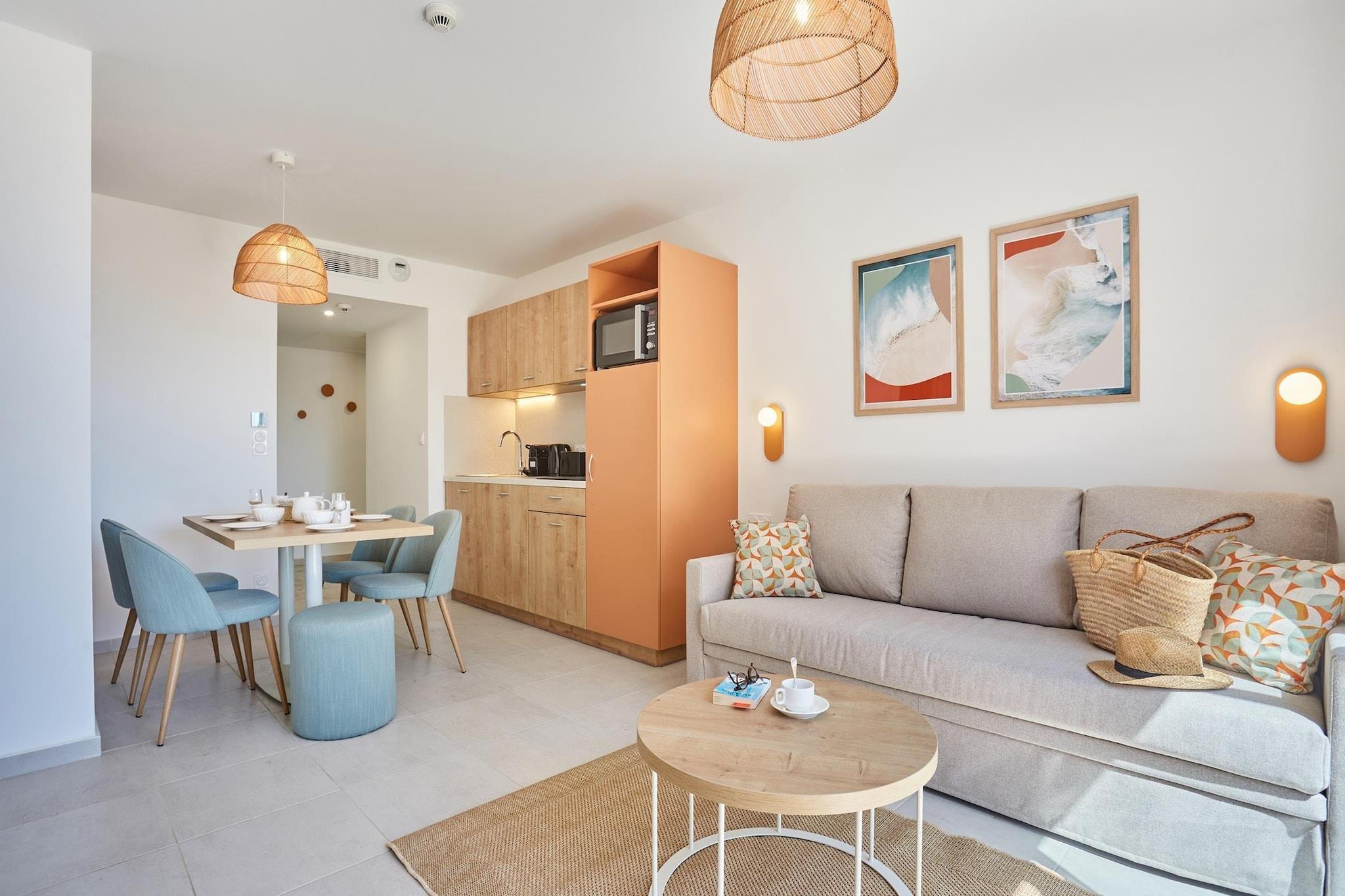 Den nybyggede bolig (færdiggjort i 2024) kombinerer moderne komfort med middelhavselegance og har en smuk udendørs pool at køle af. Der er også et børnebassin for de mindste, som garanterer timevis af leg og latter. I juli/august suppleres tilbuddet med en børneklub (4-11 og 12-15 år) og et animationsprogram for hele familien. Lejlighederne er smagfuldt indrettede og har alle WiFi, du kan vælge imellem Studie 2 personer: FR-83400-46 2-værelses lejlighed 4 personer: FR-83400-47 3-værelses lejlighed 6 personer: FR-83400-48 4-værelses lejlighed 8 personer: FR-83400-49 Start din dag med en lækker morgenmad (mod betaling) og lad dig derefter friste af de mange kulturelle og udendørs aktiviteter på halvøen og det omkringliggende område. Giens-halvøen, omgivet af Middelhavet, ligger syd for Hyères og øst for Toulon. Det er forbundet med fastlandet med to 4 km lange kyststriber og tilbyder et paradisisk miljø for en ferie med familie eller venner: fine sandstrande, klippefyldte bugter, klitter og skove.