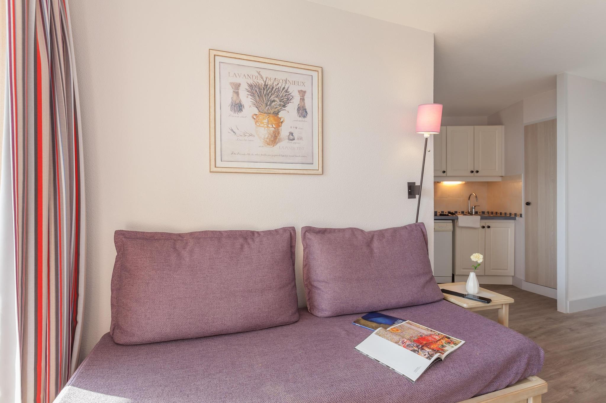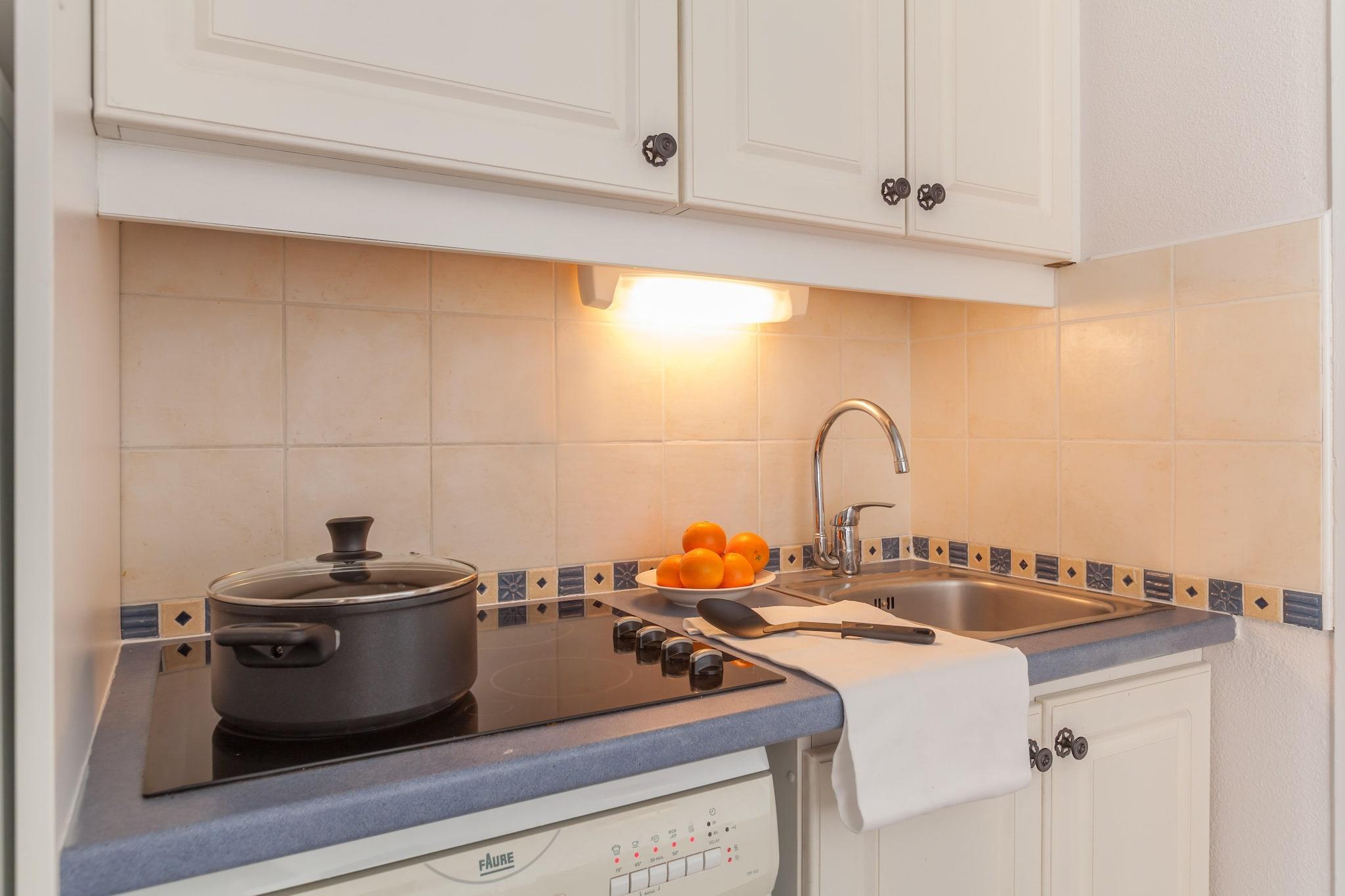 Tekøkken(kogeplade(glaskeramisk), kaffemaskine, mikrobølgeovn, opvaskemaskine , køleskab), Stue/soveværelse(2x enkeltsovesofa, Fjernsyn), soveværelse(dobbeltseng), soveniche(køjeseng), badeværelse(badekar eller bruser, toilet), tørretumbler(deles med andre gæster, betalt), vaskemaskine(deles med andre gæster, betalt), balkon eller terrasse, varme(elektrisk), havemøbler, swimmingpool(deles med andre gæster, udendørs, opvarmes, herunder en del for børn (maks. dybde 50 cm), opened from Apr upto and including Oct), petanquebane(deles med andre gæster)