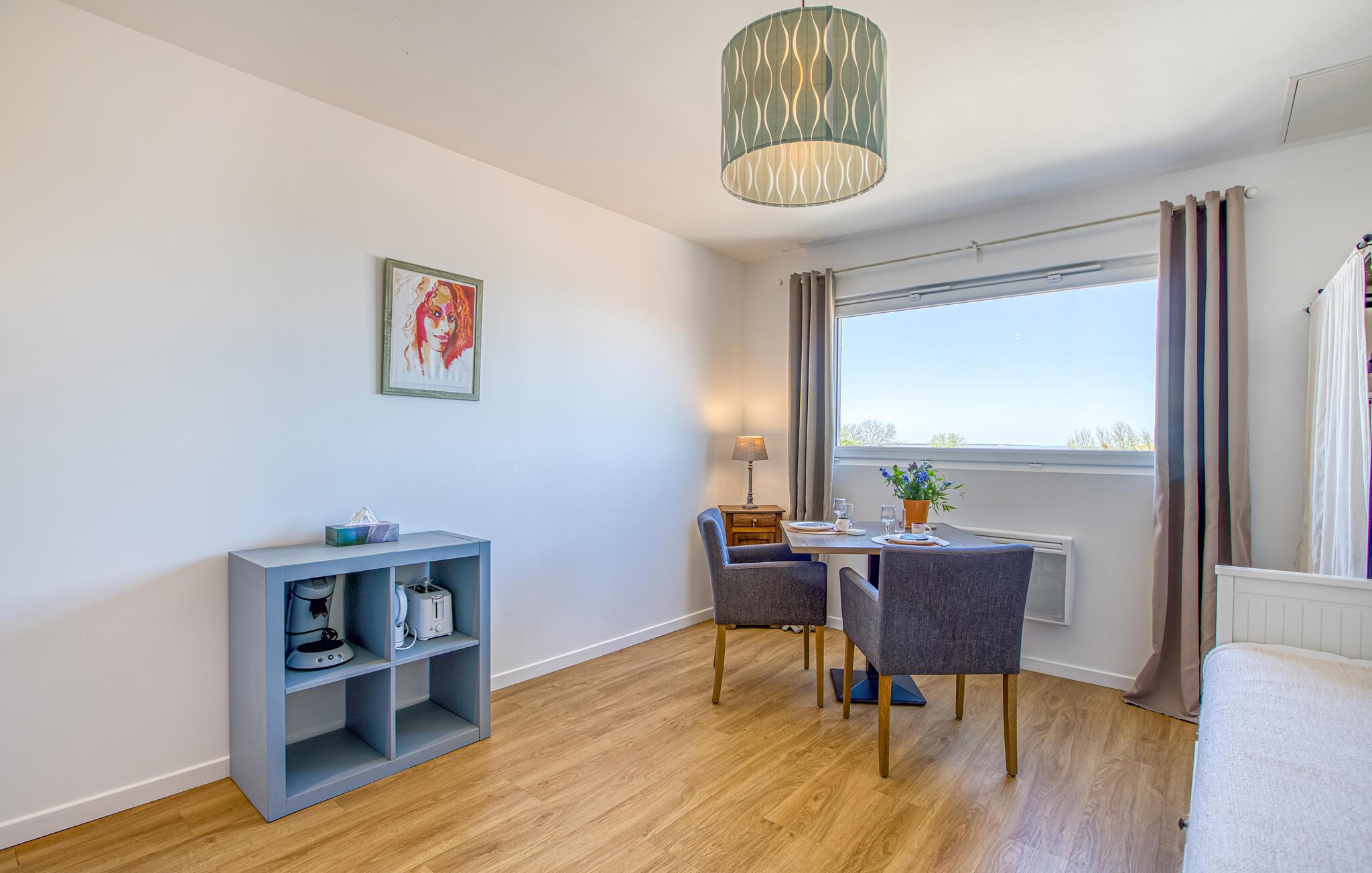 Denne charmerende ferielejlighed er noget særligt med sin funktionelle indretning og venlige atmosfære. De lyse værelser med rene linjer og diskrete farver tilbyder en smuk ramme for afslappende ferier. Brug opholdsstuen til at læse eller slappe af og nyde dagens måltider ved det lille spisebord. Kig ud af vinduet og nyd den vidunderlige udsigt over byens tage helt ned til havet.