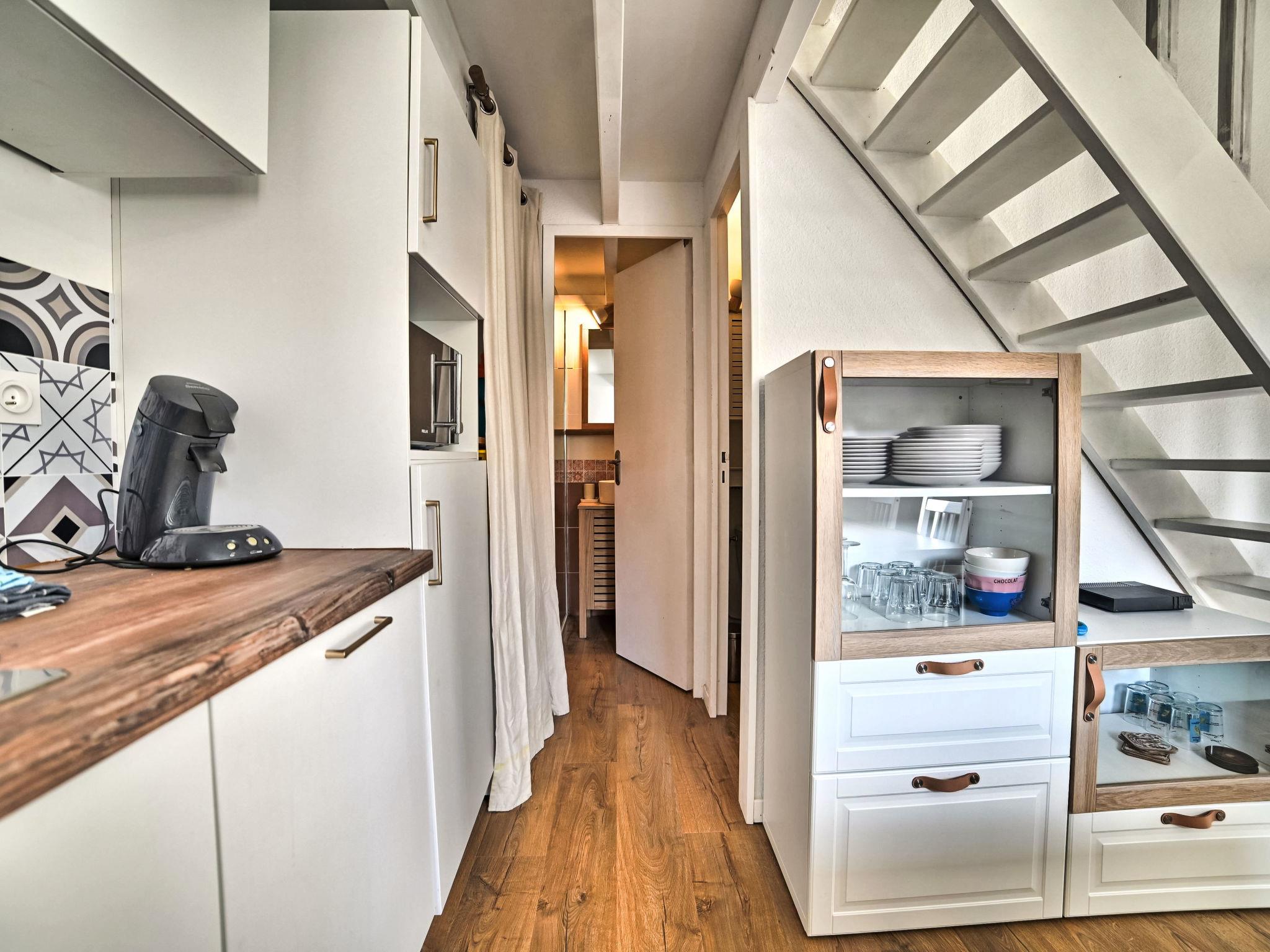 3-room terraced house 30 m2. Beautiful furnishings: living/dining room with TV (flat screen). Exit to the terrace. 1 room with 1 french bed (1 x 140 cm, length 190 cm). Kitchenette (oven, dishwasher, 3 induction hot plates, toaster, kettle, microwave, electric coffee machine). Bathroom, sep. WC. Electric heating. Upper floor: 1 room, without window with 2 beds (80 cm, length 190 cm). Large terrace 30 m2. Terrace furniture, barbecue. Facilities: washing machine, hair dryer. Internet (WiFi, free). Parking. Please note: smoke alarm. Offer by a private individual according to Art. 155, IV of CGI. 17337000064E7