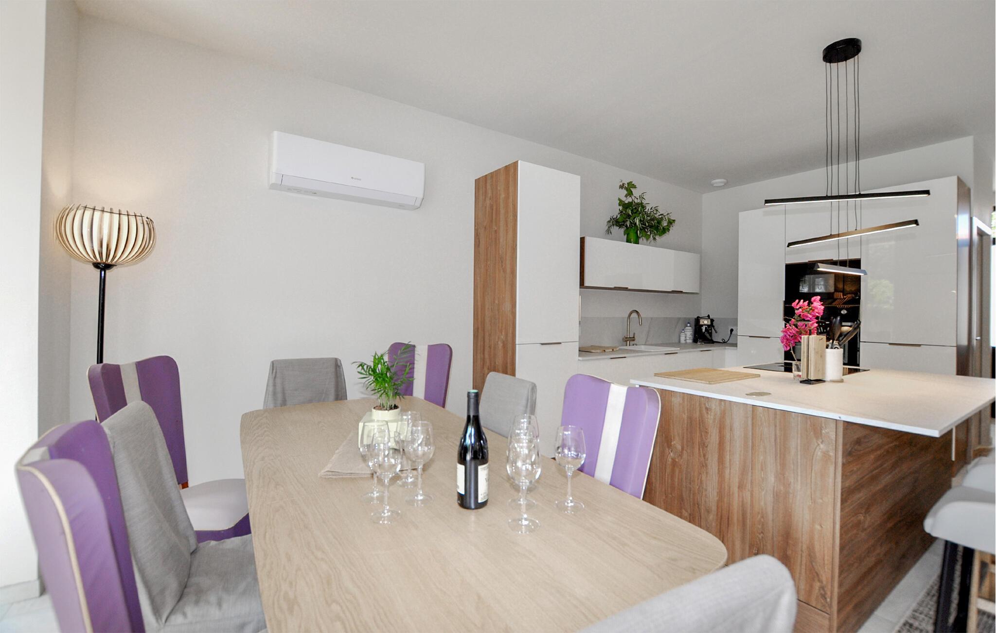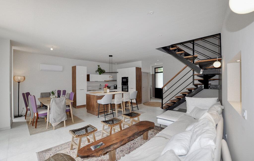 Indenfor finder I et åbent boligkoncept med et moderne køkken. Tilbring hyggelige aftener i den stilfulde opholdsstue, som lægger op til gode hyggestunder med sit lyse design.