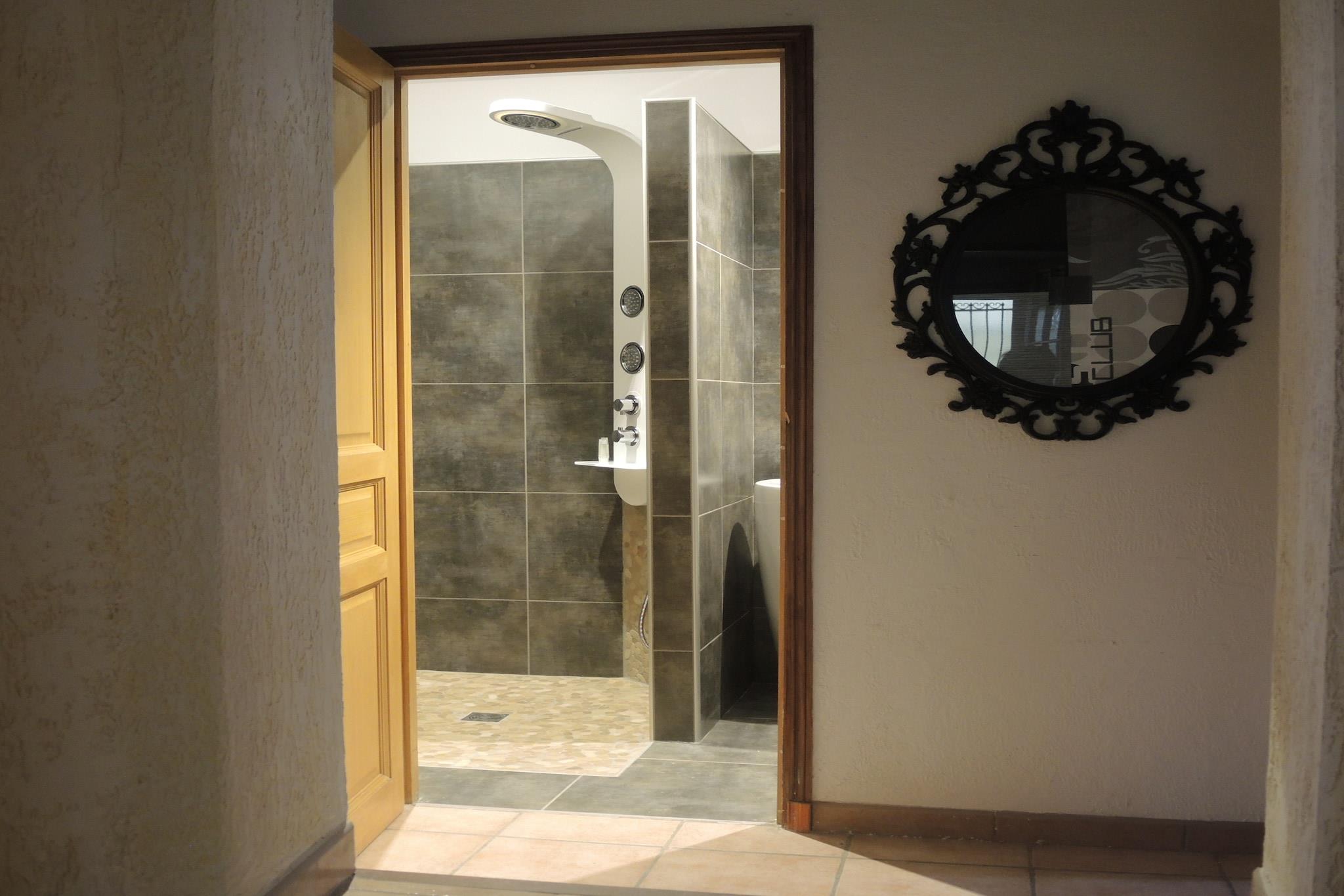 Stueetage: (entre, sofastue(dobbeltsovesofa, Fjernsyn(fladskærm, parabol), pejs, sofahjørne, radio, stereoanlæg, klimaanlæg), spisestue(spisebord, klimaanlæg, barnestol), åbent køkken(komfur(Komfur med fire kogeplader, gas), kaffemaskine, ovn, mikrobølgeovn, opvaskemaskine , køleskab(+ ismaskine, + fryser, amerikansk), klimaanlæg), soveværelse(dobbeltseng, bruser, klimaanlæg, barneseng), Soveværelse med badeværelse(dobbeltseng, bruser, håndvask, klimaanlæg), Soveværelse med badeværelse(dobbeltseng, bruser, håndvask, klimaanlæg), Soveværelse med badeværelse(køjeseng, bruser, håndvask, klimaanlæg), badeværelse(bruser, håndvask, toilet), toilet, bryggers(vaskemaskine)) carport, terrasse(privat), have(privat, indhegnet, 2100 m2), havemøbler, solstole, grill, swimmingpool(privat, opvarmes, 8 x 5 m., opened from May upto and including Oct), petanquebane