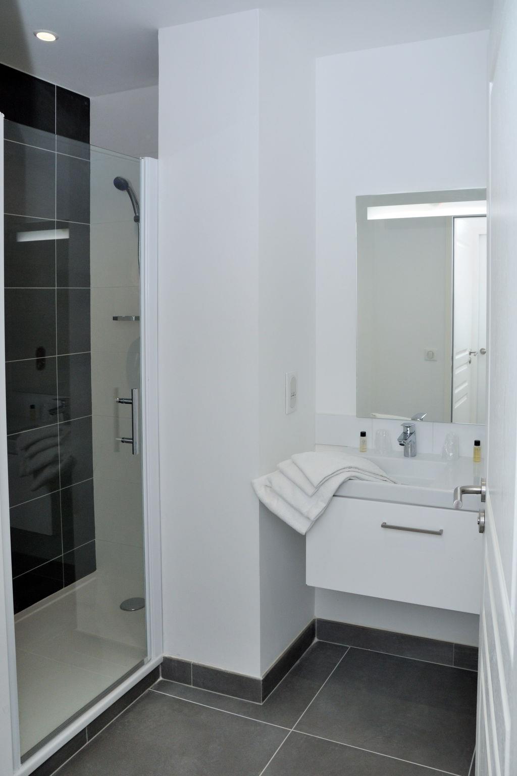 "Les Coteaux de Jonzac", 3-room apartment 48 to 56 m2. Practical and modern furnishings: living/sleeping room with 1 double sofabed, dining table and TV. Exit to the balcony. 1 room with 1 french bed. 1 room with 2 beds. Small, open kitchen (dishwasher, 2 induction hot plates, toaster, microwave, freezer, electric coffee machine). Shower, sep. WC. Electric heating, air-conditioning. Balcony. Balcony furniture. Facilities: children's high chair, baby cot for up to 2 year olds. Internet (WiFi, free). Please note: non-smokers only. Maximum 1 small pet/ dog allowed. Smoke alarm.