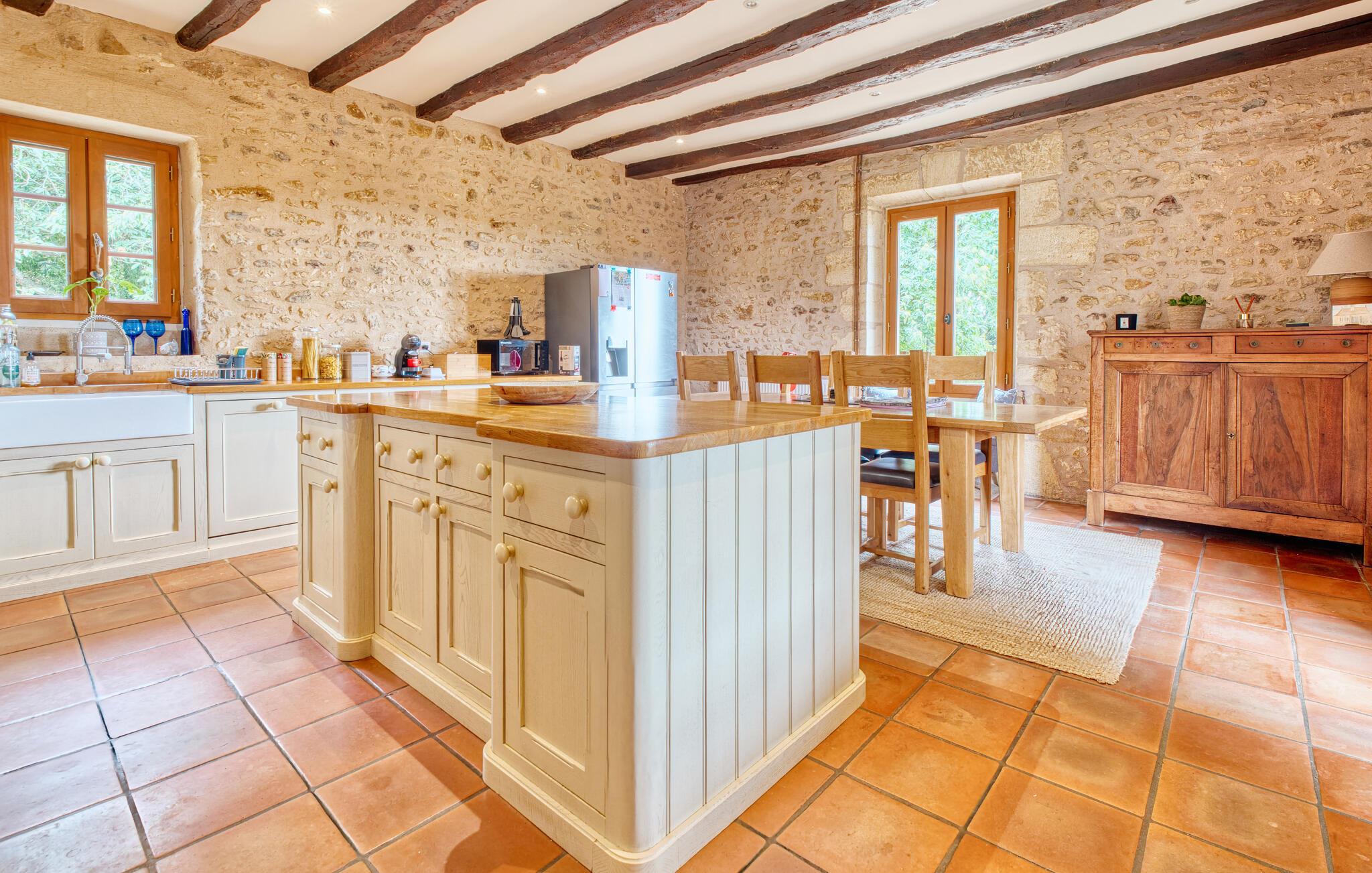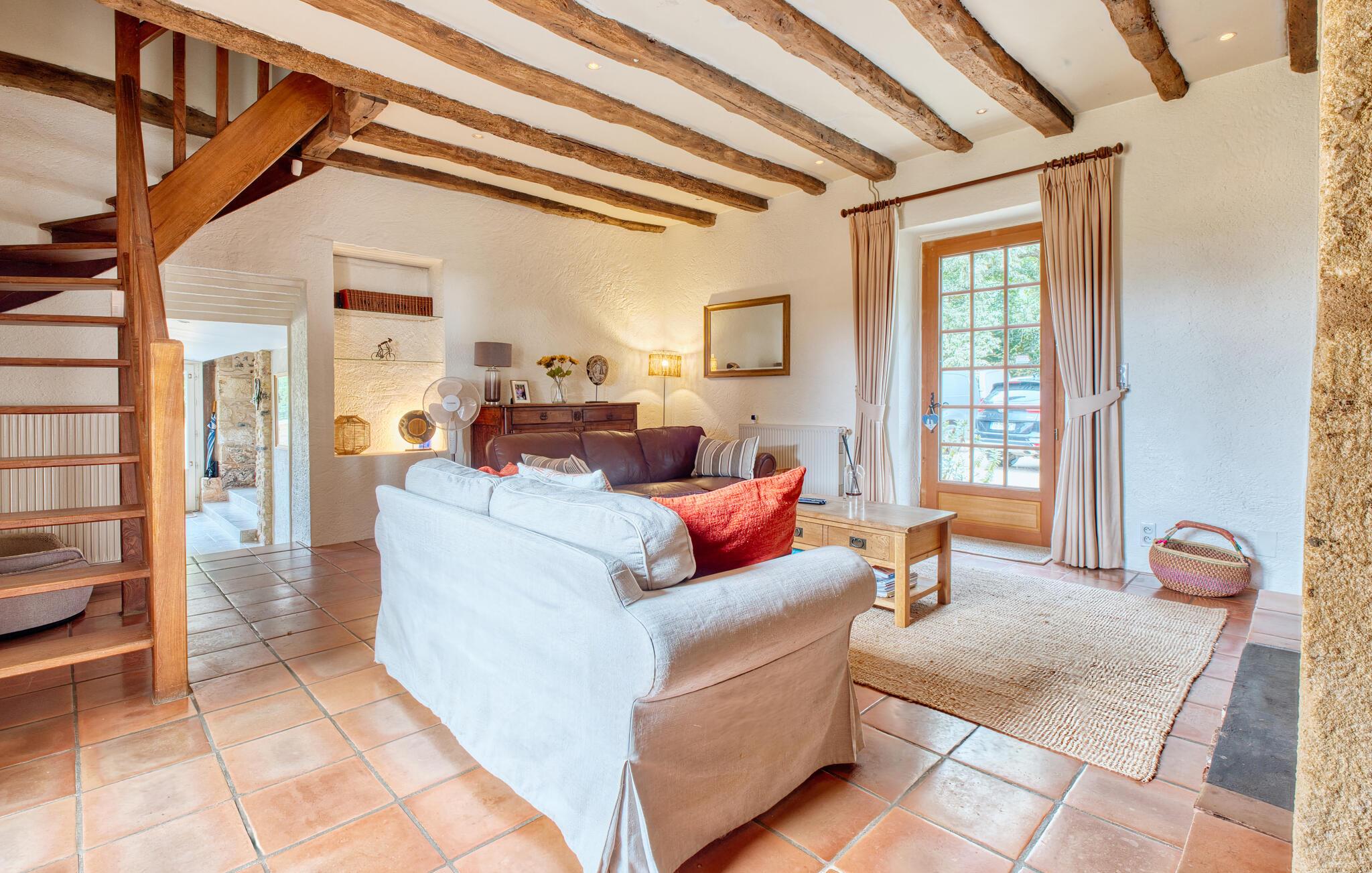 Dette komfortable landsted lægger op til at tilbringe afslappende dage i sit lyse og smagfuldt møblerede interiør. Velholdte naturstensvægge, autentiske møbler og synlige træbjælker skaber en rustik hygge og udstråler historisk charme, som I kan nyde under hyggelige måltider, muntre madlavningsaftener og harmoniske spilleaftener.